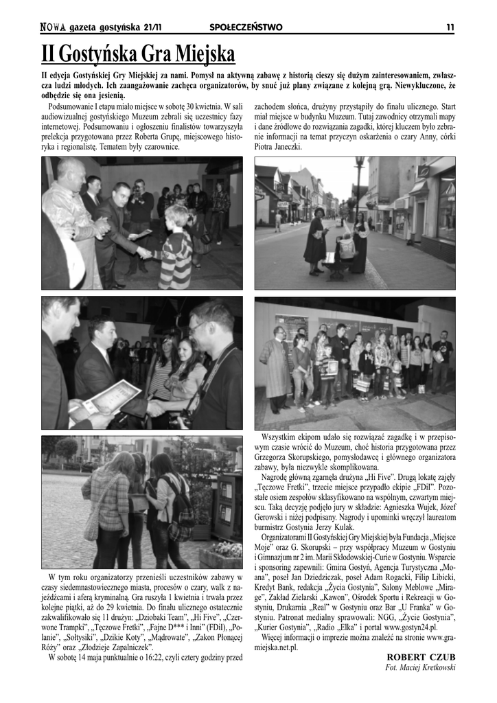 NOWA gazeta gostyñska 21/11 SPO£ECZEÑSTWO 11 II Gostyñska Gra Miejska II edycja Gostyñskiej Gry Miejskiej za nami. Pomys³ na aktywn¹ zabawê z histori¹ cieszy siê du¿ym zainteresowaniem, zw³aszcza ludzi m³odych. Ich zaanga¿owanie zachêca organizatorów, by snuæ ju¿ plany zwi¹zane z kolejn¹ gr¹. Niewykluczone, ¿e odbêdzie siê ona jesieni¹. Podsumowanie I etapu mia³o miejsce w sobotê 30 kwietnia. W sali zachodem s³oñca, dru¿yny przyst¹pi³y do fina³u ulicznego. Start audiowizualnej gostyñskiego Muzeum zebrali siê uczestnicy fazy mia³ miejsce w budynku Muzeum. Tutaj zawodnicy otrzymali mapy internetowej. Podsumowaniu i og³oszeniu finalistów towarzyszy³a i dane ród³owe do rozwi¹zania zagadki, której kluczem by³o zebraprelekcja przygotowana przez Roberta Grupê, miejscowego histo- nie informacji na temat przyczyn oskar¿enia o czary Anny, córki ryka i regionalistê. Tematem by³y czarownice. Piotra Janeczki. W tym roku organizatorzy przenieli uczestników zabawy w czasy siedemnastowiecznego miasta, procesów o czary, walk z najedcami i afer¹ kryminaln¹. Gra ruszy³a 1 kwietnia i trwa³a przez kolejne pi¹tki, a¿ do 29 kwietnia. Do fina³u ulicznego ostatecznie zakwalifikowa³o siê 11 dru¿yn: Dziobaki Team, Hi Five, Czerwone Trampki, Têczowe Fretki, Fajne D*** i Inni (FDiI), Polanie, So³tysiki, Dzikie Koty, M¹drowate, Zakon P³on¹cej Ró¿y oraz Z³odzieje Zapalniczek. W sobotê 14 maja punktualnie o 16:22, czyli cztery godziny przed Wszystkim ekipom uda³o siê rozwi¹zaæ zagadkê i w przepisowym czasie wróciæ do Muzeum, choæ historia przygotowana przez Grzegorza Skorupskiego, pomys³odawcê i g³ównego organizatora zabawy, by³a niezwykle skomplikowana. Nagrodê g³ówn¹ zgarnê³a dru¿yna Hi Five. Drug¹ lokatê zajê³y Têczowe Fretki, trzecie miejsce przypad³o ekipie FDiI. Pozosta³e osiem zespo³ów sklasyfikowano na wspólnym, czwartym miejscu. Tak¹ decyzjê podjê³o jury w sk³adzie: Agnieszka Wujek, Józef Gerowski i ni¿ej podpisany. Nagrody i upominki wrêczy³ laureatom burmistrz Gostynia Jerzy Kulak. Organizatorami II Gostyñskiej Gry Miejskiej by³a Fundacja Miejsce Moje oraz G. Skorupski przy wspó³pracy Muzeum w Gostyniu i Gimnazjum nr 2 im. Marii Sk³odowskiej-Curie w Gostyniu. Wsparcie i sponsoring zapewnili: Gmina Gostyñ, Agencja Turystyczna Moana, pose³ Jan Dziedziczak, pose³ Adam Rogacki, Filip Libicki, Kredyt Bank, redakcja ¯ycia Gostynia, Salony Meblowe Mirage, Zak³ad Zielarski Kawon, Orodek Sportu i Rekreacji w Gostyniu, Drukarnia Real w Gostyniu oraz Bar U Franka w Gostyniu. Patronat medialny sprawowali: NGG, ¯ycie Gostynia, Kurier Gostynia, Radio Elka i portal www.gostyn24.pl. Wiêcej informacji o imprezie mo¿na znaleæ na stronie www.gramiejska.net.pl. ROBERT CZUB Fot. Maciej Kretkowski