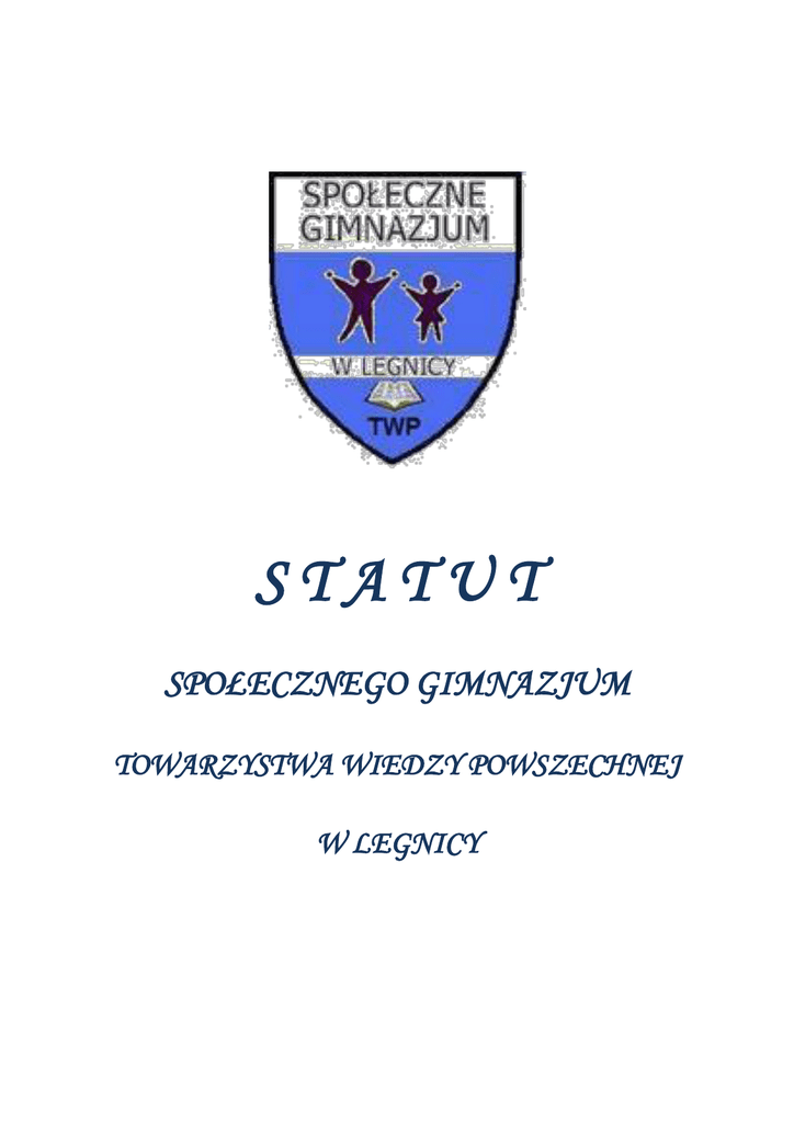 STATUT SPOŁECZNEGO GIMNAZJUM TOWARZYSTWA WIEDZY POWSZECHNEJ W LEGNICY SPIS TREŚCI Rozdział 1. Postanowienia ogólne ....................................................................... s. 3. Rozdział 2. Zadania Szkoły ................................................................................. s. 4. Rozdział 3. Organy Szkoły oraz zakres ich zadań ……………………..…..… s. 5. Rozdział 4. Organizacja pracy Szkoły ……………………………………...…. s. 9. Rozdział 5. Prawa i obowiązki pracowników …………………………………. s.11. Rozdział 6. Prawa i obowiązki uczniów …………………………………...….. s. 14. Rozdział 7. Zasady, warunki i sposób oceniania uczniów Szkoły .................... s. 18. Rozdział 8. Sposób uzyskiwania środków finansowych na działalność Szkoły s. 32. Rozdział 9. Zasady przyjmowania uczniów do Szkoły ...................................... s. 32. Rozdział 10. Prawa i obowiązki rodziców …………………………………....... s. 34. Rozdział 11. Postanowienia końcowe …………………………………............. s. 34. 2|Strona Rozdział 1 Postanowienia ogólne § 1. 1. Szkoła nosi nazwę: Społeczne Gimnazjum Towarzystwa Wiedzy Powszechnej w Legnicy. 2. Społeczne Gimnazjum Towarzystwa Wiedzy Powszechnej w Legnicy, zwane dalej Szkołą, jest szkołą niepubliczną o uprawnieniach szkoły publicznej. 3. Osobą prowadzącą Szkołę jest Towarzystwo Wiedzy Powszechnej Oddział Regionalny w Legnicy, zarejestrowane w Sądzie Rejestrowym we Wrocławiu dnia 13.10.2005 r. pod nr 0000243365 IX Wydział Gospodarczy KRS. 4. Podstawowymi aktami prawnymi regulującymi działalność Szkoły są: 1) ustawa z dnia 7 września 1991r. o systemie oświaty; 2) Statut Społecznego Gimnazjum Towarzystwa Wiedzy Powszechnej w Legnicy; 3) regulaminy wewnętrzne. 5. Nadzór pedagogiczny nad Szkołą sprawuje Dolnośląski Kurator Oświaty. 6. Szkoła ma siedzibę w Legnicy w budynku przy Placu Klasztornym 7, użyczonym na zasadzie najmu przez I Liceum Ogólnokształcące w Legnicy. 7. Nazwa Szkoły używana jest w pełnym brzmieniu: Społeczne Gimnazjum Towarzystwa Wiedzy Powszechnej w Legnicy 8. Na pieczęciach i stemplach może być używany skrót nazwy: Społeczne Gimnazjum TWP w Legnicy. § 2. 1. Organ prowadzący Szkołę, o którym mowa w § 1 ust.3, odpowiada za jej działalność. 2. Do zadań organu prowadzącego Szkołę należy: 1) zapewnienie warunków działania Szkoły, w tym bezpiecznych i higienicznych warunków nauki, wychowania i opieki; 2) wyposażenie Szkoły w pomoce dydaktyczne i sprzęt niezbędny do pełnej realizacji programów nauczania, programu wychowawczego, przeprowadzania egzaminu gimnazjalnego oraz wykonywania innych zadań statutowych. 3. Do kompetencji organu prowadzącego Szkołę należy w szczególności: 1) nadzór nad działalnością Szkoły w zakresie: a) spraw finansowych i administracyjnych, b) przestrzegania obowiązujących przepisów dotyczących bezpieczeństwa i higieny pracy pracowników i uczniów; c) przestrzegania przepisów dotyczących organizacji pracy Szkoły; 2) decydowanie o podstawowych rozwiązaniach programowych, metodycznych i organizacyjnych, wyrażających specyfikę i gwarantujących praktyczną realizację statutowych zadań Szkoły, w tym: a) dysponowanie środkami finansowymi i mieniem Szkoły; b) zatrudnianie i zwalnianie Dyrektora Szkoły i innych pracowników Szkoły; c) zawieranie umów o kształcenie uczniów; d) decydowanie o wysokości odpłatności za naukę; e) rozpatrywanie odwołań od decyzji Dyrektora Szkoły w sprawach uczniowskich i pracowniczych; 3) uczestnictwo w zebraniach Rady Pedagogicznej, zebraniach innych organów Szkoły oraz uroczystościach szkolnych; 4) reprezentowanie Szkoły na zewnątrz; 3|Strona 5) nadawanie Szkole statutu oraz dokonywanie jego zmiany. § 3. 1. Społeczne Gimnazjum Towarzystwa Wiedzy Powszechnej w Legnicy realizuje: 1) programy nauczania uwzględniające podstawę programową kształcenia ogólnego dla gimnazjów, o której mowa w odrębnych przepisach; 2) zajęcia edukacyjne w cyklu nie krótszym oraz w wymiarze nie niższym niż łączny wymiar obowiązkowych zajęć edukacyjnych określonym w ramowym planie nauczania publicznego gimnazjum; 3) stosuje ustalone przez ministra właściwego do spraw oświaty zasady klasyfikowania i promowania uczniów oraz przeprowadzania egzaminu gimnazjalnego; 4) prowadzi dokumentację przebiegu nauczania ustaloną dla publicznego gimnazjum; 5) zatrudnia nauczycieli obowiązkowych zajęć edukacyjnych, o których mowa w pkt 2, posiadających kwalifikacje określone dla nauczycieli szkół publicznych. 2. Cykl kształcenia w Szkole trwa trzy lata. 3. Szkoła umożliwia zdobycie wiedzy i umiejętności niezbędnych do uzyskania świadectwa ukończenia gimnazjum oraz dalszego kształcenia w szkołach ponadgimnazjalnych. 4. Egzamin gimnazjalny przeprowadza się w Szkole w ostatnim roku nauki. Rozdział 2 Zadania Szkoły § 4. 1. Szkoła zapewnia uczniom możliwość pełnego rozwoju intelektualnego, moralnoemocjonalnego i psychofizycznego, z poszanowaniem ich godności osobistej oraz wolności światopoglądowej i wyznaniowej. 2. Działalność dydaktyczno-wychowawcza i opiekuńcza Szkoły prowadzona jest w oparciu o zasady pedagogiki, przepisy prawa oraz idee zawarte w Konwencji o Ochronie Praw Człowieka i Podstawowych Wolności oraz Konwencji o Prawach Dziecka. 3. W celu zapewnienia uczniom i rodzicom (opiekunom prawnym) odpowiedniej pomocy psychologiczno-pedagogicznej, Szkoła współpracuje z poradniami i innymi instytucjami działającymi na rzecz dziecka i rodziny. 4. Szczegółowe zadania Szkoły określa szkolny program dydaktyczny i wychowawczy. § 5. 1. Środowisko wychowawcze Szkoły tworzą uczniowie i pracownicy Szkoły oraz rodzice (prawni opiekunowie) uczniów. 2. W realizacji swoich zadań Szkoła współpracuje ze środ
