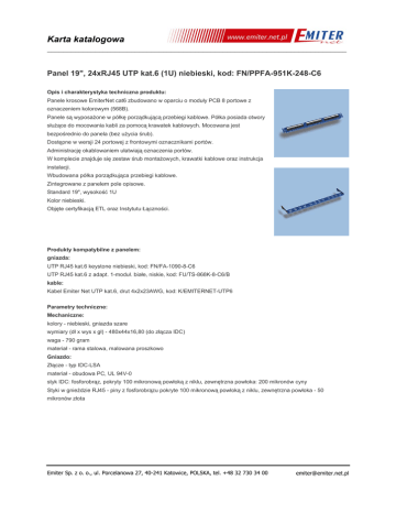 Karta katalogowa ___________________________________________________________________________ Panel 19", 24xRJ45 UTP kat.6 (1U) niebieski, kod: FN/PPFA-951K-248-C6 Opis i charakterystyka techniczna produktu: Panele krosowe EmiterNet cat6 zbudowano w oparciu o moduły PCB 8 portowe z oznaczeniem kolorowym (568B). Panele są wyposażone w półkę porządkującą przebiegi kablowe. Półka posiada otwory służące do mocowania kabli za pomocą krawatek kablowych. Mocowana jest bezpośrednio do panela (bez użycia śrub). Dostępne w wersji 24 portowej z frontowymi oznacznikami portów. Administrację okablowaniem ułatwiają oznaczenia portów. W komplecie znajduje się zestaw śrub montażowych, krawatki kablowe oraz instrukcja instalacji. Wbudowana półka porządkująca przebiegi kablowe. Zintegrowane z panelem pole opisowe. Standard 19", wysokość 1U Kolor niebieski. Objęte certyfikacją ETL oraz Instytutu Łączności. Produkty kompatybilne z panelem: gniazda: UTP RJ45 kat.6 keystone niebieski, kod: FN/FA-1090-8-C6 UTP RJ45 kat.6 z adapt. 1-moduł. białe, niskie, kod: FU/TS-868K-8-C6/B kable: Kabel Emiter Net UTP kat.6, drut 4x2x23AWG, kod: K/EMITERNET-UTP6 Parametry techniczne: Mechaniczne: kolory - niebieski, gniazda szare wymiary (dł x wys x gł) - 480x44x16,80 (do złącza IDC) waga - 790 gram materiał - rama stalowa, malowana proszkowo Gniazdo: Złącze - typ IDC-LSA materiał - obudowa PC, UL 94V-0 styk IDC: fosforobrąz, pokryty 100 mikronową powłoką z niklu, zewnętrzna powłoka: 200 mikronów cyny Styki w gnieździe RJ45 - piny z fosforobrązu pokryte 100 mikronową powłoką z niklu, zewnętrzna powłoka - 50 mikronów złota Emiter Sp. z o. o., ul. Porcelanowa 27, 40-241 Katowice, POLSKA, tel. +48 32 730 34 00 [email protected] Karta katalogowa ___________________________________________________________________________ Parametry mechaniczne: Gniazdo RJ45 - 750 cykli wpięcia Złącze IDC - 200 cykli łączenia Rozmiar kabla 24 do 26 AWG Temperatura pracy: -10'C do +68'C Wilgotność - 10 do 90% Parametry elektryczne: Maksymalna wartość prądu 1,5 A Napięcie maksymalne 150 V Maksymalna rezystancja kontaktu 20 mΩ Minimalna rezystancja izolacji 500 MΩ Parametry transmisyjne: Parametry transmisyjne zgodne z normą PN-EN 50173; EIA/TIA 568B; ISO/IEC 11801 2nd ed.; IEC 61156-6; EN 50288-4-2 Certyfikaty: Instytut Łączności Potwierdzenie zgodności nr 319/2003 z normami: PN/EN 50173:1999; ISO/IEC 11801 Emiter Sp. z o. o., ul. Porcelanowa 27, 40-241 Katowice, POLSKA, tel. +48 32 730 34 00 [email protected]