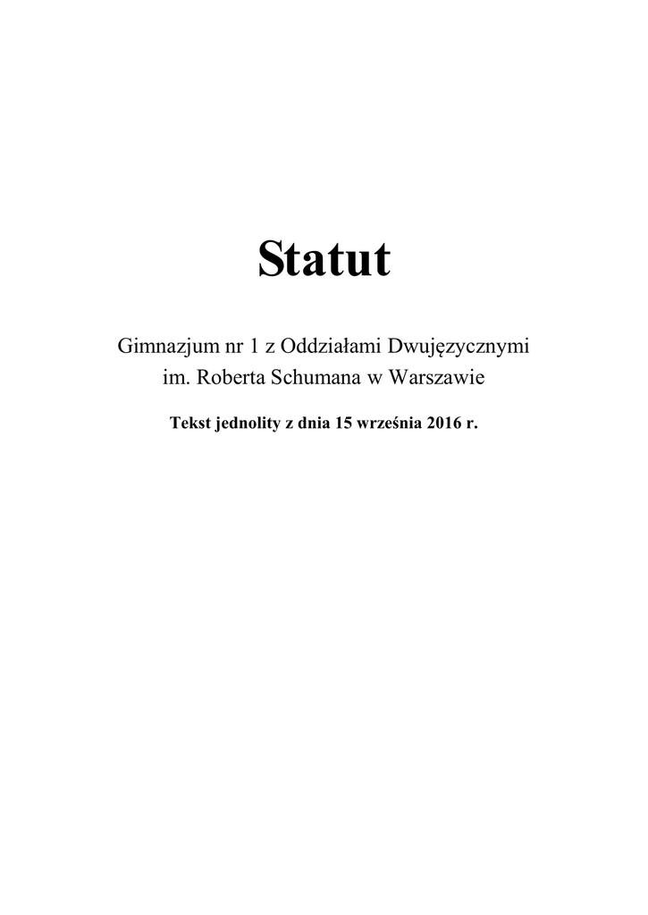 Statut Gimnazjum nr 1 z Oddziałami Dwujęzycznymi im. Roberta Schumana w Warszawie Tekst jednolity z dnia 15 września 2016 r. Podstawy prawne do Statutu 1. Ustawa z dnia 7 września 1991 r. o systemie oświaty (t. j. Dz. U. z 2004 r. Nr 256, poz. 2572, z późn. zm.). 2. Ustawa z dnia 06 grudnia 2013 r. o zmianie ustawy o systemie oświaty oraz niektórych innych ustaw (Dz. U. z 2014 r. poz. 7 z późn. zm). 3. Rozporządzenie Prezesa Rady ministrów z dnia 20 czerwca 2002 r. w sprawie Zasad techniki prawodawczej (Dz. U. z 2002 r. Nr 100, poz. 908). 4. Rozporządzenie Ministra Edukacji Narodowej z dnia 21 maja 2001 r. w sprawie ramowych statutów publicznego przedszkola oraz publicznych szkół (Dz. U. z 2001 r. Nr 61, poz. 624 z późn. zm). 5. Rozporządzenie Ministra Edukacji Narodowej z dnia 10 czerwca 2015 r. w sprawie szczegółowych warunków i sposobu oceniania, klasyfikowania i promowania uczniów i słuchaczy w szkołach publicznych (Dz. U. z 2015 r. poz. 843). 6. Rozporządzenie Ministra Edukacji Narodowej z dnia 25 czerwca 2015 r. w sprawie szczegółowych warunków i sposobu przeprowadzania sprawdzianu, egzaminu gimnazjalnego i egzaminu maturalnego ( Dz. U. z 2015 r. poz. 959). 7. Rozporządzenie Ministra Edukacji Narodowej z dnia 30 kwietnia 2013 r. w sprawie zasad udzielania i organizacji pomocy psychologiczno- pedagogicznej w publicznych przedszkolach, szkołach i placówkach (Dz. U. z 2013, poz. 532). 8. Rozporządzenie Ministra Edukacji Narodowej z dnia 14 kwietnia 1992 roku w sprawie warunków i sposobu organizowania nauki religii w publicznych przedszkolach i szkołach (Dz. U. z 1992 r. nr. 36, poz. 155). 9. Konwencja o prawach dziecka przyjęta przez Zgromadzenie Ogólne Narodów Zjednoczonych z dnia 20 listopada 1989 r. (Dz. U. z 1991 Nr 120, poz. 526 z późn. zm.). 10. Ustawa z dnia 26 stycznia 1982 r. Karta Nauczyciela (t. j. Dz. U. z 2014 r. poz. 191 z późn. zm.). 11. Rozporządzenie Ministra Edukacji Narodowej z dnia 24 lipca 2015 roku w sprawie warunków organizowania, wychowania i opieki dla dzieci i młodzieży niepełnosprawnych, niedostosowanych społecznie i zagrożonych niedostosowaniem społecznym ( Dz. U. z 2015r. poz. 1113). 12. Rozporządzenie Ministra Edukacji Narodowej z dnia 13 sierpnia 2015 roku w sprawie szczegółowych warunków przechodzenia ucznia ze szkoły publicznej lub szkoły niepublicznej o uprawnieniach szkoły publicznej jednego typu do szkoły publicznej innego typu albo szkoły publicznej tego samego typu. 13. Rozporządzenie Ministra Edukacji Narodowej z dnia 9 września 2016 r. w sprawie kształcenia osób niebędących obywatelami polskimi oraz osób będących obywatelami polskimi, które pobierały naukę w szkołach funkcjonujących w systemie oświaty innych państw ( Dz. U. z 2015 r. poz. 2156 oraz z 2016 r. poz. 35, 64, 195, 668 i 1010). 14. Rozporządzenie Ministra Edukacji Narodowej z dnia 06 sierpnia 2015 roku w sprawie wymagań wobec szkół i placówek. 15. Rozporządzenie Ministra Edukacji Narodowej z dnia 29 sierpnia 2014 roku w sprawie sposobu prowadzenia przez publiczne przedszkola, szkoły i placówki dokumentacji przebiegu nauczania, działalności wychowawczej i opiekuńczej oraz rodzajów tej dokumentacji (Dz. U. z 2014 r. poz. 1170). 2 §1 Postanowienia ogólne 1. Gimnazjum nr 1 z Oddziałami Dwujęzycznymi im. Roberta Schumana w Dzielnicy Mokotów, zwane dalej „gimnazjum”, jest szkołą publiczną. 2. Oznaczenie siedziby gimnazjum: 02-615 Warszawa, ul. Tyniecka 25. 3. Organem prowadzącym gimnazjum jest Miasto Stołeczne Warszawa. 4. Gimnazjum działa na mocy ustawy z dnia 07 września 1991 r. o systemie oświaty (Dz. U. z 2004 r. Nr 256, poz.2572 z późn. zm.), uchwały nr 39/V/99 Gminy WarszawaCentrum z dnia 25 lutego 1999 r. w sprawie założenia gimnazjów, ustalenia planu ich sieci oraz granic ich obwodów oraz niniejszego Statutu. 5. Cykl kształcenia w gimnazjum trwa 3 lata i kończy się w ostatnim roku nauki egzaminem zewnętrznym, dającym możliwość dalszego kształcenia w szkołach ponadgimnazjalnych. Dyrektor Okręgowej Komisji Egzaminacyjnej może zwolnić ucznia z przystępowania do egzaminu zewnętrznego w przypadku złożenia do Dyrektora szkoły przez rodziców ucznia podania wraz z załączonym zaświadczeniem lekarskim. 6. Gimnazjum zapewnia bezpłatne nauczanie w zakresie ramowych planów nauczania uwzględniających podstawę programową kształcenia ogólnego. 7. Gimnazjum jest jednostką budżetową. Szczegółowe zasady gospodarki finansowej regulują odrębne przepisy. 8. Nadzór pedagogiczny sprawuje nad szkołą Mazowiecki Kurator Oświaty. §2 Cele i zadania gimnazjum Funkcjonowanie gimnazjum 1. Statut gimnazjum określa, co następuje: 1) Szkoła realizuje cele i zadania wynikające z przepisów prawa oraz z Programu Wychowawczego szkoły i Programu Profilaktyki dostosowanego do potrzeb rozwojowych uczniów oraz potrzeb środowiska, a w szczególności: a) umożliwia zdobycie wiedzy i umiejętności niezbędnych do uzyskania świadectwa ukończenia gimnazjum, b) realizuje programy nauczania, które zawierają podstawę programową kształcenia ogólnego dla poszczególnych przedmiotów, objętych ramowym planem nauczania, c) przygotowuje uczniów do świadomego wyboru dalszego kierunku kształcenia, d) kształtuje środowisko wychowawcze sprzyjające realizowaniu celów i zasad określonych w ustawie oraz wychowawczym i profilaktycznym programie szkoły, stosownie do warunków szkoły i wieku uczniów, 3 e) sprawuje opiekę nad uczniami odpowiednio do ich intelektualnych potrzeb oraz możliwości szkoły, f) rozwija u uczniów poczucie odpowiedzialności i miłości do Ojczyzny oraz poszanowania dla polskiego dziedzictwa kulturowego, g) kształci i wychowuje w duchu tolerancji, humanizmu i patriotyzmu, h) przygotowuje ucznia do pełnego i świadomego uczestnictwa w szybko zmieniającym się świecie, i) kształtuje postawy dbałości o środowisko naturalne, j) upowsze