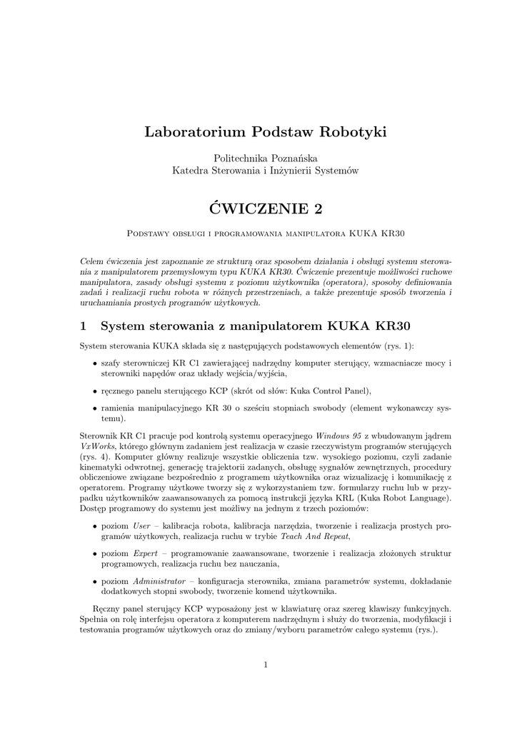 Celem ćwiczenia jest zapoznanie ze strukturą oraz sposobem działania i obsługi systemu sterowania z manipulatorem przemysłowym typu KUKA KR30. Ćwiczenie prezentuje możliwości ruchowe