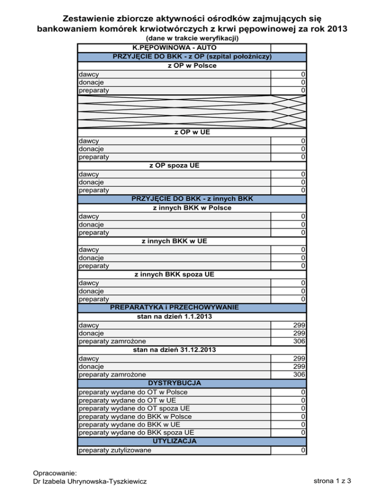 Zestawienie zbiorcze aktywności ośrodków zajmujących się bankowaniem komórek krwiotwórczych z krwi pępowinowej za rok 2013 (dane w trakcie weryfikacji) K.PĘPOWINOWA - AUTO PRZYJĘCIE DO BKK - z OP (szpital położniczy) z OP w Polsce dawcy donacje preparaty 0 0 0 z OP w UE dawcy donacje preparaty 0 0 0 z OP spoza UE dawcy donacje preparaty 0 0 0 PRZYJĘCIE DO BKK - z innych BKK z innych BKK w Polsce dawcy donacje preparaty 0 0 0 z innych BKK w UE dawcy donacje preparaty 0 0 0 z innych BKK spoza UE dawcy donacje preparaty 0 0 0 PREPARATYKA i PRZECHOWYWANIE stan na dzień 1.1.2013 dawcy donacje preparaty zamrożone stan na dzień 31.12.2013 dawcy donacje preparaty zamrożone DYSTRYBUCJA preparaty wydane do OT w Polsce preparaty wydane do OT w UE preparaty wydane do OT spoza UE preparaty wydane do BKK w Polsce preparaty wydane do BKK w UE preparaty wydane do BKK spoza UE UTYLIZACJA preparaty zutylizowane Opracowanie: Dr Izabela Uhrynowska-Tyszkiewicz 299 299 306 299 299 306 0 0 0 0 0 0 0 strona 1 z 3 Zestawienie zbiorcze aktywności ośrodków zajmujących się bankowaniem komórek krwiotwórczych z krwi pępowinowej za rok 2013 (dane w trakcie weryfikacji) K.PĘPOWINOWA - ALLOspokr PRZYJĘCIE DO BKK - z OP (szpital położniczy) z OP w Polsce dawcy donacje preparaty 5 5 6 z OP w UE dawcy donacje preparaty 0 0 0 z OP spoza UE dawcy donacje preparaty 0 0 0 PRZYJĘCIE DO BKK - z innych BKK z innych BKK w Polsce dawcy donacje preparaty 1 1 1 z innych BKK w UE dawcy donacje preparaty 0 0 0 z innych BKK spoza UE dawcy donacje preparaty 0 0 0 PREPARATYKA i PRZECHOWYWANIE stan na dzień 1.1.2013 dawcy donacje preparaty zamrożone stan na dzień 31.12.2013 dawcy donacje preparaty zamrożone DYSTRYBUCJA preparaty wydane do OT w Polsce preparaty wydane do OT w UE preparaty wydane do OT spoza UE preparaty wydane do BKK w Polsce preparaty wydane do BKK w UE preparaty wydane do BKK spoza UE UTYLIZACJA preparaty zutylizowane Opracowanie: Dr Izabela Uhrynowska-Tyszkiewicz 114 114 121 118 118 126 2 0 0 0 0 0 0 strona 2 z 3 Zestawienie zbiorcze aktywności ośrodków zajmujących się bankowaniem komórek krwiotwórczych z krwi pępowinowej za rok 2013 (dane w trakcie weryfikacji) K. PĘPOWINOWA - ALLOniespokr PRZYJĘCIE DO BKK - z OP (szpital położniczy) z OP w Polsce w ramach NPRMT dawcy donacje preparaty 1944 1944 666 z OP w Polsce poza NPMRT dawcy donacje preparaty 107 107 36 z OP w UE dawcy donacje preparaty 0 0 0 z OP spoza UE dawcy donacje preparaty 0 0 0 PRZYJĘCIE DO BKK - z innych BKK z innych BKK w Polsce dawcy donacje preparaty 1 1 1 z innych BKK w UE dawcy donacje preparaty 0 0 0 z innych BKK spoza UE dawcy donacje preparaty 1726 1726 1726 PREPARATYKA i PRZECHOWYWANIE stan na dzień 1.1.2013 dawcy donacje preparaty zamrożone 1508 1451 1204 stan na dzień 31.12.2013 dawcy donacje preparaty zamrożone DYSTRYBUCJA preparaty wydane do OT w Polsce preparaty wydane do OT w UE preparaty wydane do OT spoza UE preparaty wydane do BKK w Polsce preparaty wydane do BKK w UE preparaty wydane do BKK spoza UE UTYLIZACJA preparaty zutylizowane Opracowanie: Dr Izabela Uhrynowska-Tyszkiewicz 3495 3438 3568 1 0 0 0 0 0 0 strona 3 z 3