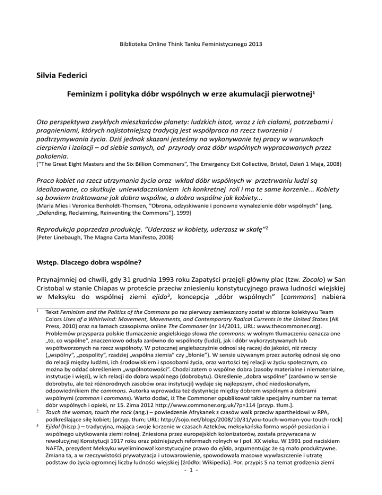 Biblioteka Online Think Tanku Feministycznego 2013 Silvia Federici Feminizm i polityka dóbr wspólnych w erze akumulacji pierwotnej1 Oto perspektywa zwykłych mieszkańców planety: ludzkich istot, wraz z ich ciałami, potrzebami i pragnieniami, których najistotniejszą tradycją jest współpraca na rzecz tworzenia i podtrzymywania życia. Dziś jednak skazani jesteśmy na wykonywanie tej pracy w warunkach cierpienia i izolacji – od siebie samych, od przyrody oraz dóbr wspólnych wypracowanych przez pokolenia. (“The Great Eight Masters and the Six Billion Commoners”, The Emergency Exit Collective, Bristol, Dzień 1 Maja, 2008) Praca kobiet na rzecz utrzymania życia oraz wkład dóbr wspólnych w przetrwaniu ludzi są idealizowane, co skutkuje uniewidacznianiem ich konkretnej roli i ma te same korzenie... Kobiety są bowiem traktowane jak dobra wspólne, a dobra wspólne jak kobiety... (Maria Mies i Veronica Benholdt-Thomsen, "Obrona, odzyskiwanie i ponowne wynalezienie dóbr wspólnych” [ang. „Defending, Reclaiming, Reinventing the Commons”], 1999) Reprodukcja poprzedza produkcję. “Uderzasz w kobiety, uderzasz w skałę”2 (Peter Linebaugh, The Magna Carta Manifesto, 2008) Wstęp. Dlaczego dobra wspólne? Przynajmniej od chwili, gdy 31 grudnia 1993 roku Zapatyści przejęli główny plac (tzw. Zocalo) w San Cristobal w stanie Chiapas w proteście przeciw zniesieniu konstytucyjnego prawa ludności wiejskiej w Meksyku do wspólnej ziemi ejido3, koncepcja „dóbr wspólnych” [commons] nabiera 1 2 3 Tekst Feminism and the Politics of the Commons po raz pierwszy zamieszczony został w zbiorze kolektywu Team Colors Uses of a Whirlwind: Movement, Movements, and Contemporary Radical Currents in the United States (AK Press, 2010) oraz na łamach czasopisma online The Commoner (nr 14/2011, URL: www.thecommoner.org). Problemów przysparza polskie tłumaczenie angielskiego słowa the commons: w wolnym tłumaczeniu oznacza one „to, co wspólne”, znaczeniowo odsyła zarówno do wspólnoty (ludzi), jak i dóbr wykorzystywanych lub współtworzonych na rzecz wspólnoty. W potocznej angielszczyźnie odnosi się raczej do jakości, niż rzeczy („wspólny”, „pospolity”, rzadziej „wspólna ziemia” czy „błonie”). W sensie używanym przez autorkę odnosi się ono do relacji między ludźmi, ich środowiskiem i sposobami życia, oraz wartości tej relacji w życiu społecznym, co można by oddać określeniem „wspólnotowości”. Chodzi zatem o wspólne dobra (zasoby materialne i niematerialne, instytucje i więzi), w ich relacji do dobra wspólnego (dobrobytu). Określenie „dobra wspólne” (zarówno w sensie dobrobytu, ale też różnorodnych zasobów oraz instytucji) wydaje się najlepszym, choć niedoskonałym, odpowiednikiem the commons. Autorka wprowadza też dystynkcje między dobrem wspólnym a dobrami wspólnymi (common i commons). Warto dodać, iż The Commoner opublikował także specjalny number na temat dóbr wspólnych i opieki, nr 15. Zima 2012 http://www.commoner.org.uk/?p=114 [przyp. tłum.]. Touch the woman, touch the rock (ang.) – powiedzenie Afrykanek z czasów walk przeciw apartheidowi w RPA, podkreślające siłę kobiet; [przyp. tłum; URL: http://sojo.net/blogs/2008/10/31/you-touch-woman-you-touch-rock] Ejidal (hiszp.) – tradycyjna, mająca swoje korzenie w czasach Azteków, meksykańska forma współ-posiadania i wspólnego użytkowania ziemi rolnej. Zniesiona przez europejskich kolonizatorów, została przywracana w rewolucyjnej Konstytucji 1917 roku oraz późniejszych reformach rolnych w I poł. XX wieku. W 1991 pod naciskiem NAFTA, prezydent Meksyku wyeliminował konstytucyjne prawo do ejido, argumentując że są mało produktywne. Zmiana ta, a w rzeczywistości prywatyzacja i utowarowienie, spowodowała masowe wywłaszczenie i utratę podstaw do życia ogromnej liczby ludności wiejskiej [źródło: Wikipedia]. Por. przypis 5 na temat grodzenia ziemi - 1 - Biblioteka Online Think Tanku Feministycznego 2013 popularności w środowiskach radykalnej lewicy na świecie, stając się miejscem zbieżności ruchów anarchistycznych, marksowskich / socjalistycznych, ekologicznych i eko-feministycznych 4. Jest wiele powodów dla których ta – wydawałoby się – archaiczna idea znalazła się w centrum politycznych dyskusji współczesnych ruchów społecznych. Dwa z nich są szczególnie istotne. Z jednej strony był to upadek państwowego modelu rewolucji, który przez dekady wyczerpywał energie ruchów radykalnych w tworzeniu alternatyw wobec kapitalizmu. Z drugiej, neoliberalne próby podporządkowania wszelkich form życia i wiedzy logice rynków unaoczniły nam zagrożenie życia w świecie, w którym nie będziemy mieli dostępu do mórz, lasów, zwierząt i bliskich nam istot, w żaden inny sposób niż poprzez wymianę pieniężną. „Nowa runda grodzeń” 5 uwidoczniła nam nie tylko świat własności komunalnej czy publicznej, ale też relacje, które traktowaliśmy jako wymarłe, bądź nieistotne zanim zostały zagrożone przez prywatyzacje 6. Koncepcja nowych grodzeń pozwoliła zobaczyć, że jest przeciwnie: dobra wspólne nadal istnieją, a ich nowe formy są cały czas tworzone, nawet tam gdzie wcześniej nie istniały, na przykład w Internecie. W takim kontekście idea dóbr/dobra wspólnego wniosła logiczną i historyczną alternatywę, zarówno dla opozycji własność prywatna – publiczna, jak i dla podziału Państwo – Rynek. Pozwoliła nam więc odrzucić fikcję, że oba człony tej opozycji wykluczają się nawzajem oraz to, że opozycja ta wyczerpuje nasze polityczne możliwości. Ponadto, koncepcja dobra wspólnego ideologicznie jednoczyła ruch radykalnej lewicy wokół prefiguracji wspólnotowego i kooperatywnego społeczeństwa, które ruch ten stara się tworzyć. Nie mniej jednak wieloznaczność i duże różnice w interpretacji pojęcia dobra wspólnego wymagają wyjaśnień, jeśli chce