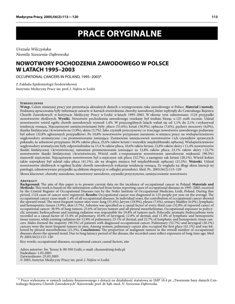 Medycyna Pracy, 2005;56(2):113 — 120 113 PRACE ORYGINALNE Urszula Wilczyńska Neonila Szeszenia-Dąbrowska NOWOTWORY POCHODZENIA ZAWODOWEGO W POLSCE W LATACH 1995–2003 OCCUPATIONAL CANCERS IN POLAND, 1995–2003* Z Zakładu Epidemiologii Środowiskowej Instytutu Medycyny Pracy im. prof. J. Nofera w Łodzi Streszczenie Wstęp. Celem niniejszej pracy jest prezentacja aktualnych danych o występowaniu raka zawodowego w Polsce. Materiał i metody. Podstawą opracowania były informacje zawarte w kartach stwierdzenia choroby zawodowej, które wpłynęły do Centralnego Rejestru Chorób Zawodowych w Instytucie Medycyny Pracy w Łodzi w latach 1995–2003. W okresie tym odnotowano 1124 przypadki nowotworów złośliwych. Wyniki. Nowotwór pochodzenia zawodowego orzekany był średnio biorąc u 125 osób rocznie. Udział nowotworów wśród ogółu chorób zawodowych wynosił 1,4%. W poszczególnych latach wahał się od 1,1% do 2,1% i wykazywał tendencję rosnącą. Najczęstszymi umiejscowieniami były: płuco (51,6%), krtań (18,9%), opłucna (7,6%), pęcherz moczowy (6,0%), tkanka limfatyczna i krwiotwórcza (3,9%), skóra (3,7%). Jako czynnik przyczynowy co trzeciego nowotworu zawodowego podawany był azbest (32,8% zgłoszonych przypadków). Po 10,8% nowotworów przypisano narażeniu w miejscu pracy na wielopierścieniowe węglowodory aromatyczne i na promieniowanie jonizujące. Zestawienie umiejscowień nowotworów i ich czynników sprawczych pokazało, że azbestowi przypisano 38,9% raków płuca, 25,6% raków krtani i wszystkie międzybłoniaki opłucnej. Wielopierścieniowe węglowodory aromatyczne były odpowiedzialne za 15,4 % raków płuca, 10,6% raków krtani, 12,8% raków skóry i 11,4% nowotworów tkanki limfatycznej i krwiotwórczej, natomiast promieniowanie jonizujące za 12,8% raków płuca, 23,1% raków skóry i 22,7% nowotworów tkanki limfatycznej i krwiotwórczej. Wśród osób z rozpoznanym nowotworem zawodowym większość (90,5%) stanowili mężczyźni. Najczęstszym nowotworem był u mężczyzn rak płuca (52,7%), a następnie rak krtani (20,1%). Wśród kobiet także największy był udział raka płuca (41,1%), ale na drugim miejscu był międzybłoniak opłucnej (21,5%). Wnioski. Udział nowotworów złośliwych w ogólnej liczbie chorób zawodowych wykazuje tendencję rosnącą. Ze względu na długi okres latencji tej patologii, odnotowywane przypadki są efektem ekspozycji w odległej przeszłości. Med. Pr., 2005;56(2):113–120 Słowa kluczowe: choroby zawodowe, nowotwory zawodowe, czynniki przyczynowe, umiejscowienie nowotworu Abstract Background: The aim of this paper is to present current data on the incidence of occupational cancer in Poland. Materials and Methods: This work is based on the information collected from forms reporting cases of occupational diseases in 1995–2003, received by the Central Register of Occupational Diseases run by the Nofer Institute of Occupational Medicine, Łódź, Poland. During that period, 1124 cases of cancer were registered. Results: Occupational cancer was diagnosed in 125 people per year on the average. The occupational cancer cases made 1.4% of all occupational diseases. In individual years, the contribution of occupational cancer showed the upward trend. The most frequent tumor sites were: lung (51.6%), larynx (18.9%), pleura (7.6%), urinary bladder (6.0%), lymphatic and hemopoietic tissues (3.9%), skin (3.7%). Asbestos was specified as a causal factor of every third case (32.8% of reported cases) of occupational cancer: 38.9% of lung tumors, 25.6% of larynx tumors and all pleural mesotheliomas. Occupational exposure to polycyclic aromatic hydrocarbons and ionising radiation was responsible for 10.8% of tumors each. Polycydic aromatic hydrocarbons were recorded as a causal factor of 15.4% of pulmonary, 10.6% of laryngeal, 12.8% of dermal, and 11.4% of lymphatic and hemopoietic tissue tumors, while ionising radiation for 12.8% of pulmonary, 23.1% of dermal, and 22.7% of lymphatic and hemopoietic tissue cancers. Males formed the majority (90.5%) of patients with diagnosed occupational cancer. Pulmonary (52.7%) and laryngeal (20.1%) cancers were the most frequent tumors in men. Among women, pulmonary cancer also occupied the first place (41.1%) and was followed by pleural mesothelioma (21,5%). Conclusions: The proportion of malignant tumors in the overall number of occupational diseases shows the upward trend. Due to long latency period of the disease, the recorded cases reflect exposures of long time ago. Med Pr 2005;56(2):113–120 Key words: occupational diseases, occupational cancer, causal factors, site Adres autorów: Św. Teresy 8, 90-950 Łódź, e-mail: [email protected] Nadesłano: 1.03.2005 Zatwierdzono: 25.03.2005 © 2005, Instytut Medycyny Pracy im. prof. J. Nofera w Łodzi * Praca wykonana w ramach zadania finansowanego z dotacji na działalność statutową nr IMP 10.4 pt. „Tworzenie bazy danych Centralnego Rejestru Chorób Zawodowych”. Kierownik: prof. dr hab. med. N. Szeszenia-Dąbrowska. 114 U. Wilczyńska, N. Szeszenia-Dąbrowska Nr 2 WSTĘP Rak zawodowy zajmuje szczególne miejsce w patologii wywołanej czynnikami środowiska pracy. Kancerogeny zawodowe zidentyfikowane zostały stosunkowo niedawno. Historia ich identyfikacji rozpoczęła się w latach 30. ubiegłego stulecia, kiedy to wykrycie w sadzach wielopierścieniowych węglowodorów aromatycznych dostarczyło pierwszego dowodu środowiskowej etiologii choroby nowotworowej, wyjaśniając zaobserwowany przez Percivalla Potta już w 1775 r. związek między występowaniem raka moszny a wykonywaniem zawodu kominiarza. Obecnie nie budzą już wątpliwości właściwości rakotwórcze takich substancji, jak np. benzydyna i jej sole, 2-naftyloamina, 4-nitrobifenyl, azbest, tlenki arsenu, benzen, policykliniczne węglowodory aromatyczne, chlorek winylu. Działanie kancerogenne wykazuje wiele substancji chemicznych stosowanych i powstających w