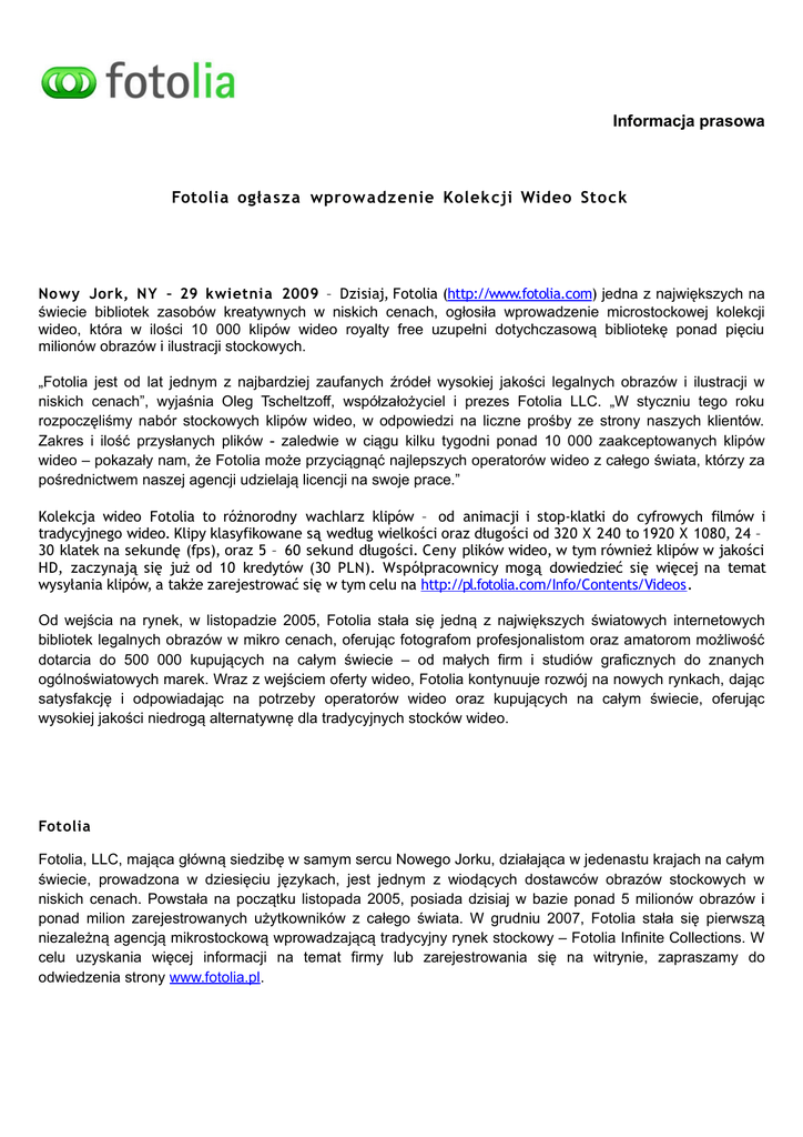 Informacja prasowa Fotolia ogła sza wprowadzenie Kolek cji Wideo Stock Nowy Jork, NY – 29 kwietnia 2009 – Dzisiaj, Fotolia (http://www.fotolia.com) jedna z największych na świecie bibliotek zasobów kreatywnych w niskich cenach, ogłosiła wprowadzenie microstockowej kolekcji wideo, która w ilości 10 000 klipów wideo royalty free uzupełni dotychczasową bibliotekę ponad pięciu milionów obrazów i ilustracji stockowych. „Fotolia jest od lat jednym z najbardziej zaufanych źródeł wysokiej jakości legalnych obrazów i ilustracji w niskich cenach”, wyjaśnia Oleg Tscheltzoff, współzałożyciel i prezes Fotolia LLC. „W styczniu tego roku rozpoczęliśmy nabór stockowych klipów wideo, w odpowiedzi na liczne prośby ze strony naszych klientów. Zakres i ilość przysłanych plików - zaledwie w ciągu kilku tygodni ponad 10 000 zaakceptowanych klipów wideo – pokazały nam, że Fotolia może przyciągnąć najlepszych operatorów wideo z całego świata, którzy za pośrednictwem naszej agencji udzielają licencji na swoje prace.” Kolekcja wideo Fotolia to różnorodny wachlarz klipów – od animacji i stop-klatki do cyfrowych filmów i tradycyjnego wideo. Klipy klasyfikowane są według wielkości oraz długości od 320 X 240 to 1920 X 1080, 24 – 30 klatek na sekundę (fps), oraz 5 – 60 sekund długości. Ceny plików wideo, w tym również klipów w jakości HD, zaczynają się już od 10 kredytów (30 PLN). Współpracownicy mogą dowiedzieć się więcej na temat wysyłania klipów, a także zarejestrować się w tym celu na http://pl.fotolia.com/Info/Contents/Videos. Od wejścia na rynek, w listopadzie 2005, Fotolia stała się jedną z największych światowych internetowych bibliotek legalnych obrazów w mikro cenach, oferując fotografom profesjonalistom oraz amatorom możliwość dotarcia do 500 000 kupujących na całym świecie – od małych firm i studiów graficznych do znanych ogólnoświatowych marek. Wraz z wejściem oferty wideo, Fotolia kontynuuje rozwój na nowych rynkach, dając satysfakcję i odpowiadając na potrzeby operatorów wideo oraz kupujących na całym świecie, oferując wysokiej jakości niedrogą alternatywnę dla tradycyjnych stocków wideo. Fotolia Fotolia, LLC, mająca główną siedzibę w samym sercu Nowego Jorku, działająca w jedenastu krajach na całym świecie, prowadzona w dziesięciu językach, jest jednym z wiodących dostawców obrazów stockowych w niskich cenach. Powstała na początku listopada 2005, posiada dzisiaj w bazie ponad 5 milionów obrazów i ponad milion zarejestrowanych użytkowników z całego świata. W grudniu 2007, Fotolia stała się pierwszą niezależną agencją mikrostockową wprowadzającą tradycyjny rynek stockowy – Fotolia Infinite Collections. W celu uzyskania więcej informacji na temat firmy lub zarejestrowania się na witrynie, zapraszamy do odwiedzenia strony www.fotolia.pl.