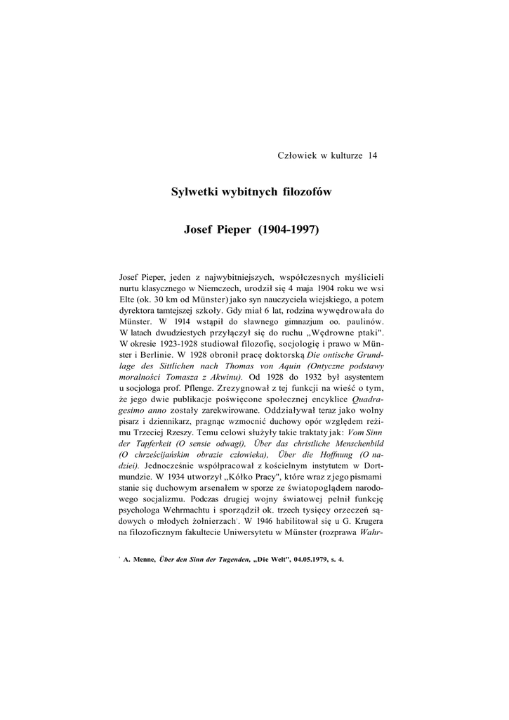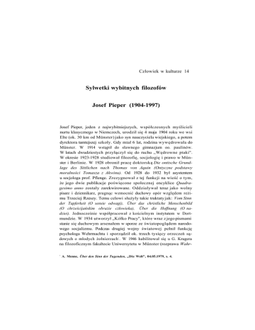 Człowiek w kulturze 14 Sylwetki wybitnych filozofów Josef Pieper (1904-1997) Josef Pieper, jeden z najwybitniejszych, współczesnych myślicieli nurtu klasycznego w Niemczech, urodził się 4 maja 1904 roku we wsi Elte (ok. 30 km od Münster) jako syn nauczyciela wiejskiego, a potem dyrektora tamtejszej szkoły. Gdy miał 6 lat, rodzina wywędrowała do Münster. W 1914 wstąpił do sławnego gimnazjum oo. paulinów. W latach dwudziestych przyłączył się do ruchu „Wędrowne ptaki". W okresie 1923-1928 studiował filozofię, socjologię i prawo w Mün ster i Berlinie. W 1928 obronił pracę doktorską Die ontische Grund lage des Sittlichen nach Thomas von Aquin (Ontyczne podstawy moralności Tomasza z Akwinu). Od 1928 do 1932 był asystentem u socjologa prof. Pflenge. Zrezygnował z tej funkcji na wieść o tym, że jego dwie publikacje poświęcone społecznej encyklice Quadragesimo anno zostały zarekwirowane. Oddziaływał teraz jako wolny pisarz i dziennikarz, pragnąc wzmocnić duchowy opór względem reżi mu Trzeciej Rzeszy. Temu celowi służyły takie traktaty jak: Vom Sinn der Tapferkeit (O sensie odwagi), Über das christliche Menschenbild (O chrześcijańskim obrazie człowieka), Über die Hoffnung (O na dziei). Jednocześnie współpracował z kościelnym instytutem w Dort mundzie. W 1934 utworzył „Kółko Pracy", które wraz z jego pismami stanie się duchowym arsenałem w sporze ze światopoglądem narodo wego socjalizmu. Podczas drugiej wojny światowej pełnił funkcję psychologa Wehrmachtu i sporządził ok. trzech tysięcy orzeczeń są dowych o młodych żołnierzach . W 1946 habilitował się u G. Krugera na filozoficznym fakultecie Uniwersytetu w Münster (rozprawa Wahr1 1 A. Menne, Über den Sinn der Tugenden, „Die Welt", 04.05.1979, s. 4. 266 Sylwetki wybitnych filozofów heit der Dinge - Prawda rzeczy). Również w 1946 został powołany na urząd profesora nowo utworzonej Akademii Pedagogicznej w Essen, który wykonywał do 1969. W 1946 na uniwersytecie w Münster specjalnie dla niego została utworzona katedra antropologii filo zoficznej, którą kierował do przejścia na emeryturę (1970). Wykłady prowadził do 92 roku życia i zawsze przy licznym audytorium (brako wało krzeseł w sali wykładowej). Nie przyjął propozycji kierownika katedry na kilku uniwersytetach: we Frankfurcie, Mainz i Monachium. Często zapraszany na zagraniczne uniwersytety, przeprowadził tam wiele wykładów. Był gościnnym profesorem na uniwersytetach: wol nym w Berlinie (1949), w Notre Dame (1950), w Kalifornii (1957, 1962), w Toronto (1967), w Indiach (1962) i Japonii (1964). Specjalne upodobanie przejawiał w kształceniu nauczycieli, które realizował ja ko profesor Akademii Pedagogicznej w Essen. W życiu Piepera nie było wyraźnych załamań ani wielkich nawró ceń. Najbardziej inspirujący okazał się dzień 28 sierpnia 1924 roku. Dwudziestoletni Pieper uczestniczył wówczas w wieczorze muzycz nym na zamku Rothenfels, zorganizowanym z okazji 175. urodzin Goethego. Zainspirowało go wtedy do studiów myśli klasycznej i św. Tomasza przemówienie Romano Guardiniego dotyczące ducha kla sycznego w twórczości Tomasza i Goethego. Dla Piepera najbardziej urzekającą cechą tych myślicieli był respekt dla rzeczywistości i obiektywizm. Postanowił iść ich śladem, czemu dawał wyraz w całej swej działalności filozoficznej i pisarskiej, począwszy od rozprawy doktorskiej. Podkreślił w niej - w przeciwieństwie do Kanta - że wszelka powinność ma swe podstawy w bycie, a dobro w rzeczy wistości . Nauczycielami Piepera nie byli aktualnie żyjący, lecz wspomniani powyżej św. Tomasz, Goethe oraz Platon, którzy pochodzili z trzech odrębnych epok: antyku, średniowiecza, nowożytności. Najpierw zasadniczym źródłem twórczości Piepera była myśl św. Tomasza i jej poświęcił kilka swych dzieł, m.in. Einführung zu Tho mas von Aquin (Wprowadzenie do nauki Tomasza), Über Thomas von 2 J. Strickstrock, J. Pieper Träger der Paulus-Plakette der Stadt Münster, Münster 05.11.1979, s. 2-3 2 Josef Pieper (1904-1997) 267 Aquin (O Tomaszu z Akwinu), Philosophia negativa (Filozofia nega tywna). Od 1947 przedmiot jego analiz przesuwał się coraz bardziej w kie runku Platona. Pieper interpretował i aktualizował jego poglądy za warte w Dialogach (Gorgiasz, Uczta, Fajdros, Kriton) w formie sztuk teatralnych i audycji radiowych. Opublikował je w Kümmert euch nicht um Sokrates (Nie troszczcie się o Sokratesa). Interpretacje Fajdrosa i kilku innych dzieł Platona przedstawił w Begeisterung und göttlicher Wahnsinn (Zachwyt i boskie szaleństwo) oraz Über die platonischen Mythen (O mitach platońskich). W tej ostatniej książce przedstawił też obrazowo metody fdozofii platońskiej. Przybliżając współczesnemu człowiekowi poglądy Platona, podkreślał przede wszystkim, że są obecnie przydatne i prawdziwe - i takimi pozostaną zawsze. W latach sześćdziesiątych i siedemdziesiątych Pieper zajmował się zjawiskami posoborowymi Kościoła katolickiego, czego dokumenta cją jest praca Über die Schwierigkeiten der Glaubens heute (O trud nościach wiary dzisiaj). Nie sposób w tym miejscu dokładnie przedstawić dorobek filozoficzno-pisarski niemieckiego myśliciela. Był on filozofem typu kla sycznego. Jego dzieła dotyczą zagadnień z zakresu wielu gałęzi fdozofii: metafizyki, teorii poznania, filozofii kultury, filozofii spo łecznej, filozofii religii, etyki, a zwłaszcza antropologii filozoficznej. Dodajmy tylko, że podejmował w swojej twórczości wszystkie naj bardziej palące problemy współczesnej rzeczywistości i życia chrze ścijańskiego: problemy natury społecznej, egzystencjalnej, kulturo wej. Jeśli mierzylibyśmy sukces naukowej pracy liczbą książek i przekładów na inne języki, to okazałoby się, że Pieper jest pod tym względem najbardziej skutecznym i wpływowym twórcą XX wieku . W sumie napisał pięćdzi