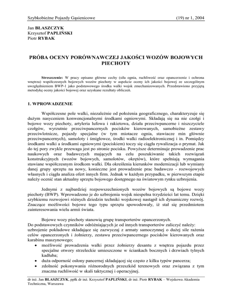Szybkobieżne Pojazdy Gąsienicowe (19) nr 1, 2004 Jan BŁASZCZYK Krzysztof PAPLIŃSKI Piotr RYBAK PRÓBA OCENY PORÓWNAWCZEJ JAKOŚCI WOZÓW BOJOWYCH PIECHOTY Streszczenie: W pracy opisano główne cechy (siła ognia, ruchliwość oraz opancerzenie i ochrona wnętrza) współczesnych bojowych wozów piechoty w aspekcie oceny ich jakości bojowej ze szczególnym uwzględnieniem BWP-1 jako podstawowego środka walki wojsk zmechanizowanych. Przedstawiono przyjętą metodykę oceny jakości bojowej oraz uzyskane rezultaty obliczeń. 1. WPROWADZENIE Współczesne pole walki, niezależnie od położenia geograficznego, charakteryzuje się dużym nasyceniem konwencjonalnymi środkami ogniowymi. Składają się na nie czołgi i bojowe wozy piechoty, artyleria lufowa i rakietowa, działa przeciwpancerne i niszczyciele czołgów, wyrzutnie przeciwpancernych pocisków kierowanych, samobieżne zestawy przeciwlotnicze, pojazdy specjalne (w tym miotacze ognia, stawiacze min głównie przeciwpancernych), samoloty i śmigłowce, środki walki radioelektronicznej i in. Pomiędzy środkami walki a środkami ogniowymi (pociskiem) toczy się ciągła rywalizacja o prymat. Jak do tej pory zwykle przewaga jest po stronie pocisku. Powyższe determinuje prowadzenie prac naukowych oraz badawczych mających na celu poszukiwanie takich rozwiązań konstrukcyjnych (wozów bojowych, samolotów, okrętów), które spełniają wymagania stawiane współczesnym środkom walki. Dla określenia kierunków modernizacji lub wymiany danej grupy sprzętu na nowy, konieczne jest prowadzenie prac badawczo - rozwojowych własnych i ciągła analiza ofert innych firm. Jednak w każdym przypadku, w pierwszym etapie należy ocenić stan aktualny sprzętu bojowego dostępnego na światowym rynku uzbrojenia. Jednymi z najbardziej rozpowszechnionych wozów bojowych są bojowe wozy piechoty (BWP). Wprowadzono je do uzbrojenia wojsk niespełna trzydzieści lat temu. Dzięki szybkiemu rozwojowi różnych dziedzin techniki wojskowej nastąpił ich dynamiczny rozwój. Znaczące możliwości bojowe tego typu sprzętu spowodowały, iż stał się przedmiotem zainteresowania wielu armii świata. Bojowe wozy piechoty stanowią grupę transporterów opancerzonych. Do podstawowych czynników odróżniających je od innych transporterów zaliczyć należy: uzbrojenie pokładowe składające się zazwyczaj z armaty samoczynnej o dużej sile rażenia celów opancerzonych i żołnierzy, zestawu przeciwpancernego pocisków kierowanych oraz karabinu maszynowego; możliwość prowadzenia walki przez żołnierzy desantu z wnętrza pojazdu przez specjalne otwory strzeleckie umieszczone w ściankach bocznych i drzwiach tylnych kadłuba; duża odporność osłony pancernej składającej się często z kilku typów pancerza; zdolność pokonywania różnorodnych przeszkód terenowych oraz związana z tym znaczna ruchliwość w skali taktycznej i operacyjnej. dr inż. Jan BŁASZCZYK, ppłk dr inż. Krzysztof PAPLIŃSKI, dr inż. Piotr RYBAK – Wojskowa Akademia Techniczna, Warszawa Jan BŁASZCZYK, Krzysztof PAPLIŃSKI, Piotr RYBAK Głównym zadaniem bojowych wozów piechoty jest umożliwienie pododdziałom piechoty prowadzenia walki bezpośrednio w szykach czołgów przez zapewnienie im ochrony przed ogniem przeciwnika oraz wsparcia własną bronią pokładową. Bojowe wozy piechoty stanowią środek walki uzupełniający się z czołgami, a nie jak niektórzy sądzą zastępujący czołgi. Wiele typów BWP opracowywanych jest „pod” konkretny typ czołgu jako element swoistego tandemu bojowego. Przykładem mogą tu być wozy: Marder-1 opracowany do współpracy z czołgiem Leopard, AMX-10P przeznaczony do współdziałania z czołgiem AMX-30 czy też w wozach drugiej generacji BWP M-2 Bradley opracowany dla czołgu M-1 Abrams oraz BMP-3 dla czołgu T-80. Ze względu na swoje wysokie walory bojowe BWP są chętnie stosowane w lokalnych konfliktach zbrojnych oraz misjach interwencyjnych (Izrael, Liban, Kuwejt, Afganistan, Irak). Pojazdy te zyskały olbrzymią popularność i obecnie znajdują się w uzbrojeniu większości armii świata a sposób ich wykorzystania w lokalnych konfliktach (odbiegający od klasycznej bitwy pancernej) uległ znacznej zmianie jakościowej. 2. CEL I ZAKRES PRACY Głównym celem pracy jest podjęcie próby obiektywnego i kompleksowego oszacowania wartości bojowej współczesnych BWP w aspekcie polepszenia ich własności bojowych i technicznych, adekwatnie do wymagań zmieniającego się pola walki. Przyjęta metoda analizy jakości bojowej, jest uniwersalna i może być stosowana do porównawczej oceny jakości różnego sprzętu technicznego. Zakres pracy obejmuje: analizę cech bojowych i ich wpływ na żywotność BWP (to jest zdolność przetrwania) na współczesnym, konwencjonalnym polu walki, wydzielenie obszarów bojowej i technicznej charakterystyki BWP w aspekcie wymagań współczesnego pola walki a umożliwiające porównanie różnych typów czołgów, zestawienie wybranych parametrów bojowej i technicznej charakterystyki, stanowiących dane wyjściowe do budowy macierzy obejmujących przyjęte obszary porównawcze - cechy bojowe, wyznaczenie wskaźników jakości BWP w danych obszarach porównawczych oraz sumarycznego wskaźnika jakości bojowej. Podstawowym zamierzeniem autorów pracy jest oszacowanie jakości bojowej BWP na bazie ogólnie dostępnych danych w literaturze, parametrach bojowej i technicznej charakterystyki. Należy dodać, że część parametrów (mierników) określono na podstawie doświadczenia i inżynierskiej wiedzy. Te drugie należy traktować jako hipotetyczne. 3. PODSTAWOWE CECHY BOJOWE Jakość bojową BWP, w ogólnym przypadku, charakteryzują jego główne cechy bojowe, którymi są: ruchliwość, siła ognia (moc ognia), opancerzenie i ochrona wnętrza. Próba oceny porównawczej jakości wozów bojowych piechoty Na etapie określenia wymagań taktyczno-technicznych wskazane jes