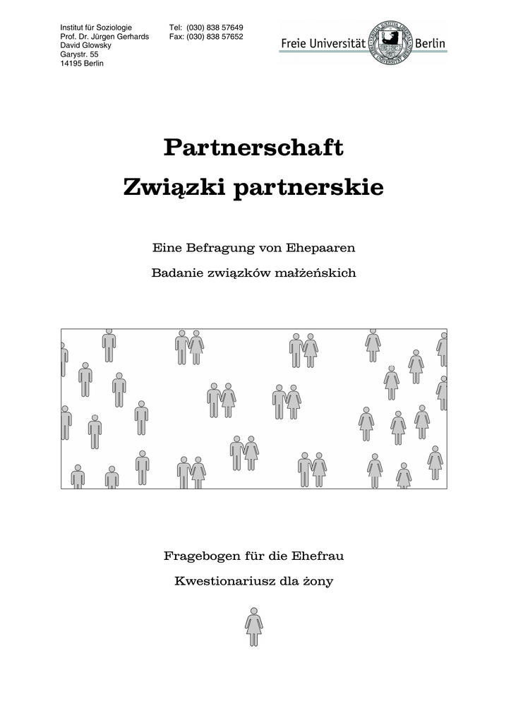 Institut für Soziologie Prof. Dr. Jürgen Gerhards David Glowsky Garystr. 55 14195 Berlin Tel: (030) 838 57649 Fax: (030) 838 57652 Partnerschaft Związki partnerskie Eine Befragung von Ehepaaren Badanie związków małżeńskich Fragebogen für die Ehefrau Kwestionariusz dla żony Hinweise zum Ausfüllen des Fragebogens Wskazówki do wypełnienia kwestionariusza Dieser Fragebogen richtet sich an die Ehefrau. Bitte füllen Sie den Fragebogen aus und schicken Sie ihn dann mit dem beiliegenden Umschlag an uns zurück. Das Ausfüllen des Fragebogens ist ganz leicht. Es gibt keine richtigen oder falschen Antworten. Am besten antworten Sie auf die Fragen ganz spontan nach Ihrer persönlichen Meinung. Wenn Sie sich nicht ganz sicher sind, dann kreuzen Sie das an, was am ehesten auf Sie zutrifft. Ten kwestionariusz jest skierowany do żony. Prosimy o wypełnienie kwestionariusza i odesłanie go nam w załączonej kopercie. Wypełnienie kwestionariusza jest bardzo proste. Nie ma prawidłowych ani nieprawidłowych odpowiedzi. Najlepiej odpowiadać na pytania spontanicznie, zgodnie z własnym przekonaniem. Jeśli nie jest Pani do końca przekonana co do odpowiedzi, prosimy o zaznaczenie tej, która jest Pani najbliższa. • Meistens reicht dazu schon ein Kreuz: Najczęściej wystarczy postawić krzyżyk: Beispiel: przykład: Geschlecht: płeć: männlich ........ mężczyzna weiblich.......... kobieta • Bei wenigen Fragen können Sie selbst etwas in einem leeren Kasten eintragen: W przypadku niektórych pytań może Pani sama wpisać odpowiedź w oznaczone pole: Beispiel: przykład: • Geburtsjahr: . rok urodzenia: 1954 Bitte gehen Sie der Reihe nach vor, Frage für Frage. Prosimy o odpowiadanie na pytania według kolejności, pytanie po pytaniu. Wenn Sie Nachfragen haben, melden Sie sich doch einfach. Wir stehen Ihnen gern zur Verfügung: Jeśli ma Pani jakieś pytania lub uwagi, proszę zgłosić się do nas. Jesteśmy do Pani dyspozycji: Prof. Dr. Jürgen Gerhards / David Glowsky Tel: (030) 838 57649 [email protected] Für Ihre Teilnahme an der Befragung möchten wir uns schon jetzt herzlich bei Ihnen bedanken. Za udział w badaniach chcielibyśmy Pani już teraz serdecznie podziękować. Seite 2 Einstellungen und Persönlichkeit Nastawienie i osobowość 1. Man kann unterschiedlicher Meinung sein, was für eine gute Ehe wichtig ist. Wie wichtig sind Ihnen persönlich die folgenden Punkte für eine gute Ehe? ) Wenn Sie etwas völlig unwichtig finden, kreuzen Sie den Wert "0" an, Wenn Sie etwas überaus wichtig finden, kreuzen Sie den Wert "10" an. Mit den Werten dazwischen können Sie Ihre Einschätzung abstufen. Można mieć różne zdanie na temat tego, co jest ważne dla udanego małżeństwa. Jak ważne dla udanego małżeństwa są według Pani następujące punkty? ) - Jeśli uważa Pani coś za całkowicie nieważne, prosimy o zaznaczenie wartości "0" Jeśli uważa Pani coś za szczególnie ważne, prosimy o zaznaczenie wartości "10" Za pomocą wartości pośrednich może Pani stopniować swoją ocenę. ganz und gar unwichtig ganz und gar wichtig zupełnie nieważne szczególnie ważne Gegenseitiger Respekt und Anerkennung ........ Wzajemny szacunek i uznanie - Gemeinsame Kinder.......................................... Wspólne dzieci - Ein treuer Partner .............................................. Wierny partner - Gemeinsame Freunde....................................... Wspólni przyjaciele - Seinem Partner treu zu sein.............................. Wierność partnerowi - Gleiche kulturelle Herkunft ................................ Takie samo pochodzenie kulturowe - Eine gute sexuelle Beziehung ........................... Udane życie seksualne 1 2 3 4 5 6 7 8 9 10 2 3 4 5 6 7 8 9 10 0 1 0 Über Probleme in der Partnerschaft reden zu können................................................ Możliwość porozmawiania o problemach w związku - 0 0 1 2 3 4 5 6 7 8 9 10 1 2 3 4 5 6 7 2 3 4 5 6 2 3 4 5 2 3 4 2 3 0 1 0 1 0 1 0 1 Seite 3 8 9 10 7 8 9 10 6 7 8 9 10 5 6 7 8 9 10 4 5 6 7 8 9 10 2. Es gibt unterschiedliche Meinungen darüber, wann ein Mann anziehend ist. Bitte nennen Sie uns für die folgenden Bereiche, was Ihrer Meinung nach einen Mann attraktiv macht. Istnieją różne opinie na temat tego, kiedy mężczyzna jest pociągający. Proszę wskazać nam, w ramach następujących obszarów, co sprawia, że mężczyzna jest Pani zdaniem atrakcyjny. Für mich ist ein Mann anziehend, wenn er: Dla mnie mężczyna jest pociągający gdy: - 0 0 0 jugendlich wirkt ................................................. zachowuje się młodzieńczo - 0 zärtlich ist........................................................... jest czuły - 0 schlank ist.......................................................... jest szczupły - 0 selbstbewusst ist ............................................... jest pewny siebie - 0 einen schönen Körper hat ................................. ma piękne ciało - 0 gebildet ist ......................................................... jest wykształcony - 0 Lust auf Sex hat ................................................ jest aktywny seksualnie - szczególnie ważne häuslich ist......................................................... jest domatorem - zupełnie nieważne beruflich erfolgreich ist ...................................... osiągnął sukces zawodowy - ganz und gar wichtig ein hübsches Gesicht hat .................................. ma ładną twarz - ganz und gar unwichtig 0 auf meine sexuellen Wünsche eingeht ............. zaspokaja moje życzenia seksuale 0 1 2 3 4 5 6 7 8 9 10 1 2 3 4 5 6 7 8 9 10 1 2 3 4 5 6 7 8 9 10 1 2 3 4 5 6 7 8 9 10 1 2 3 4 5 6 7 8 9 10 1 2 3 4 5 6 7 8 9 10 1 2 3 4 5 6 7 8 9 10 1 2 3 4 5 6 7 8 9 10 1 2 3 4 5 6 7 8 9 10 1 2 3 4 5 6 7 8 9 10 1 2 3 4 5 6 7 8 9 10 Seite 4 3. Man spricht ja oft davon, dass sich heutzutage die Rollen von Mann und Frau verändern. Wir nennen Ihnen verschiedene Aussagen über die Aufgaben v