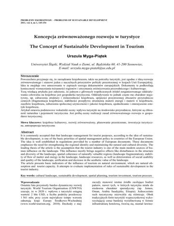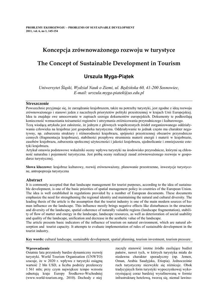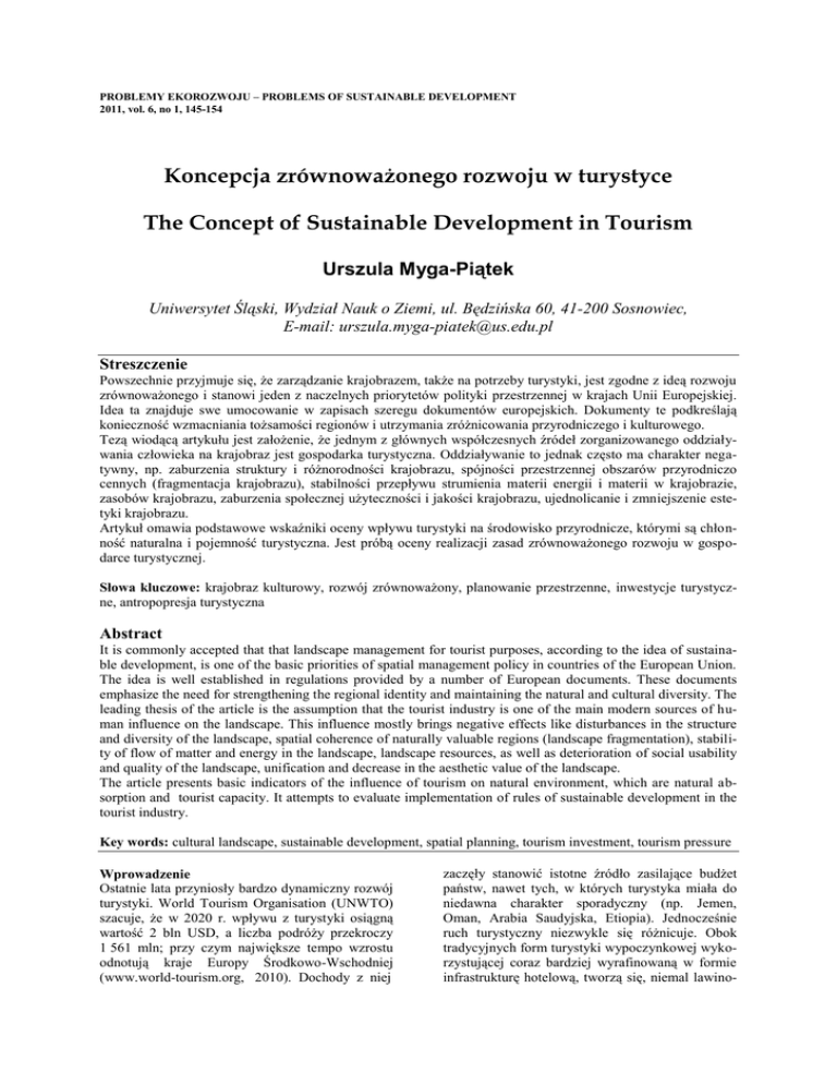 PROBLEMY EKOROZWOJU – PROBLEMS OF SUSTAINABLE DEVELOPMENT 2011, vol. 6, no 1, 145-154 Koncepcja zrównoważonego rozwoju w turystyce The Concept of Sustainable Development in Tourism Urszula Myga-Piątek Uniwersytet Śląski, Wydział Nauk o Ziemi, ul. Będzińska 60, 41-200 Sosnowiec, E-mail: [email protected] Streszczenie Powszechnie przyjmuje się, że zarządzanie krajobrazem, także na potrzeby turystyki, jest zgodne z ideą rozwoju zrównoważonego i stanowi jeden z naczelnych priorytetów polityki przestrzennej w krajach Unii Europejskiej. Idea ta znajduje swe umocowanie w zapisach szeregu dokumentów europejskich. Dokumenty te podkreślają konieczność wzmacniania tożsamości regionów i utrzymania zróżnicowania przyrodniczego i kulturowego. Tezą wiodącą artykułu jest założenie, że jednym z głównych współczesnych źródeł zorganizowanego oddziaływania człowieka na krajobraz jest gospodarka turystyczna. Oddziaływanie to jednak często ma charakter negatywny, np. zaburzenia struktury i różnorodności krajobrazu, spójności przestrzennej obszarów przyrodniczo cennych (fragmentacja krajobrazu), stabilności przepływu strumienia materii energii i materii w krajobrazie, zasobów krajobrazu, zaburzenia społecznej użyteczności i jakości krajobrazu, ujednolicanie i zmniejszenie estetyki krajobrazu. Artykuł omawia podstawowe wskaźniki oceny wpływu turystyki na środowisko przyrodnicze, którymi są chłonność naturalna i pojemność turystyczna. Jest próbą oceny realizacji zasad zrównoważonego rozwoju w gospodarce turystycznej. Słowa kluczowe: krajobraz kulturowy, rozwój zrównoważony, planowanie przestrzenne, inwestycje turystyczne, antropopresja turystyczna Abstract It is commonly accepted that that landscape management for tourist purposes, according to the idea of sustainable development, is one of the basic priorities of spatial management policy in countries of the European Union. The idea is well established in regulations provided by a number of European documents. These documents emphasize the need for strengthening the regional identity and maintaining the natural and cultural diversity. The leading thesis of the article is the assumption that the tourist industry is one of the main modern sources of human influence on the landscape. This influence mostly brings negative effects like disturbances in the structure and diversity of the landscape, spatial coherence of naturally valuable regions (landscape fragmentation), stability of flow of matter and energy in the landscape, landscape resources, as well as deterioration of social usability and quality of the landscape, unification and decrease in the aesthetic value of the landscape. The article presents basic indicators of the influence of tourism on natural environment, which are natural absorption and tourist capacity. It attempts to evaluate implementation of rules of sustainable development in the tourist industry. Key words: cultural landscape, sustainable development, spatial planning, tourism investment, tourism pressure Wprowadzenie Ostatnie lata przyniosły bardzo dynamiczny rozwój turystyki. World Tourism Organisation (UNWTO) szacuje, że w 2020 r. wpływu z turystyki osiągną wartość 2 bln USD, a liczba podróży przekroczy 1 561 mln; przy czym największe tempo wzrostu odnotują kraje Europy Środkowo-Wschodniej (www.world-tourism.org, 2010). Dochody z niej zaczęły stanowić istotne źródło zasilające budżet państw, nawet tych, w których turystyka miała do niedawna charakter sporadyczny (np. Jemen, Oman, Arabia Saudyjska, Etiopia). Jednocześnie ruch turystyczny niezwykle się różnicuje. Obok tradycyjnych form turystyki wypoczynkowej wykorzystującej coraz bardziej wyrafinowaną w formie infrastrukturę hotelową, tworzą się, niemal lawino- 146 Myga-Piątek/Problemy Ekorozwoju/Problems of Sustainable Development 1/2011, 145-154 wo, niezwykle niszowe typy turystyki wnikające we wszystkie strefy i piętra krajobrazowe, i w sposób trudny do opanowania eksplorujące zasoby dziedzictwa przyrodniczego i kulturowego naszej planety. Ze względu na fakt, że turystyka coraz częściej rozwija się spontanicznie i żywiołowo, zaczyna coraz intensywniej wywierać wpływ na środowisko przyrodnicze i krajobraz. Rozwój ruchu turystycznego odgrywa obecnie ważną rolę w procesie planowania przestrzennego i rozwoju strategicznego. Skutki masowego charakteru1 i globalnego zasięgu turystyki są współcześnie uznawane za jeden z poważniejszych przejawów antropopresji. Skłania to autorkę do zabrania głosu w kwestii potrzeby rozszerzenia polityki zrównoważonego rozwoju o problematykę związaną z turyzmem. Pojęciem tym określa się złożone zjawisko obejmujące społeczno-kulturowe, gospodarcze, prawnopolityczne, przyrodnicze i przestrzenne uwarunkowania oraz przebieg i następstwa turystyki (Kowalczyk, 2000). Zrównoważony rozwój odnosi się do praw obecnych i przyszłych pokoleń do racjonalnego gospodarowania zasobami środowiska przyrodniczego, do sposobu zarządzania, który zapewniając ogólny postęp cywilizacyjny pozwoli zachować i chronić walory przyrodnicze przez ograniczanie szkodliwego wpływu procesów produkcji i konsumpcji na stan środowiska (Redclift, 2009). Tymczasem dla rozwoju przemysłu turystycznego środowisko przyrodnicze i krajobraz są podstawowym zasobem (surowcem). Zasoby te często określane jako walory (przyrodnicze, kulturowe, widokowe) spełniają różne funkcje m.in.: estetyczną, kulturową, poznawczą (informacyjną), psychologiczną (emocjonalną), rekreacyjną, wypoczynkową, inspirującą ale także użytkową (Myga-Piątek, 2006). Celem artykułu jest wskazanie na potrzebę szczegółowych prac multidyscyplinarnych nad wpływem turystyki na środowisko przyrodnicze i krajobraz kulturowy oraz wykazanie konieczności wdrożenia koncepcji rozwoju zrównoważonego w turystyce. Tezą wiodącą artykułu jest założenie