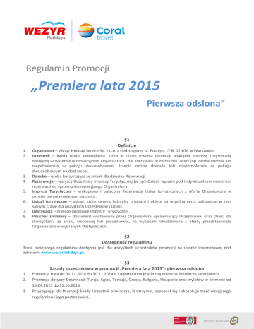 Regulamin Promocji „Premiera lata 2015 Pierwsza odsłona” §1 Definicje 1. 2. 3. 4. 5. 6. 7. 8. Organizator – Wezyr Holiday Service Sp. z o.o. z siedzibą przy ul. Postępu 17 B, 02-676 w Warszawie. Uczestnik – każda osoba pełnopłatna, która w czasie trwania promocji wykupiła Imprezę Turystyczną dostępną w systemie rezerwacyjnym Organizatora i nie korzystała ze zniżek dla Dzieci (np. osoba dorosła lub niepełnoletnia w pokoju dwuosobowym, trzecia osoba dorosła lub niepełnoletnia w pokoju dwuosobowym na dostawce). Dziecko – osoba korzystająca ze zniżek dla dzieci w Rezerwacji. Rezerwacja – wszyscy Uczestnicy Imprezy Turystycznej (w tym Dzieci) wpisani pod indywidualnym numerem rezerwacji do systemu rezerwacyjnego Organizatora. Impreza Turystyczna – wykupiona i opłacona Rezerwacja Usług turystycznych z oferty Organizatora w okresie trwania niniejszej promocji. Usługi turystyczne – usługi, które tworzą jednolity program i objęte są wspólną ceną, zakupione w tym samym czasie dla wszystkich Uczestników i Dzieci. Destynacja – miejsce docelowe Imprezy Turystycznej. Voucher zniżkowy – dokument wystawiony przez Organizatora uprawniający Uczestników oraz Dzieci do skorzystania ze zniżki, kwotowej lub procentowej, na wycieczki fakultatywne z oferty przedstawiciela Organizatora w wybranych Destynacjach. §2 Dostępność regulaminu Treść niniejszego regulaminu dostępna jest dla wszystkich uczestników promocji na stronie internetowej pod adresem: www.wezyrholidays.pl. §3 Zasady uczestnictwa w promocji „Premiera lata 2015”- pierwsza odsłona 1. 2. 3. Promocja trwa od 01.11.2014 do 30.11.2014 r. i ograniczona jest liczbą miejsc w hotelach i samolotach. Promocja dotyczy Destynacji: Turcja, Egipt, Tunezja, Grecja, Bułgaria, Hiszpania oraz wylotów w terminie od 15.04.2015 do 31.10.2015. Przystępując do Promocji każdy Uczestnik oświadcza, iż otrzymał, zapoznał się i akceptuje treść niniejszego regulaminu i jego postanowień. 4. 5. 6. 7. 8. 9. 10. 11. 12. 13. Uczestnikowi i Dziecku przysługuje zniżka do 30% na wybrane hotele, która zawarta jest w ofercie Organizatora „Lato 2015”. W czasie trwania Promocji, jednak nie później niż do dnia 30.11.2014, każdemu Uczestnikowi przysługuje możliwość jednokrotnej zmiany Usługi turystycznej [po jednej zmianie z każdego przypadku opisanego poniżej], bez ponoszenia dodatkowej opłaty, w następującym zakresie: a. zmiana nazwiska jednego z Uczestników Imprezy Turystycznej przy założeniu, iż Rezerwacja dokonana jest na minimum dwóch Uczestników, b. zmiana daty rozpoczęcia i zakończenia Usługi turystycznej, c. zmiana trasy przelotu, d. zmiana hotelu, e. zmiana Destynacji. Jeżeli zmiana Usługi turystycznej opisana w pkt. 5 ust. b, c, d, e będzie wiązała się ze zmianą ceny Imprezy Turystycznej, Organizator każdorazowo poinformuje Uczestnika o nowej cenie. Nowa cena będzie obliczona w dniu dokonania zmiany. Uczestnik i Dziecko otrzymają Voucher zniżkowy do wykorzystania na wycieczkę fakultatywną organizowaną przez przedstawiciela Organizatora zgodnie z § 3 ust. 8. Warunkiem wykorzystania Voucheru zniżkowego jest jego okazanie w momencie zakupu wycieczki fakultatywnej u przedstawiciela Organizatora. Wartość Voucherów zniżkowych w zależności od Destynacji: a) Turcja - Voucher zniżkowy o wartości 10 EUR dla każdego Uczestnika powyżej 12 roku życia. b) Egipt - Voucher zniżkowy o wartości 10 USD dla każdego Uczestnika powyżej 12 roku życia. c) Grecja - Voucher zniżkowy o wartości 10 EUR dla każdego Uczestnika powyżej 12 roku życia. Voucher zniżkowy może być wykorzystany na wszystkie wycieczki fakultatywne zakupione u przedstawiciela Organizatora. Voucher zniżkowy nie może być wykorzystany na zakup wycieczek fakultatywnych z transportem lotniczym lub promowym w Turcji (Rodos, Kos, Istanbul, Izrael) i Egipcie (Kair, Luxor). Vouchery zniżkowe nie sumują się i nie są wymieniane na gotówkę, a niewykorzystane przepadają. Przy minimum dwóch Uczestnikach w Rezerwacji, 7 (siedmio-) lub 14 (czternasto-) dniowej Imprezie Turystycznej, w wybranych Destynacjach i hotelach przysługuje specjalna cena dla Dziecka: a) Turcja, Egipt – od 790 zł, w wybranych datach, z wylotami z wybranych miast, b) Grecja, Hiszpania – od 690 zł, w wybranych datach, z wylotami z wybranych miast, c) Bułgaria – od 590 zł, w wybranych datach, z wylotami z wybranych miast. Liczba miejsc dla Dziecka w specjalnej cenie opisanej powyżej jest limitowana. Dla każdej Imprezy Turystycznej do jednego z poniższych hoteli zostanie zorganizowany specjalny transfer bezpośrednio do wybranego hotelu uwzględniając możliwe przystanki w sąsiadujących ze sobą hotelach: a) Gloria Golf, Gloria Serenity, Xanadu Belek, Rixos Premium Belek, b) Susesi Luxury, Ela Quality, Gural Premier Belek, Maxx Royal, c) Regnum Carya, Titanic Deluxe Belek, d) Barut Lara, Delphin Imperial Lara, Mardan Palace, d) Rixos Sungate, Nirvana Lagoon, Maxx Royal Kemer, Gural Premier Tekirova. Warunkiem skorzystania z bezpośredniego transferu opisanego w § 3 ust. 12 jest zakup Imprezy Turystycznej trwającej minimum 7 nocy. §4 Promocja dla grup 1. 2. 3. 4. 5. Przy zakupie takiej samej Imprezy Turystycznej 7 (siedmio-) dniowej lub więcej na wyloty w terminie od 15.04.2015 do 31.10.2015 dla grupy od 8 do 15 Uczestników w tym Dzieci, każdy Uczestnik otrzyma rabat 25 zł, Dziecko otrzyma rabat w wysokości 10 zł. Dziecko poniżej 2go roku życia nie jest wliczane do grupy i nie otrzymuje rabatu. Warunkiem skorzystania z rabatu jest dokonanie Rezerwacji w tym samym czasie na taką samą Usługę turystyczną dla wszystkich Uczestników i Dzieci. W przypadku rezygnacji Uczestników lub Dzieci z Imprezy Turystycznej w taki sposób, iż liczba Uczestników i Dzieci korzystających z rabatu dla grupy spadnie poniżej 8 rabat nie przysługuje. Różnica w cenie spowodowana zmniejszeniem ilości Uczest