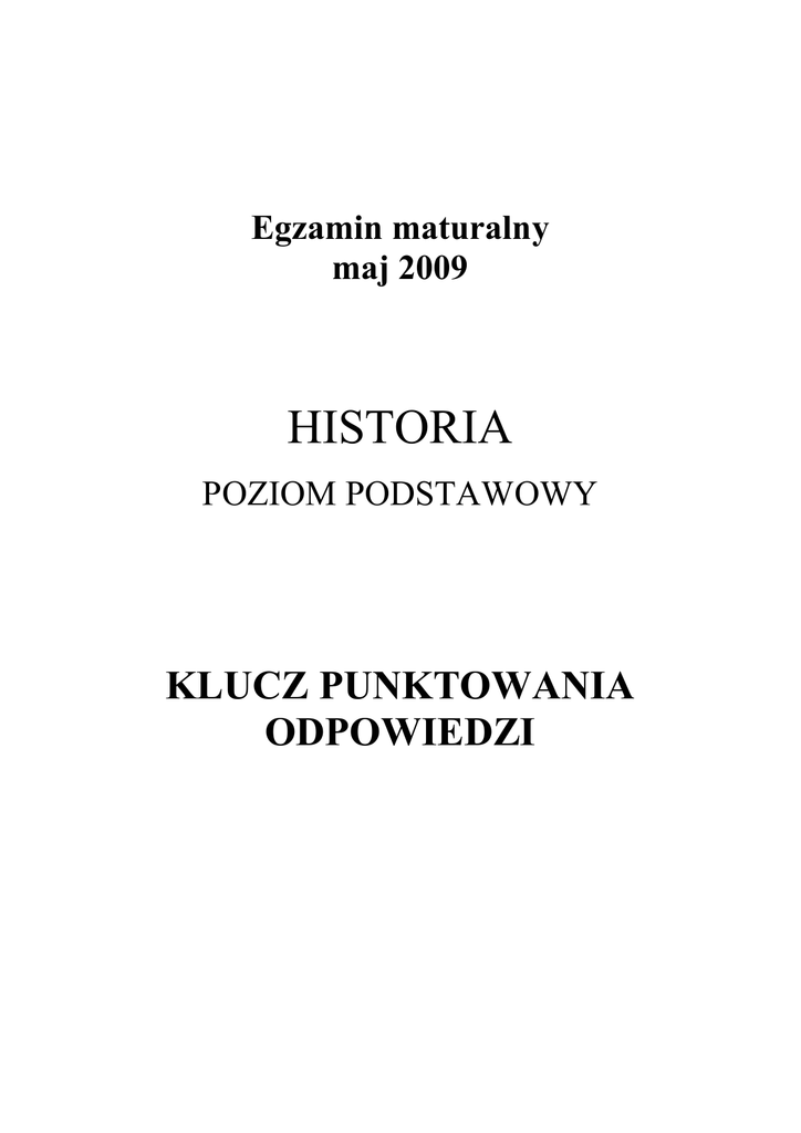 Egzamin maturalny maj 2009 HISTORIA POZIOM PODSTAWOWY KLUCZ PUNKTOWANIA ODPOWIEDZI Historia – poziom podstawowy Klucz punktowania odpowiedzi Zadanie 1. Korzystanie z informacji Rozpoznanie charakterystycznych cech cywilizacji starożytnych przedstawionych na ilustracjach. 0–3 Zdający otrzymuje 1 punkt za każdą poprawną odpowiedź – przyporządkowanie wizerunku bóstwa świata starożytnego do właściwego kręgu kulturowego. Poprawne odpowiedzi: A. 3. Egipt B. 4. Mezopotamia C. 2. Grecja Zadanie 2. A. Korzystanie z informacji Uogólnienie informacji i rozpoznanie polis greckiej na podstawie tekstu. 0–1 Zdający otrzymuje 1 punkt za identyfikację polis. Poprawna odpowiedź: Sparta B. Tworzenie informacji Uzasadnienie odpowiedzi – podanie argumentu. 0–1 Zdający otrzymuje 1 punkt za podanie jednego argumentu, w którym zwróci uwagę na elementy charakterystyczne dla systemu politycznego Sparty występujące w tekście Plutarcha. Uwaga: Zdający otrzymuje punkt za część B pod warunkiem dobrej odpowiedzi w części A zadania. Przykłady poprawnej odpowiedzi: • • • W tekście jest mowa o instytucjach politycznych charakterystycznych dla Sparty. Plutarch podaje, że w tej polis było dwóch królów. W tekście wspomina się legendarnego prawodawcę spartańskiego Likurga. Zadanie 3. A. Korzystanie z informacji Uogólnienie informacji z tekstu i podanie nazwy gatunku literackiego. Zdający otrzymuje 1 punkt za podanie terminu. Poprawna odpowiedź: tragedia 3 0–1 Historia – poziom podstawowy Klucz punktowania odpowiedzi B. Wiadomości i rozumienie Wykazanie się znajomością i rozumieniem terminów historycznych z zakresu kultury antycznej Grecji. 0–1 Zdający otrzymuje 1 punkt za podanie nazwy uroczystości związanej z kultem Dionizosa. Poprawna odpowiedź: Wielkie Dionizje lub określenia synonimiczne Zadanie 4. A. Korzystanie z informacji Odczytanie informacji z tekstu i podanie nazwy związku miast-państw greckich. 0–1 Zdający otrzymuje 1 punkt za podanie nazwy związku. Poprawna odpowiedź: Ateński Związek Morski lub Związek Morski, lub Związek Ateński, lub Związek Delijski, lub Symmachia Delijska B. Korzystanie z informacji Podanie przyczyny utworzenia związku. 0–1 Zdający otrzymuje 1 punkt za wskazanie przyczyny utworzenia związku. Poprawna odpowiedź: budowa floty lub organizowanie obrony przed Persami C. Tworzenie informacji Wyjaśnienie przyczyny zarzutów stawianych Peryklesowi. 0–1 Zdający otrzymuje 1 punkt za wyjaśnienie, w którym zwróci uwagę na fakt, że decyzja o wzniesieniu budowli publicznych odsłaniała prawdziwy cel przeniesienia skarbca Związku Morskiego do Aten – zagarnięcie go przez Ateny. Przykłady poprawnej odpowiedzi: • • • Decyzje podjęte przez Peryklesa, dotyczące rozbudowy Aten, przekreślały możliwość posługiwania się zręczną wymówką o bezpieczeństwie skarbca – jako celu przeniesienia go do Aten. Za pieniądze Związku Morskiego budowano gmachy publiczne w Atenach, co zdradzało zamiary Peryklesa. Przeniesienie skarbca tłumaczono dotychczas względami bezpieczeństwa, a teraz nie dało się ukryć chęci zagarnięcia gromadzonych tam pieniędzy. 4 Historia – poziom podstawowy Klucz punktowania odpowiedzi Zadanie 5. A. Wiadomości i rozumienie Wykazanie się znajomością faktografii z zakresu historii starożytnej – rozpoznanie państw starożytnych, w których stosowano cytowane zbiory praw. 0–2 Zdający otrzymuje 1 punkt za podanie nazwy każdego państwa. Poprawne odpowiedzi: Babilon lub Babilonia oraz Rzym lub inne nazwy państwa, w którym do ogłoszenia Kodeksu Justyniana obowiązywało Prawo XII tablic, np. republika rzymska, Cesarstwo Rzymskie, Cesarstwo Bizantyjskie B. Tworzenie informacji Porównanie norm prawnych stosowanych w tych państwach i wskazanie podobieństwa. Zdający otrzymuje 1 punkt za sformułowanie wniosku, w którym na podobieństwo lub surowość kary. 0–1 zwróci uwagę Przykłady poprawnej odpowiedzi: • • • W Babilonie i w Rzymie stosowano bardzo surowe kary. W obu państwach za fałszywe zeznania karano śmiercią. Obie normy dotyczyły tego samego przestępstwa, fałszywych zeznań. Zadanie 6. A. Korzystanie z informacji Zidentyfikowanie wodza wyprawy na podstawie tekstu. 0–1 Zdający otrzymuje 1 punkt za rozpoznanie postaci. Poprawna odpowiedź: Hannibal B. Wiadomości i rozumienie Wykazanie się znajomością i rozumieniem wydarzeń z dziejów Rzymu. Zdający otrzymuje 1 punkt za podanie celu politycznego wyprawy. Poprawna odpowiedź: pokonanie Rzymu lub atak na Rzym 5 0–1 Historia – poziom podstawowy Klucz punktowania odpowiedzi Zadanie 7. Wiadomości i rozumienie Wykazanie się znajomością i rozumieniem wydarzeń z dziejów Polski wczesnopiastowskiej. 0–1 Zdający otrzymuje 1 punkt za wybranie właściwej odpowiedzi – wskazanie bezpośredniego skutku zjazdu gnieźnieńskiego. Poprawna odpowiedź: 4. Pokój w Budziszynie Zadanie 8. Korzystanie z informacji Uporządkowanie chronologiczne wydarzeń historycznych – wskazanie w podanym zestawie wydarzenia chronologicznie pierwszego (A) i ostatniego (B). 0–2 Zdający otrzymuje 1 punkt za każdą poprawną odpowiedź. Poprawne odpowiedzi: A. Chrzest Chlodwiga I B. Spalenie Joanny d’Arc Zadanie 9. Wiadomości i rozumienie Wykazanie się znajomością wydarzeń i postaci z dziejów Polski w średniowieczu. 0–4 Zdający otrzymuje 1 punkt za każdą poprawną odpowiedź – podanie władcy, za panowania którego miało miejsce wymienione wydarzenie. Poprawne odpowiedzi: 1. 2. 3. 4. Bolesław II Śmiały lub Bolesław Śmiały, lub Bolesław Szczodry Bolesław III Krzywousty lub Bolesław Krzywousty Ludwik Węgierski lub Ludwik Andegaweński Kazimierz Jagiellończyk lub Kazimierz IV Jagiellończyk Zadanie 10. Wiadomości i rozumienie Wykazanie się znajomością i rozumieniem pojęć historycznych z zakresu gospodarki. 0–3 Zdający otrzymuje 1 punkt za każdą poprawną od