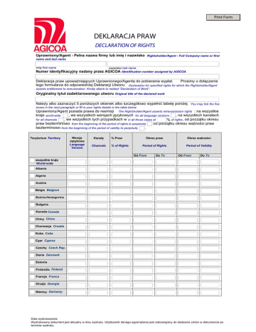 1SJOU'PSN %&,-"3"$+"13"8 %&$-"3"5*0/0'3*()54 Uprawniony/Agent - Pełna nazwa firmy lub imię i nazwisko Rightsholder/Agent - Full Company name or first name and last name imię first name nazwisko last name Numer identyfikacyjny nadany przez AGICOA Identification number assigned by AGICOA Deklaracja praw upoważniających Uprawnionego/Agenta do pobierania wypłat. Prosimy o dołączenie tego formularza do odpowiedniej Deklaracji Utworu. Declaration for specified rights for which the Rightsholder/Agent asserts entitlement to remuneration. Kindly attach to related "Declaration of Work". Oryginalny tytuł zadeklarowanego utworu Original title of the declared work Należy albo zaznaczyć 5 poniższych okienek albo szczegółowo wypełnić tabelę poniżej. You may tick the five boxes in the next paragraph or fill in your rights details in the table below. Uprawniony/Agent posiada prawa do reemisji The Rightsholder/Agent asserts retransmission rights : na wszystkie , we wszystkich wersjach językowych for all language versions , na wszystkich kanałach kraje world-wide , we wszystkich tych przypadkach w in all those cases at for all channels % of rights, od początku okresu praw bezterminowo from the beginning of the period of rights to perpetuity i od początku okresu ważności praw bezterminowo from the beginning of the period of validity to perpetuity . Terytorium Territory Wersja Językowa Language Version Kanały Channels % Praw % of Rights Okres praw Okres ważności Period of Rights Period of Validity Od From Do To Od From Do To wszystkie kraje World-wide Albania Algeria Austria Belgia Belgium Bośnia-Herzegovina Bułgaria Kanada Canada Chiny China Chorwacja Croatia Kuba Cuba Cypr Cyprus Czechy Czech Rep. Dania Denmark Estonia Finlandia Finland Francja France Gruzja Georgia Niemcy Germany Data wydrukowania: Wydrukowany dokument jest aktualny w dniu wydruku. Użytkownik danego egzemplarza jest zobowiązany do śledzenia zmian w dokumencie po terminie wydruku. AGICOA - DEKLARACJA PRAW - DECLARATION OF RIGHTS Grecja Greece Węgry Hungary Islandia Iceland India India Izrael Israel Włochy Italy Ameryka Łacińska* Latin America* Łotwa Latvia Litwa Lithuania Luxemburg Luxembourg Macedonia Mołdowia Moldova Maroko Morocco Nowa Zelandia New Zealand Norwegia Norway Polska Poland Portugalia Portugal Irlandia Rep. of Ireland Rumunia Romania Rosja Russia Serbia i Czarnogóra Serbia & Montenegro Słowacja Slovakia Słowenia Slovenia Afryka Południowa South Africa Hiszpania Spain Szwecja Sweden Szwajcaria Switzerland Holandia The Netherlands Tunezja Tunisia Turcja Turkey USA Ukraina Ukraine Inne Other (wymien specify) (*Ameryka Łacińska Latin America: Argentyna Argentina, Belize Belize, Boliwia Bolivia, Brazylia Brazil, Chile Chile, Kolumbia Colombia, ?? Costa Rica, Ekwador Ecuador, Salwador El Salvador, Gujana Francuska French Guiana, Gwatemala Guatemala, Gujana Guyana, Honduras Honduras, Meksyk Mexico, Nikaragua Nicaragua, Panama Panama, Paragwaj Paraguay, Peru Peru, ?? Suriname, Urugwaj Uruguay, Wenezuela Venezuela) AGICOASVF1FTUBMP[[J$)(FOFWB5FM'BY 2 Ref:reg.f2B.pl_20060502 Data wydrukowania: Wydrukowany dokument jest aktualny w dniu wydruku. Użytkownik danego egzemplarza jest zobowiązany do śledzenia zmian w dokumencie po terminie wydruku. AGICOA - DEKLARACJA PRAW - DECLARATION OF RIGHTS Oryginalny tytuł zadeklarowanego utworu Original title of the declared work Deklarujący niniejszym daje AGICOA mandat powierniczy do zezwalnia na lub zabraniania reemisji deklarowanego utworu drogą kablową, w MMDS, na platformach satelitarnych itp. (zwanej dalej reemisją) lub do zgłaszania roszczeń z tytułu reemisji tegoż utworu na wyspecyfikowanych w deklaracji terytoriach, w The Declarant hereby gives to AGICOA, as a trustee, the mandate to authorize or to wersjach językowych i okresach. prohibit the retransmission of the declared work by cable, MMDS, satellite platform or similar processes (hereinafter : retransmission), or to make a claim for the retransmission of the work in the Terytorium(ies), language version(s) and time period(s) as specified in the declaration. Proszę określić czy i w jakim zakresie nie udziela Pan/ -i AGICOA mandatu powierniczego do zarządzania Please specify if and to what extent you do not prawami z tytułu reemisji na platformach satelitarnych. mandate AGICOA to manage satellite platform retransmission rights : Deklarujący potwierdza, że jest podmiotem uprawnionym z tytułu praw do reemisji lub upoważnionym przez uprawnionego do wykonywania praw do reemisji i ma prawo występować o zapłatę wynagrodzenia. The Declarant confirms being the owner, holder or claimant authorized to exercise the retransmission rights of the declared work and having the right to claim the related remuneration. Deklarujący zgadza się niniejszym na przetwarzanie jego danych przez AGICOA i lokalne współpracujące z nią organizacje, w związku z potrzebami informacyjnymi, identyfikacyjnymi oraz dotyczącymi roszczeń i wypłat. Co więcej, deklarujący wyraża zgodę na wykorzystanie zgłoszonych danych w systemie identyfikacji utworów audiowizualnych. The Declarant hereby agrees to the use by AGICOA and its national Partners of all the declared data for purposes of information, identification, claims and remuneration. Moreover, the Declarant agrees to the use of its relevant data in the context of audiovisual works identification systems. Deklarujący niniejszym potwierdza, że zna i akceptuje Statut AGICOA, procedury dotyczące deklaracji utworu, płatności i rozwiązywania konfliktów oraz wszystkie inne regulacje, włącznie z ewentualnymi przyszłymi poprawkami tychże, jako stanowiące integralną część niniejszej deklaracji. The Declarant hereby confirms having acknowledged and accepted AGICOA's By-Laws, the Regulations regarding the Procedures of Declaration of Works and Payments, the Conflict Rules and any other AGICOA regulations including future amendments her