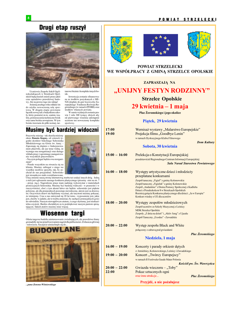 8 P O W I A T S T R Z E L E C K I Drugi etap ruszy³ POWIAT STRZELECKI WE WSPÓ£PRACY Z GMIN¥ STRZELCE OPOLSKIE ZAPRASZAJ¥ Uczniowie Zespo³u Szkó³ Ogól- tanowe bie¿nie i kompleks innych bo- nokszta³c¹cych w Strzelcach Opol- isk. czas s¹siedztwo prawdziwej budo- na ze rodków pozyskanych z ME- Jesieni¹ zesz³ego roku oddano im ropejskiego Funduszu Rozwoju Re- skich bêd¹ musieli znieæ przez jaki wy. Ale na pewno tego nie ¿a³uj¹! gionalnego (w ramach ZPORR) oraz W sumie wydanych zostanie pra- ³y, który pomieci m.in. szatnie, toa- 29 kwietnia 1 maja rodków w³asnych powiatu. Plac ¯eromskiego i jego okolice wie 1 mln 300 tysiêcy z³otych aby lety, pomieszczenia techniczne boisk od pierwszego wrzenia udostêpniæ boisko trawiaste do pi³ki no¿nej, tar- sportowy. oraz same boiska zewnêtrzne. W tym Strzelce Opolskie NiS (dop³aty do gier losowych), Eu- do u¿ytku nowoczesn¹ salê spor- tow¹. W drugim etapie powstanie UNIJNY FESTYN RODZINNY Inwestycja zostanie sfinansowa- ³¹cznik nowej sali z budynkiem szko- Pi¹tek, 29 kwietnia uczniom ten nowoczesny kompleks Musimy byæ bardziej widoczni Pracowity miesi¹c - tak okrela miniony NA 17:00 19:00 Wernisa¿ wystawy Malarstwo Europejskie Projekcja filmu Goodbye Lenin w ramach Dyskusyjnego Klubu Filmowego okres Danuta Kupny, od czterech ty- godni dyrektor Szkolnego Schroniska M³odzie¿owego na Górze w. Anny. - Dom Kultury Sobota, 30 kwietnia Zapoznajê siê dopiero z funkcjonowaniem placówki, ale juz teraz widzê, ¿e wymaga ona reorganizacji oraz du¿ego 15:00 16:00 wk³adu pracy i ogromnego zaanga¿owa- nia wszystkich pracowników. Prelekcja o Konstytucji Europejskiej przedstawiciel Regionalnego Centrum Informacji Europejskiej - Na czym polegaæ bêdzie owa reorgani- zacja? Sala Narad Starostwa Powiatowego - Przede wszystkim na otwarciu siê na klienta. Musimy zabiegaæ o niego we wszelkie mo¿liwe sposoby, tak, by ze- 16:00 18:00 chcia³ do nas przyje¿d¿aæ. Schronisko jest stosunkowo ma³o rozreklamowane. z nich jest og³oszenie naszego konkursu plastycznego (piszemy Wystêpy artystyczne dzieci i m³odzie¿y przeplatane konkursami Chcê zmieniæ nasz¹ stronê internetow¹; trzeba te¿ szukaæ innych dróg. Jedn¹ Zespó³ taneczny Figiel z gminy Kolonowskie nim na str. 7 - przyp. mg.). Nagrodzone prace mam nadziejê wykorzystaæ z materia³ach Zespó³ taneczny Figielek z gminy Kolonowskie promocyjnych Schroniska. Musimy byæ bardziej widoczni - w przenoni i w Zespó³ Andantino z Domu Pomocy Spo³ecznej z Kad³uba rzeczywistoci, choæ z tym akurat ³atwo nie bêdzie: schronisko jest piêknie po³o¿one, ale dla przejezdnych pozostaje niewidoczne, ukryte jest za drzewa- Dzieci z Przedszkola nr 8 w Strzelcach Opolskich ¿e istniejemy. Czas u nas zatrzyma³ siê 20 lat temu - wyposa¿enie jest, jakie Konkurs wiedzy o UE dla uczniów Rozstrzygniêcie Konkursu plastycznego dla dzieci: Ja w Europie mi. Oczywicie drzew nie bêdziemy wycinaæ, ale turystom musimy pokazaæ, jest, choæby w jadalni, ale to trzeba zmieniaæ, by zachêciæ potencjalnych goci do odwiedzin. Naszym niew¹tpliwym atutem, z czego s³yniemy, jest nieskazitelna czystoæ. Bardzo chcia³abym za to podziêkowaæ naszym paniom sprz¹- 18:00 20:00 MDK Strzelce Opolskie Wiosenne targi Zespo³y Z dnia na dzieñ i Aktiv Jung z Ujazdu Zespó³ Taneczny Exodus - Zawadzkie Oferta targowa budzi³a zainteresowanie zwiedzaj¹cych, ale prawdziwe t³umy gromadzi³y siê tuz przed losowaniem nagród dla publicznoci. Zw³aszcza g³ównej - telewizora. Szczêcie umiechnê³o siê do... Wystêpy zespo³ów m³odzie¿owych Zespó³ uczniów ze Szko³y Muzycznej z Lenicy taj¹cym. Takich atutów musimy mieæ wiêcej. 20:00 22:00 Wystêp zespo³u Black and White po³¹czony z zabaw¹ pod gwiazdami Plac ¯eromskiego Niedziela, 1 maja 16:00 19:00 Koncerty i parady orkiestr dêtych z: Jemielnicy, Kolonowskiego, Lenicy i Zawadzkiego 19:00 20:00 Koncert Twórcy Europejscy w ramach II Festiwalu Gaude Mater Polonia Koció³ pw. w. Wawrzyñca 20:00 22:00 22:00 ...pana Zenona Winiewskiego Gwiazda wieczoru Toby Pokaz sztucznych ogni oraz inne atrakcje... Przyjd, a nie po¿a³ujesz Plac ¯eromskiego