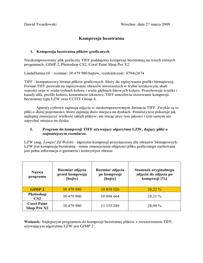 Wrocław, dnia 27 marca 2009 Dawid Twardowski Kompresja bezstratna 1. Kompresja bezstratna plików graficznych Nieskompresowany plik graficzny TIFF poddajemy kompresji bezstratnej na trzech różnych programach: GIMP 2, Photoshop CS2, Corel Paint Shop Pro X2. LindaDumas.tif – rozmiar: 38 479 980 bajtów, rozdzielczość: 4794x2674 TIFF - komputerowy format plików graficznych. Służy do zapisywania grafiki bitmapowej. Format TIFF pozwala na zapisywanie obrazów stworzonych w trybie kreskowym, skali szarości oraz w wielu trybach koloru i wielu głębiach bitowych koloru. Przechowuje ścieżki i kanały alfa, profile koloru, komentarze tekstowe. TIFF umożliwia stosowanie kompresji bezstratnej typu LZW oraz CCITT Group 4. Aparaty cyfrowe zapisują zdjęcia w nieskompresowanym formacie TIFF. Zwykle są to pliki o dużej pojemności, które zajmują dużo miejsca na dyskach. Poniższy test pokazuje jak najlepiej zmniejszyć wielkość takich plików, nie tracąc przy tym jakości i tym samym nie zapychać miejsca na dysku. I. Program do kompresji TIFF używający algorytmu LZW, dający pliki o najmniejszym rozmiarze. LZW (ang. Lempel Zif Welsh) - algorytm kompresji przeznaczony dla obrazów bitmapowych. LZW jest kompresją bezstratną - mimo zmniejszenia objętości pliku graficznego zachowana jest pełna informacja o geometrii i kolorystyce obrazu Nazwa programu GIMP 2 Photoshop CS2 Corel Paint Shop Pro X2 Rozmiar zdjęcia przed kompresją [bajty] Rozmiar zdjęcia po kompresji [bajty] Stosunek oryginalnego zdjęcia do zdjęcia po kompresji [%] 38 479 980 10 858 026 28,22 % 38 479 980 10 894 664 28,31 % 38 479 980 11 155 289 28,99 % Wniosek: Najlepszym programem do kompresji bezstratnej plików z rozszerzeniem TIFF, używającym algorytmu LZW jest GIMP 2. II. Algorytm kompresji bezstratnej na przykładzie formatu TIFF, dająy najmniejszy rozmiar. Nazwa programu Algorytm kompresji Rozmiar zdjęcia przed kompresją [bajty] Rozmiar zdjęcia po kompresji [bajty] Stosunek oryginalnego zdjęcia do zdjęcia po kompresji [%] GIMP 2 GIMP 2 Photoshop CS2 Photoshop CS2 Corel Paint Shop Pro X2 LZW Deflacja 38 479 980 38 479 980 10 858 026 9 829 290 28,22 % 25,54 % LZW 38 479 980 10 894 664 28,31 % ZIP 38 479 980 9 306 188 24,18 % LZW 38 479 980 11 155 289 28,99 % Wniosek: Programem umożliwiającym kompresję bezstratną o najmniejszym rozmiarze pliku (wśród testowanych programów) jest Photoshop CS2 używający algorytmu ZIP. 2. Kompresja bezstratna arkuszy kalkulacyjnych (Excel). Tworzymy dwa podobne arkusze kalkulacyjne w programie Excel, z tą różnicą, że w pierwszym są wpisane same litery, a w drugim same liczby. Oba pliki mają ten sam rozmiar. Później poddajemy każdy plik z osobna kompresji w programie WinRAR. Arkusz Rozmiar pliku przed kompresją [bajty] Rozmiar pliku po kompresji [bajty] Stosunek oryginalnego pliku do pliku po kompresji [%] Litery Liczby 14 366 14 366 1 803 1 687 12,55 % 11,74 % Wniosek: Arkusz kalkulacyjny z liczbami (chociaż posiadał więcej znaków) został skompresowany do mniejszego rozmiaru niż arkusz z literami. 3. Test programów do kompresji plików. Znajdujemy pliki. Dwa dokumenty (jeden o dużym rozmiarze i jeden o małym zawierające sam tekst), dwa zdjęcia (jedno o dużym rozmiarze i jedno o małym) oraz jeden plik .doc zawierający tekst razem ze zdjęciami. Wszystkie pliki poddajemy różnym kompresją w programach: 7-Zip, PowerArchiver, UltiamateZip, WinRAR oraz ZipGenius. Legenda: kolor żółty – najlepszy wynik kolor szary – najlepszy wynik w obrębie jednego programu kolor czerwony – najgorszy wynik Dokument doc Duży rozmiar pliku Nazwa programu 7-Zip PowerArchiver UltimateZip WinRAR ZipGenius Rozszerzenie Rozmiar pliku przed kompresją [bajty] Rozmiar pliku po kompresji [bajty] Stosunek oryginalnego pliku do pliku po kompresji [%] .zip 392 192 77 770 19,82957 % .7z 392 192 64 422 16,42614 % .bz2 392 192 69 514 17,72448 % .gz 392 192 77 678 19,80612 % .zip 392 192 85 370 21,7674 % .cab 392 192 71 226 18,161 % .7z 392 192 64 422 16,42614 % .lzh 392 192 90 441 23,06039 % .bh 392 192 85 178 21,71844 % .zip 392 192 85 252 21,73731 % .cab 392 192 84 292 21,49253 % .jar 392 192 85 252 21,73731 % .lzh 392 192 90 441 23,06039 % .7z 392 192 64 307 16,39682 % .bh 392 192 85 178 21,71844 % .zip 392 192 84 476 21,53945 % .rar 392 192 60 450 15,41337 % .zip 392 192 85 252 21,73731 % .cab 392 192 71 226 18,161 % .sqx 392 192 81 379 20,74979 % 3 3 2 1 UltimateZip PowerArchiver 7-Zip Program WinRAR ZipGenius Stosunek oryginalnego pliku do pliku po kompresji (dokument - duży rozmiar) .sqx .cab .zip .rar .zip .bh .7z .lzh .jar .cab .zip .bh .lzh .7z .cab .zip .gz .bz2 .7z .zip 0,00% Stosunek oryginalnego pliku do pliku po kompresji 5,00% 10,00% 15,00% 20,00% 25,00% Wartość procentowa Wniosek: Najlepszy wynik przy kompresji dużych plików tekstowych osiągnął program WinRAR z rozszerzeniem .rar (plik o rozmiarze 392 192 bajtów skompresował do 60 450 bajtów). Najgorszy wynik osiągnął program UltimataZip oraz PowerArchiver z rozszerzeniem .lzh (plik o rozmiarze 392 192 bajtów skompresowały do 90 441 bajtów). Ogólnie dokumenty zawierające tekst najlepiej kompresować do rozszerzeń .rar oraz .7z. doc Mały rozmiar pliku Nazwa programu 7-Zip PowerArchiver UltimateZip WinRAR ZipGenius Rozszerzenie Rozmiar pliku przed kompresją [bajty] Rozmiar pliku po kompresji [bajty] Stosunek oryginalnego pliku do pliku po kompresji [%] .zip 23 040 3 536 15,34722 % .7z 23 040 3 210 13,93229 % .bz2 23 040 3 633 15,76823 % .gz 23 040 3 446 14,9566 % .zip 23 040 3 820 16,57986 % .cab 23 040 3 472 15,06944 % .7z 23 040 3 210 13,93229 % .lzh 23 040 3 670 15,92882 % .bh 23 040 3 638 15,78993 % .zip 23 040 3 710 16,10243 % .cab 23 040 3 676 15,95486 % .jar 23 040 3 710 16,10243 % .lzh 23 040 3 696 16,04167 % .7z 23 040 3 227 14,00608 % .bh 23 040 3 638 15,78993 % .zip 23 040 3 532 15,32986 % .rar 23 040 3 710 16,10243 % .zip 23 040 3 710 16,10243 % .cab 23 040 
