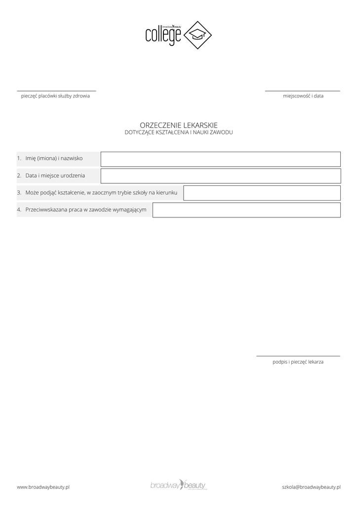 pieczęć placówki służby zdrowia miejscowość i data ORZECZENIE LEKARSKIE DOTYCZĄCE KSZTAŁCENIA I NAUKI ZAWODU 1. Imię (imiona) i nazwisko 2. Data i miejsce urodzenia 3. Może podjąć kształcenie, w zaocznym trybie szkoły na kierunku 4. Przeciwwskazana praca w zawodzie wymagającym podpis i pieczęć lekarza www.broadwaybeauty.pl [email protected]