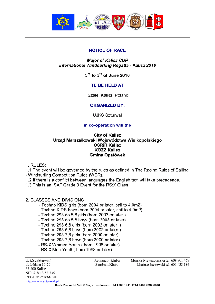 NOTICE OF RACE Major of Kalisz CUP International Windsurfing Regatta - Kalisz 2016 3rd to 5th of June 2016 TE BE HELD AT Szale, Kalisz, Poland ORGANIZED BY: UJKS Szturwał in co-operation wih the City of Kalisz Urząd Marszałkowski Województwa Wielkopolskiego OSRiR Kalisz KOZŻ Kalisz Gmina Opatówek 1. RULES: 1.1 The event will be governed by the rules as defined in The Racing Rules of Sailing - Windsurfing Competition Rules (WCR). 1.2 If there is a conflict between languages the English text will take precedence. 1.3 This is an ISAF Grade 3 Event for the RS:X Class 2. CLASSES AND DIVISIONS - Techno KIDS girls (born 2004 or later, sail to 4,0m2) - Techno KIDS boys (born 2004 or later, sail to 4,0m2) - Techno 293 do 5,8 girls (born 2003 or later ) - Techno 293 do 5,8 boys (born 2003 or later) - Techno 293 6,8 girls (born 2002 or later ) - Techno 293 6,8 boys (born 2002 or later ) - Techno 293 7,8 girls (born 2000 or later) - Techno 293 7,8 boys (born 2000 or later) - RS-X Women Youth ( born 1998 or later) - RS-X Men Youth( born 1998 or later) UJKS „Szturwał” ul. Łódzka 19-29 62-800 Kalisz NIP: 618-18-52-335 REGON: 250668320 http://www.szturwal.pl Komandor Klubu: Skarbnik Klubu: Monika NIewiadomska tel. 609 801 469 Mariusz Jackowski tel. 601 433 186 Bank Zachodni WBK SA, nr rachunku: 24 1500 1432 1214 3000 8786 0000 - RS-X Women - RS-X Men - Raceboard Women - Raceboard Men - Raceboard Masters A minimum of 5 competitors is required to constitute a division. 3. ENTRIES 3.1 All the competitors must contact with the organizer at [email protected] before the 15th of May to confirm their participation. Applications received later will cause increased entry fee of 10 PLN The entry fees will be paid at the moment of the registration in the Race Office. 4. ENTRY FEES: The entry fees are: Techno KIDS – 40 PLN, Techno – 60 PLN , RS:X and Raceboard- 70PLN 5. ENTRY: The following shall be presented upon registration: - Original Regatta Entry Form. It will be available on the event website www.szturwal.pl from the 1st of April 2016 - Payment of the entry fees. - Federation License (for the Polish sailors) - Evidence of valid third party liability insurance 6. RACE FORMAT 6.1 A maximum of 11 races shall be sailed. No more than 4 races per day will be sailed. The event will be valid if 3 or more races are completed. 6.2 Different classes may race together depending on entry numbers. 6.3 On the 05st of June the last warning signal can’t be given later than at 14.30hrs 7. SCHEDULE Thursday 02nd of June – Arrival Friday 03rd of June : 08.00-09.30 Registration 11.00 – Opening Ceremony 12.00-17.00 Racing Saturday 04th of June : UJKS „Szturwał” ul. Łódzka 19-29 62-800 Kalisz NIP: 618-18-52-335 REGON: 250668320 http://www.szturwal.pl Komandor Klubu: Skarbnik Klubu: Monika NIewiadomska tel. 609 801 469 Mariusz Jackowski tel. 601 433 186 Bank Zachodni WBK SA, nr rachunku: 24 1500 1432 1214 3000 8786 0000 10.00-16.00 Racing 18.00 – Barbecue Sunday: 05st of June : 10.00 Racing 14.30 Last warning signal 16.30 Prize Giving Ceremony 8. SAILING INSTRUCTIONS The sailing instructions will be available upon registration. 9. IMAGE RIGHTS AND ADVERTISING Boards may be required to display advertising chosen and supplied by the organizing authority. The competitors, in registering for the event grant to the Organising Authority free from charge and in perpetuity the competitors image rights, defined as the right and license to us the name, likeness, photographic or other image of any crew member involved in the Major of Kalisz CUP International Windsurfing Regatta. 10. PRIZES TOTAL SUM OF AWARDS: 5.000,00 Euro 11. DISCLAIMER OF LIABILITY Competitors take part in all races at their own risk. The Organising Authority, or any of their officials or representatives or sponsors or their officials or representatives are not responsible, under any circumstances, for any damage, loss or injury either ashore or on the water either to persons or equipment, which may result. Participation in this event, supporting events and in each race in them is at the sole discretion of the sailor and at his/her own risk.. 12. ACCOMODATION The organizer can support all foreign participants to book low fare hotels and meals. Camper vans can be parked at competition site free of charge. For any further information please contact: Uczniowski Jacht Klub Sportowy „ Szturwał” ul. Łódzka 19-29, 62-800 Kalisz,Poland e.mail- [email protected] tel: + 48 601433186 www.szturwal.pl www.facebook.com/szturwalkalisz UJKS „Szturwał” ul. Łódzka 19-29 62-800 Kalisz NIP: 618-18-52-335 REGON: 250668320 http://www.szturwal.pl Komandor Klubu: Skarbnik Klubu: Monika NIewiadomska tel. 609 801 469 Mariusz Jackowski tel. 601 433 186 Bank Zachodni WBK SA, nr rachunku: 24 1500 1432 1214 3000 8786 0000