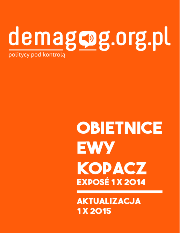 OBIETNICE EWY KOPACZ Exposé 1 X 2014 aktualizacja 1 X 2015 SPIS TREŚCI . 1. NOTA METODOLOGICZNA 3 5 8 9 9 11 15 18 24 25 27 30 36 37 39 39 42 2. PODSUMOWANIE 3. OBIETNICE EWY KOPACZ Administracja Edukacja Finanse Gospodarka Infrastruktura Kultura Nauka Obronność Praca i polityka społeczna Rolnictwo Sprawy zagraniczne Sprawiedliwość Zdrowie 4. KONTAKT . NOTA METODOLogiczna 3 Analizie fact-check zostały poddane 52 obietnice premier Ewy Kopacz wygłoszone podczas exposé w dniu 1 października 2015 roku. Wypowiedzi te zostały zebrane, pogrupowane, a następnie sprawdzone pod kątem stanu ich realizacji na dzień 30 września 2015 roku. W analizie posłużono się 4 kategoriami: obietnica została spełniona (prawda), obietnica nie została spełniona (fałsz), obietnica jest realizowana (w trakcie) oraz obietnica jest niemożliwa do zweryfikowania na podstawie danych zastanych (nieweryfikowalne). Obietnice uznane za spełnione to te, które zostały zrealizowane na dzień 30 września 2015 roku, nawet jeśli pojawiły się opóźnienia względem terminu przewidzianego w exposé. Za niespełnione zostały uznane te obietnice, które mimo terminu wskazanego przez Ewę Kopacz nie zostały zrealizowane i wciąż pozostające na etapie konsultacji. Wszelkie obietnice zakwalifikowane jako "w trakcie" są przedmiotem procesu legislacyjnego lub trwa ich realizacja. obecnie Każdej kwalifikacji towarzyszy dokładna analiza dokumentów z opisem konkretnej obietnicy. 4 PODSUMOWANIE 5 2 37 NIESPEŁNIONE SPEŁNIONE 52 OBIETNICE 12 1 W TRAKCIE NIEWERYFIKOWALNE Porównanie wyników raportów dot. expose: OBIETNICE SPEŁNIONE NIESPEŁNIONE W TRAKCIE NIEWERYFIKOWALNE 29.06.2015 24 3 24 1 30.09.2015 37 2 12 1 W porównaniu do raportu z 07.2015 nastąpił wzrost zrealizowanych obietnic o 25 pkt. proc. z 46 do 71 procent. 6 Porównanie stanu realizacji obietnic pod względem przyporządkowanych im grup: GRUPY SPEŁNIONE NIESPEŁNIONE W TRAKCIE NIEWERYFIKOWALNE RAZEM ADMINISTRACJA 1 3 6 1 4 1 2 4 7 1 1 - 1 3 5 1 1 - - 1 4 6 4 10 2 3 5 7 3 - 1 - 1 1 4 1 4 - - - 1 4 EDUKACJA FINANSE GOSPODARKA INFRASTRUKTURA KULTURA NAUKA OBRONNOŚĆ PRACA I POLITYKA SPOŁECZNA ROLNICTWO SPRAWY ZAGRANICZNE SPRAWIEDLIWOŚĆ ZDROWIE NIESPEŁNIONE - kodeks budowlany - publikacja planu bezpieczeństwa państwa W TRAKCIE - dofinansowanie do monitoringu w szkołach - 25 mld dla polskiej przedsiębiorczości - rentowne górnictwo - wspieranie nowoczesnych technologii węglowych - drogi ekspresowe w 2015 - program budowy dróg 2014-2020 - nowe składy pociągów w 2015 - modernizacja taboru PKP Intercity - inwestycje w porty - program edukacyjny dla budowania nowoczesnego patriotyzmu - 2% PKB na naukę - Fundusz Stabilizacji Dochodów Rolniczych 7 OBIETNICE EWY KOPACZ 8 Administracja Regionalny System Ostrzegania 1. Nie ma żadnego powodu, by każdy Polak posiadający telefon komórkowy, czy oglądający telewizję publiczną nie mógł czuć się bezpieczniejszy, dzięki świadomości, że państwo polskie niezwłocznie powiadomi go o potencjalnych zagrożeniach i klęskach żywiołowych. Mój rząd wprowadzi taki system. OBIETNICA ZOSTAŁA SPEŁNIONA Regionalny System Ostrzegania działa od 1 stycznia 2015 r. Aplikacja mobilna RSO jest dostępna od maja 2015 r. Natomiast od 1 lipca komunikaty RSO będą rozsyłane w postaci smsów jak i komunikatów na antenach TVP. Edukacja Dofinansowanie do monitoringu w szkołach 2. Chciałabym, aby samorządy we współpracy z rodzicami mogły decydować o zakresie monitoringu w szkołach. Dofinansujemy ten projekt w wysokości 50% kosztów zakupu instalacji monitoringu. Pozostałe 50% zapewnią samorządy. Chciałabym, aby taki program działał od początku 2016 roku. OBIETNICA W TRAKCIE REALIZACJI Ministerstwo Edukacji Narodowej zajmowało się opracowaniem programu “Bezpieczna+”. Do jego celów należy m.in. poprawa bezpieczeństwa uczniów, a w jego uzasadnieniu jednym ze źródeł jest expose Premier RP. Zgodnie ze wstępnymi założeniami projektu w latach 2016-2018 organom prowadzącym szkoły miało być udzielone wsparcie finansowe ze środków budżetu państwa na realizację zadań związanych z tworzeniem, wdrożeniem i efektywnym wykozystaniem monitoringu szkolnego (§2 ust. 2 pkt 2). 9 Jednak w późniejszej wersji projektu przepisy poświęcone monitoringowi zostały wykreślone. Spotkał się bowiem z licznymi zastrzeżeniami m.in. Rzecznika Praw Dziecka, Generalnego Inspektora Ochrony Danych Osobowych oraz organizacji pozarządowych (Panoptykon). Dnia 23 czerwca 2015 r. Rada Ministrów przyjęła uchwałę w sprawie ustanowienia programu bez przepisów dot. monitoringu. Bezpłatny podręcznik w 2015 roku 3. W przyszłym roku [2015] będzie bezpłatny podręcznik do drugich i czwartych klas szkół podstawowych i pierwszych klas gimnazjów. OBIETNICA ZOSTAŁA SPEŁNIONA Jak informuje Ministerstwo Edukacji Narodowej w roku szkolnym 2015/2016 dyrektorzy szkół mają obowiązek zapewnić uczniom klasy I, II i IV szkoły podstawowej oraz klasy I gimnazjum bezpłatny dostęp do podręczników, materiałów edukacyjnych lub materiałów ćwiczeniowych. Szkoły otrzymały z tego tytułu fundusze, które zostały przeznaczone na zakup podręczników i ćwiczeń do przedmiotów obowiązkowych. Bezpłatny podręcznik w 2017 roku 4. Wszystkie klasy szkół podstawowych i gimnazjalnych zaopatrzone zostaną w bezpłatne podręczniki i ćwiczenia do 2017 roku. OBIETNICA ZOSTAŁA SPEŁNIONA Ustawa z dnia 30 maja 2014 r. o zmianie ustawy o systemie oświaty oraz niektórych innych ustaw w art. 9 zakłada, że prawo do bezpłatnego dostępu do podręczników, materiałów edukacyjnych lub materiałów ćwiczeniowych wszyscy uczniowie szkół podstawowych i gimnazjów uzyskają w roku szkolnym 2017/2018. 10 Program odbudowy szkolnictwa zawodowego 5. Jeszcze w tym roku Minister Edukacji rozpocznie wdrażanie programu odbudowy szkolnictwa zawodowego we współpracy z przedsiębiorcami. O