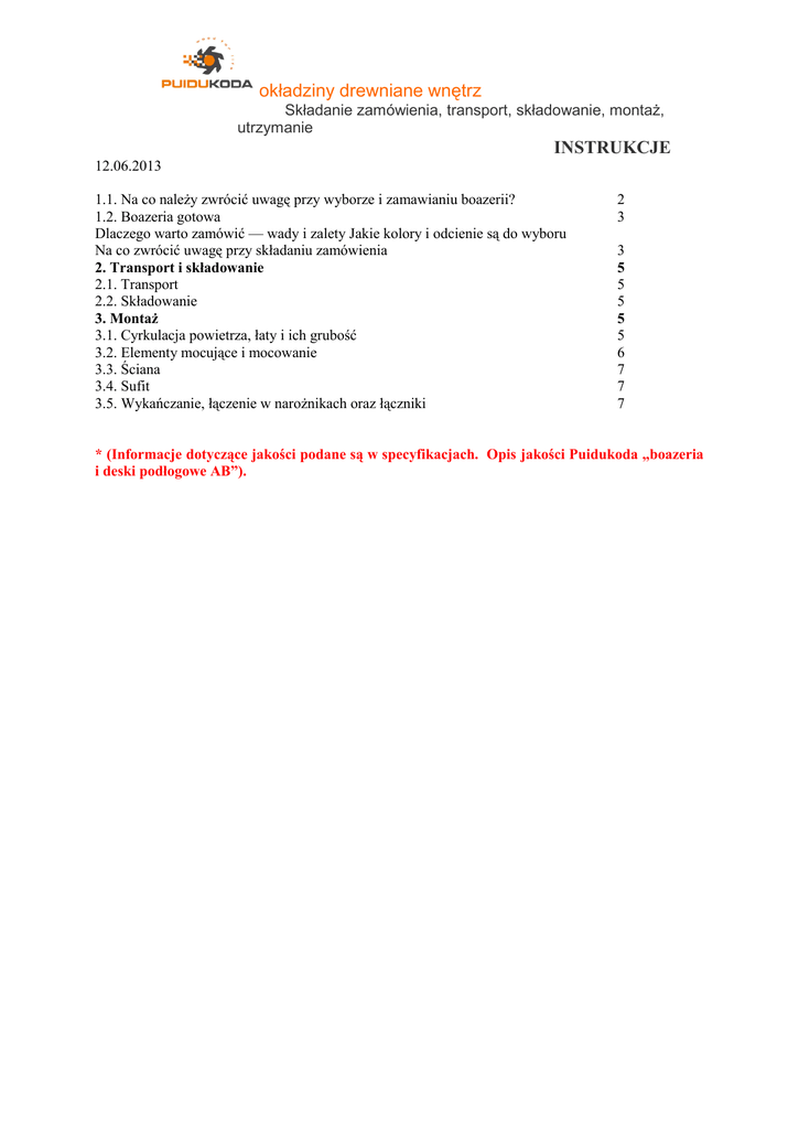 okładziny drewniane wnętrz Składanie zamówienia, transport, składowanie, montaż, utrzymanie INSTRUKCJE 12.06.2013 1.1. Na co należy zwrócić uwagę przy wyborze i zamawianiu boazerii? 1.2. Boazeria gotowa Dlaczego warto zamówić — wady i zalety Jakie kolory i odcienie są do wyboru Na co zwrócić uwagę przy składaniu zamówienia 2. Transport i składowanie 2.1. Transport 2.2. Składowanie 3. Montaż 3.1. Cyrkulacja powietrza, łaty i ich grubość 3.2. Elementy mocujące i mocowanie 3.3. Ściana 3.4. Sufit 3.5. Wykańczanie, łączenie w narożnikach oraz łączniki 2 3 3 5 5 5 5 5 6 7 7 7 * (Informacje dotyczące jakości podane są w specyfikacjach. Opis jakości Puidukoda „boazeria i deski podłogowe AB”). okładziny drewniane wnętrz Składanie zamówienia, transport, składowanie, montaż, utrzymanie INSTRUKCJE 1. Składanie zamówienia 1.1. Na co należy zwrócić uwagę przy wyborze i zamawianiu boazerii? • Rodzaj drewna W naszej ofercie dostępne są boazerie wykonane z drewna świerka pospolitego (Picea abies) i sosny zwyczajnej (Pinus sylvestris). Przy wyborze boazerii należy uwzględnić gatunek drewna z uwagi na różne cechy świerka i sosny. Drewno sosnowe jest ciemniejsze, czerwonawe, a z czasem ciemnieje jeszcze bardziej pod wpływem działania promieni ultrafioletowych. Można temu zaradzić poprzez pokrycie powierzchni lakierem zapewniającym ochronę przed promieniowaniem ultrafioletowym, ale nie można tego całkowicie wyeliminować. Podczas gdy czerwonawa barwa w twardzieli i bielu sosny ma jaśniejszy odcień, drewno świerkowe cechuje się wielobarwnością i zmienną szerokością czerwono-żółtej faktury. Ilość sęków jest niższa niż w świerku, ale mają one większą średnicę i często występują sęki czarne i obrączkowe. Pełne sęki czarne i obrączkowe w litym drewnie sosnowym są nieuniknione i nie uważa się ich za wady, którymi są jedynie otwory po sękach lub sęki martwe. Sosna w swojej naturalnej postaci (lub powleczona lakierem bezbarwnym) bądź też z półprzezroczystym białym wykończeniem powierzchni doskonale pasuje do większych lub jasnych pomieszczeń, w których ten ciemny odcień nie działa przytłaczająco. Drewno sosnowe można również malować farbą do pokrywania powierzchni, gdyż sęki sosny są mniej zwarte, a tym samym nie pękają podczas suszenia i dalszej obróbki. W związku z tym po pomalowaniu farbą do pokrywania powierzchni okładzina sosnowa ma znacznie mniej zauważalnych wad powierzchniowych. Drewno świerkowe ma jaśniejszy odcień i zachowuje swoją barwę przez dłuższy czas, żółknąc jedynie nieznacznie (można temu zapobiec, pokrywając powierzchnię lakierem zapewniającym ochronę przed promieniowaniem ultrafioletowym). Świerk ma więcej sęków niż sosna, ale mają one odcień neutralny; bardzo nieliczne są mniejsze sęki czarne (perłowe) i obrączkowe lub brak ich w ogóle. Świerk jako drewno jasne doskonale pasuje w swojej naturalnej postaci (lub powleczony lakierem bezbarwnym) bądź też z półprzezroczystym białym wykończeniem powierzchni do małych i słabo oświetlonych pomieszczeń. Ponieważ pęknięcia w sękach wskutek wysychania są cechą charakterystyczną świerka, okładziny świerkowe nie nadają się raczej do malowania farbą do pokrywania powierzchni, gdyż pęknięcia sęków powiększają się jeszcze bardziej pod farbą do pokrywania powierzchni. • Profile Kształt lub profil zamawianych okładzin należy wybrać w oparciu o architekturę i miejscu zastosowania w budynku. Okładziny można zamontować na suficie, na ścianie w kierunku pionowym lub poziomym bądź też pokrywając ścianę do połowy wysokości tak zwanym półpanelem. Lub też jedna ściana pomieszczenia może zostać pokryta okładziną dla podkreślenia charakteru wnętrza. Jeśli pożądane rozwiązanie ma być możliwie jak najbardziej neutralne i stonowane, można zamówić okładzinę wewnętrzną ze sfazowanymi krawędziami, w której po zmontowaniu dwóch desek pozostanie między nimi niewielkie wgłębienie. Profil ten można następnie polakierować lub pomalować na biało, jak wykończenie uniwersalne i neutralne, lecz także naturalny wystrój jest odpowiedni do wielu wnętrz. Na przykład do saun doskonale nadaje się tak zwany profil STP o zaokrąglonych krawędziach, w którym znajduje się niewielka szczelina, o szerokości około 8–10 mm, ułatwiająca czyszczenie przestrzeni między dwiema deskami. • Sugerowane grubości i szerokości Im grubsza boazeria, tym bardziej stały jest jej ustrój wilgotnościowy. okładziny drewniane wnętrz Składanie zamówienia, transport, składowanie, montaż, utrzymanie INSTRUKCJE (zmiany objętości spowodowane wilgocią są mniejsze). Tak więc powierzchnie wykończone grubszymi okładzinami wewnętrznymi są stabilniejsze. Zgodnie z normami skandynawskimi sugerowana minimalna grubość okładziny wewnętrznej wynosi 14–15 mm, zwłaszcza w przypadku stosowania w pomieszczeniach wilgotnych. Można również zastosować cieńszą, popularną i tańszą okładzinę o grubości 9–12 mm, lecz należy wziąć pod uwagę ewentualne zwiększenie ryzyka wystąpienia problemów spowodowanych przez częstsze i większe zmiany objętości (pęknięcia, uszkodzenia lakieru i farby, wklęśnięcia itp.). W naszej ofercie są dostępne okładziny w szerokościach 96 mm i 121 mm, niektóre wyroby można zamówić w szerokościach 146 mm i 238 mm. Zaletą węższej deski jest mniejsze ryzyko wygięcia i pęknięcia podczas eksploatacji. Im szersza deska, tym większe ryzyko, że wygnie się i pęknie po zamontowaniu w wyniku zmian temperatury otoczenia. Ryzyko wygięcia i pęknięcia jest bardzo niskie również w przypadku szerokiej okładziny, sklejonej z kilku płyt laminowanych (238 mm). • Jak obliczyć koszt materiałów W zależności od charakterystyki architektonicznej budynku koszt materiałów można obliczyć na