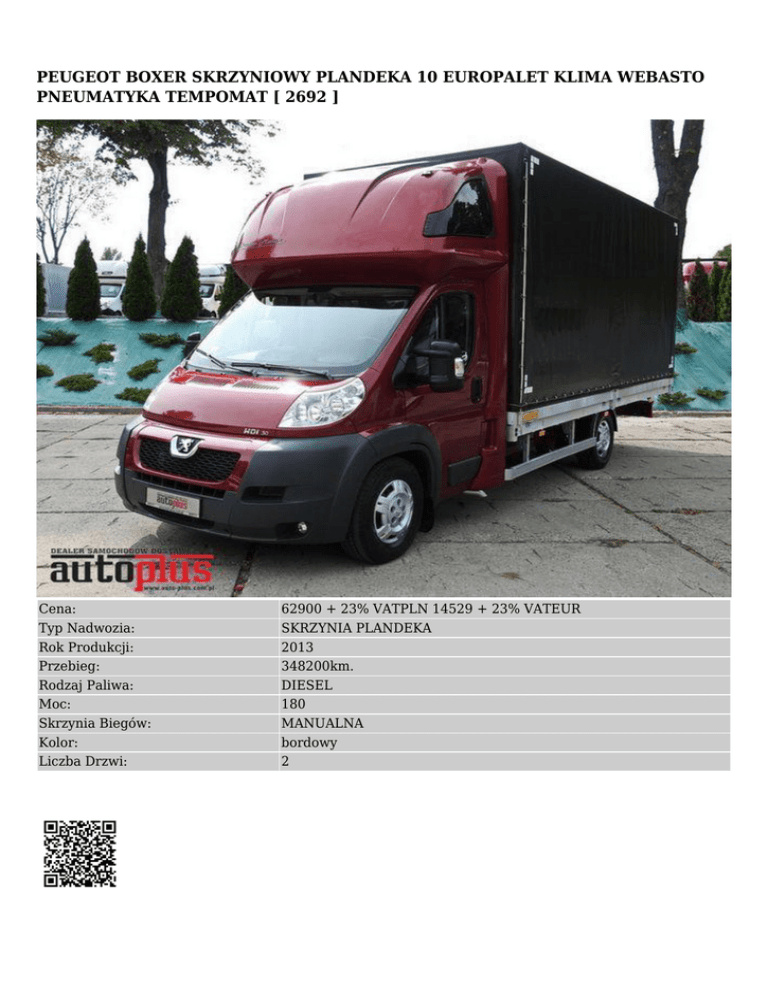 PEUGEOT BOXER SKRZYNIOWY PLANDEKA 10 EUROPALET KLIMA WEBASTO PNEUMATYKA TEMPOMAT [ 2692 ] Cena: Typ Nadwozia: Rok Produkcji: Przebieg: Rodzaj Paliwa: Moc: Skrzynia Biegów: Kolor: Liczba Drzwi: 62900 + 23% VATPLN 14529 + 23% VATEUR SKRZYNIA PLANDEKA 2013 348200km. DIESEL 180 MANUALNA bordowy 2 INFORMACJE DODATKOWE ● ● ● ● bezwypadkowy zarejestrowany w polsce stan bardzo dobry Kupiony w salonie w Polsce WYPOSAŻENIE ● ● ● ● ● ● ● ● ● ● ● ● ● ABS centralny zamek elektryczne lusterka immobiliser klimatyzacja komputer kontrola trakcji radio / cd tempomat wspomaganie kierownicy elektryczne szyby ogrzewanie postojowe halogeny OPIS NUMER OFERTY – 2692 Kupiony w Polsce wzorowo utrzymany Peugeot Boxer plandeka z kabiną sypialną 10 europalet. Rok produkcji 2013. Auto jest bezwypadkowe w pełni sprawne. Boxer w bardzo dobrym stanie technicznym i wizualnym. Wnętrze wygląda jak rewelacyjnie. Dynamiczny silnik pracuje równo i cicho. Skrzynia biegów działa precyzyjnie. Auto wyposażone w silnik 3.0 HDI o mocy 180KM. Wyjątkowo wytrzymała jednostka napędowa. Dodatkowo auto posiada webasto, automatyczną klimatyzację, pneumatyczne zawieszenie oraz tempomat. Boxer stoi na nowych oponach. Wyposażenie: - ABS, ASR - poduszka powietrzna kierowcy - klimatyzacja - webasto - tempomat - pneumatyczne zawieszenie - wspomaganie kierownicy - wielofunkcyjna kierownica - centralny zamek - immobiliser - kierownica regulowana - 6 biegów - 2 miejsca - elektryczne szyby i lusterka - podłokietnik - kabina sypialna - 10 europalet - halogeny - nowe opony - wymiary powierzchni ładunkowej: długość / 488 cm / szerokość / 220 cm / wysokość /235 cm/ - Podana cena jest CENĄ NETTO!!. Wystawiamy Fakturę VAT - MOŻLIWOŚĆ KREDYTOWANIA LUB LEASINGOWANIA, 100% WARTOŚCI AUTA, PROCEDURA UPROSZCZONA, WYMAGANE DOKUMENTY NIP, REGON, WPIS DO EWIDENCJI, DOWÓD OSOBISTY - WIĘCEJ INFORMACJI NA STRONIE www.auto-plus.com.pl - NINIEJSZE OGŁOSZENIE JEST WYŁĄCZNIE INFORMACJĄ HANDLOWĄ I NIE STANOWI OFERTY W MYŚL art. 66, § 1. KODEKSU CYWILNEGO. SPRZEDAJĄCY NIE ODPOWIADA ZA EWENTUALNE BŁĘDY LUB NIEAKTUALNOŚĆ OGŁOSZENIA.