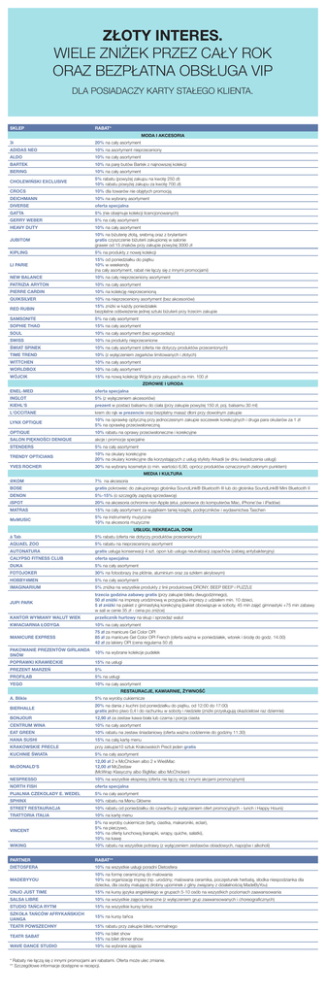 ZŁOTY INTERES. WIELE ZNIŻEK PRZEZ CAŁY ROK ORAZ BEZPŁATNA OBSŁUGA VIP DLA POSIADACZY KARTY STAŁEGO KLIENTA. SKLEP RABAT* 3i 20% na cały asortyment ALDO 10% na cały asortyment ADIDAS NEO BARTEK BERING CHOLEWIŃSKI EXCLUSIVE CROCS DEICHMANN DIVERSE GATTA GERRY WEBER HEAVY DUTY MODA I AKCESORIA 10% na asortyment nieprzeceniony 10% na parę butów Bartek z najnowszej kolekcji 10% na cały asortyment 5% rabatu (powyżej zakupu na kwotę 250 zł) 10% rabatu powyżej zakupu za kwotę 700 zł) 10% dla towarów nie objętych promocją 10% na wybrany asortyment oferta specjalna 5% (nie obejmuje kolekcji licencjonowanych) 5% na cały asortyment 10% na cały asortyment JUBITOM 10% na biżuterię złotą, srebrną oraz z brylantami gratis czyszczenie biżuterii zakupionej w salonie grawer od 15 znaków przy zakupie powyżej 3000 zł KIPLING 5% na produkty z nowej kolekcji LI PARIE 15% od poniedziałku do piątku 10% w weekendy (na cały asortyment, rabat nie łączy się z innymi promocjami) NEW BALANCE 10% na cały nieprzeceniony asortyment PIERRE CARDIN 10% na kolekcję nieprzecenioną PATRIZIA ARYTON QUIKSILVER 10% na cały asortyment 10% na nieprzeceniony asortyment (bez akcesoriów) RED RUBIN 15% zniżki w każdy poniedziałek bezpłatne odświeżenie jednej sztuki biżuterii przy trzecim zakupie SAMSONITE 5% na cały asortyment SOUL 10% na cały asortyment (bez wyprzedaży) SOPHIE THAO SWISS ŚWIAT SPINEK TIME TREND WITTCHEN WORLDBOX WÓJCIK 15% na cały asortyment 10% na produkty nieprzecenione 10% na cały asortyment (oferta nie dotyczy produktów przecenionych) 10% (z wyłączeniem zegarków limitowanych i złotych) 10% na cały asortyment 10% na cały asortyment 15% na nową kolekcję Wójcik przy zakupach za min. 100 zł ZDROWIE I URODA ENEL-MED oferta specjalna KIEHL'S prezent w postaci balsamu do ciała (przy zakupie powyżej 150 zł, poj. balsamu 30 ml) INGLOT L'OCCITANE LYNX OPTIQUE OPTIQUE SALON PIĘKNOŚCI DENIQUE STENDERS TRENDY OPTICIANS YVES ROCHER 5% (z wyłączeniem akcesoriów) krem do rąk w prezencie oraz bezpłatny masaż dłoni przy dowolnym zakupie 10% na oprawkę optyczną przy jednoczesnym zakupie soczewek korekcyjnych i druga para okularów za 1 zł 5% na oprawkę przeciwsłoneczną 10% rabatu na oprawy przeciwsłoneczne i korekcyjne akcje i promocje specjalne 5% na cały asortyment 10% na okulary korekcyjne 20% na okulary korekcyjne dla korzystających z usług stylisty Arkadii (w dniu świadczenia usługi) 30% na wybrany kosmetyk (o min. wartości 6,90, oprócz produktów oznaczonych zielonym punktem) MEDIA I KULTURA @KOM 7% na akcesoria DENON 5%-15% (o szczegóły zapytaj sprzedawcę) BOSE iSPOT MATRAS gratis pokrowiec do zakupionego głośnika SoundLink® Bluetooth III lub do głośnika SoundLink® Mini Bluetooth II 20% na akcesoria ochronne non Apple (etui, pokrowce do komputerów Mac, iPhone’ów i iPadów) 15% na cały asortyment za wyjątkiem taniej książki, podręczników i wydawnictwa Taschen MxMUSIC 5% na instrumenty muzyczne 10% na akcesoria muzyczne à Tab 5% rabatu (oferta nie dotyczy produktów przecenionych) AUTONATURA gratis usługa konserwacji 4 szt. opon lub usługa neutralizacji zapachów (zabieg antybakteryjny) AQUAEL ZOO CALYPSO FITNESS CLUB DUKA FOTOJOKER HOBBY4MEN IMAGINARIUM USŁUGI, REKREACJA, DOM 5% rabatu na nieprzeceniony asortyment oferta specjalna 5% na cały asortyment 30% na fotoobrazy (na płótnie, aluminium oraz za szkłem akrylowym) 5% na cały asortyment 5% zniżka na wszystkie produkty z linii produktowej DRONY, BEEP BEEP i PUZZLE JUPI PARK trzecia godzina zabawy gratis (przy zakupie biletu dwugodzinnego), 50 zł zniżki na imprezę urodzinową w przypadku imprezy z udziałem min. 10 dzieci, 5 zł zniżki na pakiet z gimnastyką korekcyjną (pakiet obowiązuje w soboty, 45 min zajęć gimnastyki +75 min zabawy w sali w cenie 35 zł - cena po zniżce) KANTOR WYMIANY WALUT WIEK przelicznik hurtowy na skup i sprzedaż walut MANICURE EXPRESS 75 zł za manicure Gel Color OPI 85 zł za manicure Gel Color OPI French (oferta ważna w poniedziałek, wtorek i środę do godz. 14.00) 42 zł za lakiery OPI (cena regularna 50 zł) KWIACIARNIA ŁODYGA PAKOWANIE PREZENTÓW GIRLANDA SNÓW 10% na cały asortyment 10% na wybrane kolekcje pudełek POPRAWKI KRAWIECKIE 15% na usługi PROFILAB 5% na usługi PREZENT MARZEŃ YEGO A. Blikle BIERHALLE BONJOUR CENTRUM WINA EAT GREEN HANA SUSHI KRAKOWSKIE PRECLE KUCHNIE ŚWIATA 5% 10% na cały asortyment RESTAURACJE, KAWIARNIE, ŻYWNOŚĆ 5% na wyroby cukiernicze 20% na dania z kuchni (od poniedziałku do piątku, od 12:00 do 17:00) gratis jedno piwo 0,4 l do rachunku w soboty i niedziele (zniżki przysługują okazicielowi raz dziennie) 12,90 zł za zestaw kawa biała lub czarna i porcja ciasta 10% na cały asortyment 10% rabatu na zestaw śniadaniowy (oferta ważna codziennie do godziny 11.30) 15% na całą kartę menu przy zakupie10 sztuk Krakowskich Precli jeden gratis 5% na cały asortyment McDONALD'S 12,00 zł 2 x McChicken albo 2 x WieśMac 12,00 zł McZestaw (McWrap Klasyczny albo BigMac albo McChicken) NESPRESSO 10% na wszystkie ekspresy (oferta nie łączy się z innymi akcjami promocyjnymi) PIJALNIA CZEKOLADY E. WEDEL 5% na cały asortyment NORTH FISH SPHINX STREET RESTAURACJA TRATTORIA ITALIA VINCENT WIKING oferta specjalna 10% rabatu na Menu Główne 10% rabatu od poniedziałku do czwartku (z wyłączeniem ofert promocyjnych - lunch i Happy Hours) 10% na kartę menu 5% na wyroby cukiernicze (tarty, ciastka, makaroniki, eclair), 5% na pieczywo, 10% na ofertę lunchową (kanapki, wrapy, quiche, sałatki), 10% na kawę 10% rabatu na wszystkie potrawy (z wyłączeniem zestawów obiadowych, napojów i alkoholi) PARTNER RABAT** MADEBYYOU 10% na formę ceramiczną do malowania 10% na organizację imprez (np. urodziny; malowana ceramika, poczęstunek herbatą, słodka niespodzianka dla dziecka, dla osoby malującej drobny upominek z gliny związany z działalnością MadeByYou) ONJO JUST TIME 