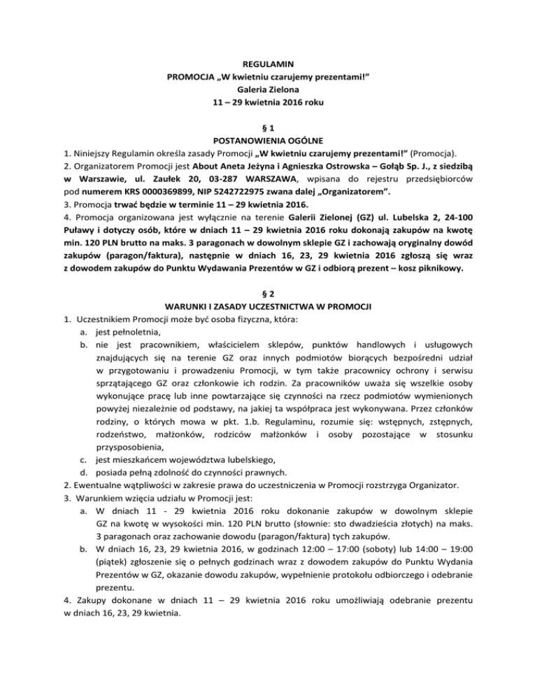 REGULAMIN PROMOCJA „W kwietniu czarujemy prezentami!” Galeria Zielona 11 – 29 kwietnia 2016 roku §1 POSTANOWIENIA OGÓLNE 1. Niniejszy Regulamin określa zasady Promocji „W kwietniu czarujemy prezentami!” (Promocja). 2. Organizatorem Promocji jest About Aneta Jeżyna i Agnieszka Ostrowska – Gołąb Sp. J., z siedzibą w Warszawie, ul. Zaułek 20, 03-287 WARSZAWA, wpisana do rejestru przedsiębiorców pod numerem KRS 0000369899, NIP 5242722975 zwana dalej „Organizatorem”. 3. Promocja trwać będzie w terminie 11 – 29 kwietnia 2016. 4. Promocja organizowana jest wyłącznie na terenie Galerii Zielonej (GZ) ul. Lubelska 2, 24-100 Puławy i dotyczy osób, które w dniach 11 – 29 kwietnia 2016 roku dokonają zakupów na kwotę min. 120 PLN brutto na maks. 3 paragonach w dowolnym sklepie GZ i zachowają oryginalny dowód zakupów (paragon/faktura), następnie w dniach 16, 23, 29 kwietnia 2016 zgłoszą się wraz z dowodem zakupów do Punktu Wydawania Prezentów w GZ i odbiorą prezent – kosz piknikowy. §2 WARUNKI I ZASADY UCZESTNICTWA W PROMOCJI 1. Uczestnikiem Promocji może być osoba fizyczna, która: a. jest pełnoletnia, b. nie jest pracownikiem, właścicielem sklepów, punktów handlowych i usługowych znajdujących się na terenie GZ oraz innych podmiotów biorących bezpośredni udział w przygotowaniu i prowadzeniu Promocji, w tym także pracownicy ochrony i serwisu sprzątającego GZ oraz członkowie ich rodzin. Za pracowników uważa się wszelkie osoby wykonujące pracę lub inne powtarzające się czynności na rzecz podmiotów wymienionych powyżej niezależnie od podstawy, na jakiej ta współpraca jest wykonywana. Przez członków rodziny, o których mowa w pkt. 1.b. Regulaminu, rozumie się: wstępnych, zstępnych, rodzeństwo, małżonków, rodziców małżonków i osoby pozostające w stosunku przysposobienia, c. jest mieszkańcem województwa lubelskiego, d. posiada pełną zdolność do czynności prawnych. 2. Ewentualne wątpliwości w zakresie prawa do uczestniczenia w Promocji rozstrzyga Organizator. 3. Warunkiem wzięcia udziału w Promocji jest: a. W dniach 11 - 29 kwietnia 2016 roku dokonanie zakupów w dowolnym sklepie GZ na kwotę w wysokości min. 120 PLN brutto (słownie: sto dwadzieścia złotych) na maks. 3 paragonach oraz zachowanie dowodu (paragon/faktura) tych zakupów. b. W dniach 16, 23, 29 kwietnia 2016, w godzinach 12:00 – 17:00 (soboty) lub 14:00 – 19:00 (piątek) zgłoszenie się o pełnych godzinach wraz z dowodem zakupów do Punktu Wydania Prezentów w GZ, okazanie dowodu zakupów, wypełnienie protokołu odbiorczego i odebranie prezentu. 4. Zakupy dokonane w dniach 11 – 29 kwietnia 2016 roku umożliwiają odebranie prezentu w dniach 16, 23, 29 kwietnia. 5. Promocja dotyczy zakupu wszelkich produktów lub usług, z wyłączeniem artykułów alkoholowych, wyrobów alkoholowych, leków na receptę oraz wydatków na kupony loteryjne i transakcji kantorowych. 6. W przypadku powzięcia przez Organizatora wątpliwości co do autentyczności paragonu/faktury wydanie prezentu może zostać wstrzymane do momentu potwierdzenia oryginalności lub pochodzenia dowodu zakupu. 7. Za maksymalnie trzy dowody zakupu na łączną kwotę min. 120 PLN, Organizator przyznaje jeden prezent. 8. Uczestnikiem Promocji można być maksymalnie raz w ciągu jednego dnia trwania akcji wydawania prezentów (odebrać jeden prezent w ciągu jednego dnia trwania akcji wydawania prezentów) tj. w dniach 16, 23, 29 kwietnia 2016. 9. Pracownik Organizatora w Punkcie Wydawania Prezentów stempluje paragon/fakturę, na podstawie, której zostanie wydany prezent, w celu wyeliminowania paragonu/faktury z Promocji. 10. Punkt Wydawania Prezentów będzie się mieścił w GZ, czynny będzie: w dniach 16, 23, 29 kwietnia 2016, w godzinach 12:00 – 17:00 (soboty) oraz 14:00 – 19:00 (piątek). Odbiór prezentu należy potwierdzić podpisem na protokole. 11. Protokół odbioru prezentu zawiera dane osobowe w postaci: imienia i nazwiska, miejsca zamieszkania, numeru paragonu/faktury, kwoty oraz nazwy sklepu w którym dokonano zakupów. §3 ZASADY PRZYZNAWANIA NAGRÓD 1. W ramach Promocji przyznawane są następujące prezenty: - za zakupy w GZ na kwotę min. 120 złotych brutto (na maks. 3 paragonach/fakturach– kosz piknikowy. 2. Liczba i rodzaj prezentów do otrzymania w poszczególnych godzinach i dniach Promocji jest następująca: I tydzień Dzień wydawania prezentów: 16 kwietnia ilość Kosz piknikowy II tydzień 25 sztuk, w godzinach 12:00 – 17:00 Dzień wydawania prezentów: 23 kwietnia 125 Kosz piknikowy III tydzień 25 sztuk, w godzinach 12:00 – 17:00 Dzień wydawania prezentów: 29 kwietnia 125 Kosz piknikowy 25 sztuk, w godzinach 14:00 – 19:00 125 3. Całkowita liczba prezentów jest ograniczona i wynosi 375 sztuk. 4. W przypadku niewyczerpania prezentów przeznaczonych na określoną godzinę, prezenty przechodzą na następną godzinę/dzień/tydzień Promocji. 5. Organizator gwarantuje przyznanie prezentu każdej osobie, która spełni wymogi Regulaminu, z tym zastrzeżeniem, że po wyczerpaniu puli prezentów określonej w pkt 3. prezenty nie przysługują nikomu, choćby spełnił wszystkie kryteria. 6. Nie można zastrzec szczególnych właściwości prezentu ani wymienić go na inny. 7. Uczestnik nie może otrzymać w zamian za prezent ekwiwalentu pieniężnego lub rzeczowego. 8. W momencie odbioru prezentu Uczestnik powinien dokonać oględzin prezentu. Odbiór prezentu oznacza potwierdzenie, że jego stan nie budzi zastrzeżeń. Organizator nie ponosi odpowiedzialności za wady prezentu, które nie powstały z jego winy. 9. Prezenty niewydane w Promocji pozostają w dyspozycji GZ. §4 REKLAMACJE 1. Wszelkie reklamacje dotyczące sposobu przeprowadzenia Promocji Uczestnicy winni zgłaszać na piśmie przez cały czas trwania Promocji i w ciągu 7 dni od daty zakończenia Promocji tj. do 6 maja 2016 roku. O zachowaniu terminu do wniesien
