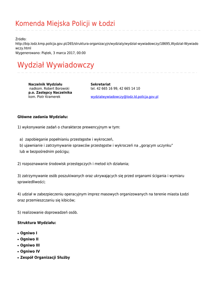Komenda Miejska Policji w Łodzi Źródło: http://bip.lodz.kmp.policja.gov.pl/265/struktura-organizacyjn/wydzialy/wydzial-wywiadowczy/18695,Wydzial-Wywiado wczy.html Wygenerowano: Piątek, 3 marca 2017, 00:00 Wydział Wywiadowczy Naczelnik Wydziału nadkom. Robert Borowski p.o. Zastępcy Naczelnika kom. Piotr Kramerek Sekretariat tel. 42 665 16 99, 42 665 14 10 [email protected] Główne zadania Wydziału: 1) wykonywanie zadań o charakterze prewencyjnym w tym: a) zapobieganie popełnianiu przestępstw i wykroczeń, b) ujawnianie i zatrzymywanie sprawców przestępstw i wykroczeń na „gorącym uczynku” lub w bezpośrednim pościgu; 2) rozpoznawanie środowisk przestępczych i metod ich działania; 3) zatrzymywanie osób poszukiwanych oraz ukrywających się przed organami ścigania i wymiaru sprawiedliwości; 4) udział w zabezpieczeniu operacyjnym imprez masowych organizowanych na terenie miasta Łodzi oraz przemieszczaniu się kibiców; 5) realizowanie doprowadzeń osób. Struktura Wydziału: ● Ogniwo I ● Ogniwo II ● Ogniwo III ● Ogniwo IV ● Zespół Organizacji Służby Metryczka Data publikacji 21.01.2014 Data modyfikacji 06.02.2017 Rejestr zmian Podmiot udostępniający informację: Biuletyn Informacji Publicznej Osoba wytwarzająca/odpowiadająca za informację: KMP w Łodzi Osoba udostępniająca informację: KMP w Łodzi Osoba modyfikująca informację: KMP w Łodzi