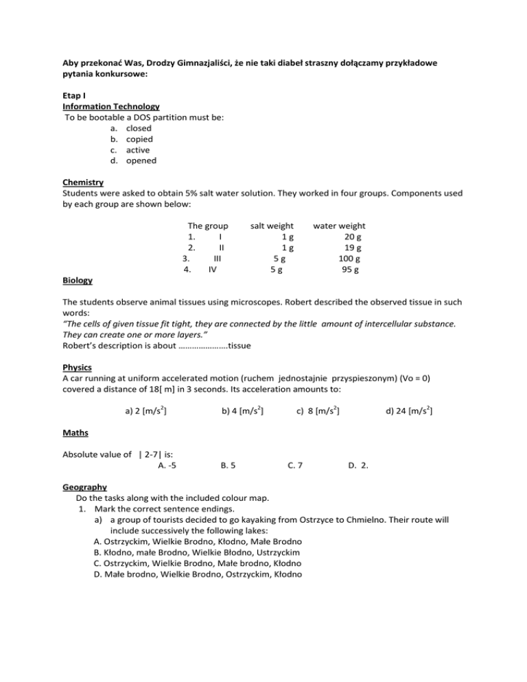 Aby przekonać Was, Drodzy Gimnazjaliści, że nie taki diabeł straszny dołączamy przykładowe pytania konkursowe: Etap I Information Technology To be bootable a DOS partition must be: a. closed b. copied c. active d. opened Chemistry Students were asked to obtain 5% salt water solution. They worked in four groups. Components used by each group are shown below: The group 1. I 2. II 3. III 4. IV salt weight 1g 1g 5g 5g water weight 20 g 19 g 100 g 95 g Biology The students observe animal tissues using microscopes. Robert described the observed tissue in such words: “The cells of given tissue fit tight, they are connected by the little amount of intercellular substance. They can create one or more layers.” Robert’s description is about ………………….tissue Physics A car running at uniform accelerated motion (ruchem jednostajnie przyspieszonym) (Vo = 0) covered a distance of 18[ m] in 3 seconds. Its acceleration amounts to: a) 2 [m/s2] b) 4 [m/s2] c) 8 [m/s2] d) 24 [m/s2] Maths Absolute value of | 2-7| is: A. -5 B. 5 C. 7 D. 2. Geography Do the tasks along with the included colour map. 1. Mark the correct sentence endings. a) a group of tourists decided to go kayaking from Ostrzyce to Chmielno. Their route will include successively the following lakes: A. Ostrzyckim, Wielkie Brodno, Kłodno, Małe Brodno B. Kłodno, małe Brodno, Wielkie Błodno, Ustrzyckim C. Ostrzyckim, Wielkie Brodno, Małe brodno, Kłodno D. Małe brodno, Wielkie Brodno, Ostrzyckim, Kłodno Etap II Zestaw I Task 1. What is the electric resistance of the heater in the kettle? The time needed to boil the water is 5 minutes. Task 2. List two not connected with the natural environment reasons of the weak economic development in Africa. Task 3. You are living in a detached house which has the first and the ground floor . There are four rooms on each level. The contractor installed the Internet in the house, but there is only connector one and one modem so only one computer can be connected with the Internet in each room. What would you do to be able to use the Internet in every place in the house? Task 4. The mass of sodium left in air changed from 1,84g to 2,48g assuming that sodium reacted with oxygen. Find the capacity of gas which react with sodium.