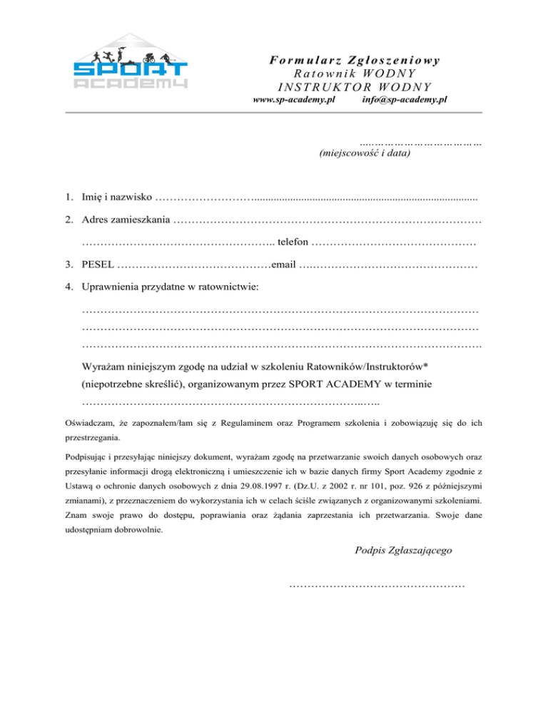 Formularz Zgłoszeniowy Ratownik WODNY INSTRUKTOR WODNY www.sp-academy.pl [email protected] …..…………………………… (miejscowość i data) 1. Imię i nazwisko ………………………................................................................................. 2. Adres zamieszkania ………………………………………………………………………… …………………………………………….. telefon ……………………………………… 3. PESEL ……………………………………email ….……………………………………… 4. Uprawnienia przydatne w ratownictwie: ……………………………………………………………………………………………… ……………………………………………………………………………………………… ………………………………………………………………………………………………. Wyrażam niniejszym zgodę na udział w szkoleniu Ratowników/Instruktorów* (niepotrzebne skreślić), organizowanym przez SPORT ACADEMY w terminie …………………………………………………………………..….. Oświadczam, że zapoznałem/łam się z Regulaminem oraz Programem szkolenia i zobowiązuję się do ich przestrzegania. Podpisując i przesyłając niniejszy dokument, wyrażam zgodę na przetwarzanie swoich danych osobowych oraz przesyłanie informacji drogą elektroniczną i umieszczenie ich w bazie danych firmy Sport Academy zgodnie z Ustawą o ochronie danych osobowych z dnia 29.08.1997 r. (Dz.U. z 2002 r. nr 101, poz. 926 z późniejszymi zmianami), z przeznaczeniem do wykorzystania ich w celach ściśle związanych z organizowanymi szkoleniami. Znam swoje prawo do dostępu, poprawiania oraz żądania zaprzestania ich przetwarzania. Swoje dane udostępniam dobrowolnie. Podpis Zgłaszającego …………………………………………