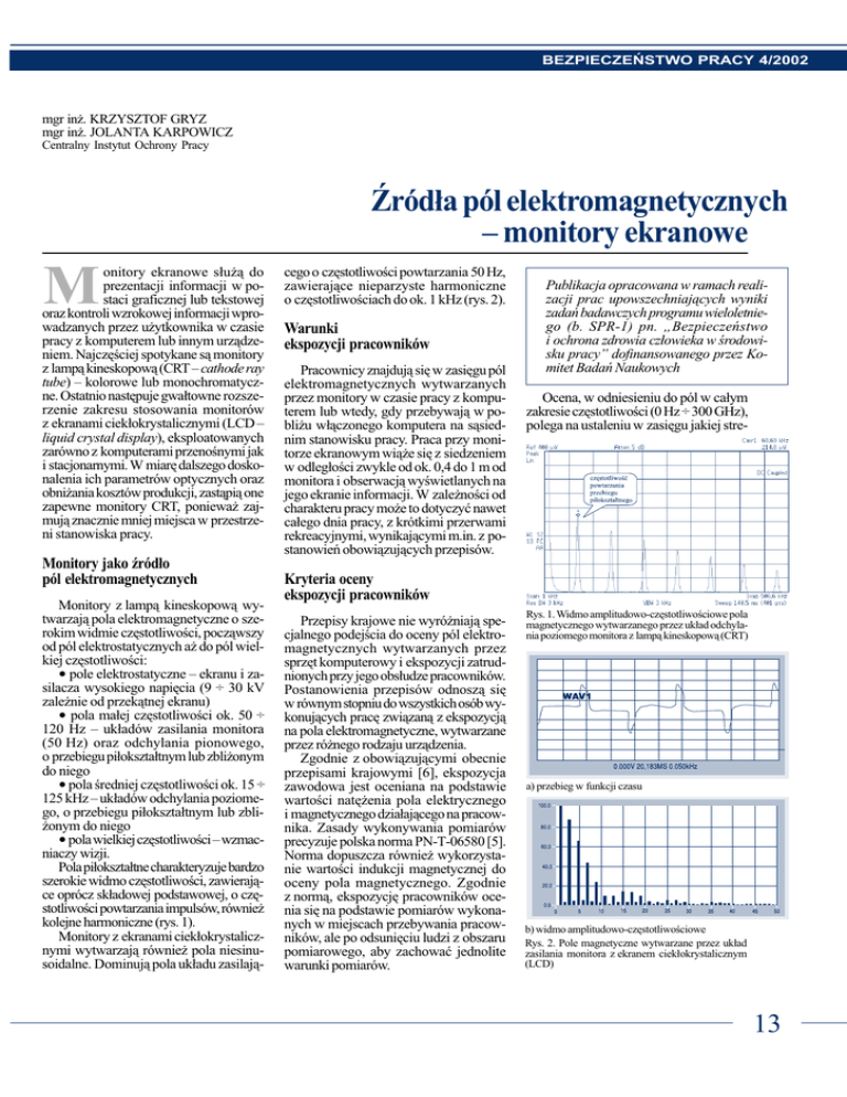 BEZPIECZEÑSTWO PRACY 4/2002 mgr in¿. KRZYSZTOF GRYZ mgr in¿. JOLANTA KARPOWICZ Centralny Instytut Ochrony Pracy ród³a pól elektromagnetycznych monitory ekranowe onitory ekranowe s³u¿¹ do prezentacji informacji w postaci graficznej lub tekstowej oraz kontroli wzrokowej informacji wprowadzanych przez u¿ytkownika w czasie pracy z komputerem lub innym urz¹dzeniem. Najczêciej spotykane s¹ monitory z lamp¹ kineskopow¹ (CRT cathode ray tube) kolorowe lub monochromatyczne. Ostatnio nastêpuje gwa³towne rozszerzenie zakresu stosowania monitorów z ekranami ciek³okrystalicznymi (LCD liquid crystal display), eksploatowanych zarówno z komputerami przenonymi jak i stacjonarnymi. W miarê dalszego doskonalenia ich parametrów optycznych oraz obni¿ania kosztów produkcji, zast¹pi¹ one zapewne monitory CRT, poniewa¿ zajmuj¹ znacznie mniej miejsca w przestrzeni stanowiska pracy. Monitory jako ród³o pól elektromagnetycznych Monitory z lamp¹ kineskopow¹ wytwarzaj¹ pola elektromagnetyczne o szerokim widmie czêstotliwoci, pocz¹wszy od pól elektrostatycznych a¿ do pól wielkiej czêstotliwoci: pole elektrostatyczne ekranu i zasilacza wysokiego napiêcia (9 ÷ 30 kV zale¿nie od przek¹tnej ekranu) pola ma³ej czêstotliwoci ok. 50 ÷ 120 Hz uk³adów zasilania monitora (50 Hz) oraz odchylania pionowego, o przebiegu pi³okszta³tnym lub zbli¿onym do niego pola redniej czêstotliwoci ok. 15 ÷ 125 kHz uk³adów odchylania poziomego, o przebiegu pi³okszta³tnym lub zbli¿onym do niego pola wielkiej czêstotliwoci wzmacniaczy wizji. Pola pi³okszta³tne charakteryzuje bardzo szerokie widmo czêstotliwoci, zawieraj¹ce oprócz sk³adowej podstawowej, o czêstotliwoci powtarzania impulsów, równie¿ kolejne harmoniczne (rys. 1). Monitory z ekranami ciek³okrystalicznymi wytwarzaj¹ równie¿ pola niesinusoidalne. Dominuj¹ pola uk³adu zasilaj¹- cego o czêstotliwoci powtarzania 50 Hz, zawieraj¹ce nieparzyste harmoniczne o czêstotliwociach do ok. 1 kHz (rys. 2). Warunki ekspozycji pracowników Pracownicy znajduj¹ siê w zasiêgu pól elektromagnetycznych wytwarzanych przez monitory w czasie pracy z komputerem lub wtedy, gdy przebywaj¹ w pobli¿u w³¹czonego komputera na s¹siednim stanowisku pracy. Praca przy monitorze ekranowym wi¹¿e siê z siedzeniem w odleg³oci zwykle od ok. 0,4 do 1 m od monitora i obserwacj¹ wywietlanych na jego ekranie informacji. W zale¿noci od charakteru pracy mo¿e to dotyczyæ nawet ca³ego dnia pracy, z krótkimi przerwami rekreacyjnymi, wynikaj¹cymi m.in. z postanowieñ obowi¹zuj¹cych przepisów. Publikacja opracowana w ramach realizacji prac upowszechniaj¹cych wyniki zadañ badawczych programu wieloletniego (b. SPR-1) pn. Bezpieczeñstwo i ochrona zdrowia cz³owieka w rodowisku pracy dofinansowanego przez Komitet Badañ Naukowych Ocena, w odniesieniu do pól w ca³ym zakresie czêstotliwoci (0 Hz ÷ 300 GHz), polega na ustaleniu w zasiêgu jakiej stre- Kryteria oceny ekspozycji pracowników Przepisy krajowe nie wyró¿niaj¹ specjalnego podejcia do oceny pól elektromagnetycznych wytwarzanych przez sprzêt komputerowy i ekspozycji zatrudnionych przy jego obs³udze pracowników. Postanowienia przepisów odnosz¹ siê w równym stopniu do wszystkich osób wykonuj¹cych pracê zwi¹zan¹ z ekspozycj¹ na pola elektromagnetyczne, wytwarzane przez ró¿nego rodzaju urz¹dzenia. Zgodnie z obowi¹zuj¹cymi obecnie przepisami krajowymi [6], ekspozycja zawodowa jest oceniana na podstawie wartoci natê¿enia pola elektrycznego i magnetycznego dzia³aj¹cego na pracownika. Zasady wykonywania pomiarów precyzuje polska norma PN-T-06580 [5]. Norma dopuszcza równie¿ wykorzystanie wartoci indukcji magnetycznej do oceny pola magnetycznego. Zgodnie z norm¹, ekspozycjê pracowników ocenia siê na podstawie pomiarów wykonanych w miejscach przebywania pracowników, ale po odsuniêciu ludzi z obszaru pomiarowego, aby zachowaæ jednolite warunki pomiarów. Rys. 1. Widmo amplitudowo-czêstotliwociowe pola magnetycznego wytwarzanego przez uk³ad odchylania poziomego monitora z lamp¹ kineskopow¹ (CRT) a) przebieg w funkcji czasu b) widmo amplitudowo-czêstotliwociowe Rys. 2. Pole magnetyczne wytwarzane przez uk³ad zasilania monitora z ekranem ciek³okrystalicznym (LCD) 13 BEZPIECZEÑSTWO PRACY 4/2002 Tabela 2 KRYTERIA DOTYCZ¥CE WIELKOCI PÓL ELEKTROMAGNETYCZNYCH, POZWALAJ¥CE NA OZNAKOWANIE MONITORÓW EKRANOWYCH (CRT i LCD) SYMBOLEM TCO95 LUB TCO99 [12, 13] fy oddzia³ywania znajduje siê stanowisko pracy oraz okreleniu czasu nara¿enia w przypadku ekspozycji w strefie zagro¿enia. Trzy strefy oddzia³ywania pola porednia, zagro¿enia i niebezpieczna, zwane s¹ strefami ochronnymi, a obszar poza strefami ochronnymi to tzw. strefa bezpieczna. Zasady ekspozycji zawodowej w obrêbie stref ochronnych zdefiniowano nastêpuj¹co: w strefie bezpiecznej przebywanie pracowników jest dozwolone bez ograniczeñ czasowych w strefie poredniej mog¹ przebywaæ pracownicy zatrudnieni przy ród³ach pól w czasie jednej 8-godzinnej zmiany roboczej w strefie zagro¿enia czas przebywania pracowników jest krótszy od zmiany roboczej w strefie niebezpiecznej przebywanie pracowników jest zabronione (z wyj¹tkiem stosowania przez nich rodków ochrony osobistej). Na obszarze stref ochronnych mog¹ przebywaæ wy³¹cznie pracownicy, u których w wyniku przeprowadzonych badañ lekarskich stwierdzono brak przeciwwskazañ zdrowotnych do ekspozycji zawodowej na pola elektromagnetyczne. W tabeli 1. zestawiono dopuszczalne wartoci: natê¿enia pola elektrycznego E oraz indukcji magnetycznej B w odniesieniu do ekspozycji ca³ego cia³a pracownika, dla wybranych zakresów czêstotliwoci, w których zawieraj¹ siê pola wytwarzane przez monitory ekranowe. Krajowe przepisy s¹ zbli¿one lub nieco ostrzejsze od obowi¹zuj¹cych w innych pañstwach europejskich i podanych w zaleceniach miêdzynarodowych (rys. 3. i 4.). Na rys 3. i 4. zastosowano nastêpuj¹ce oznaczenia: NDN2001 8 god
