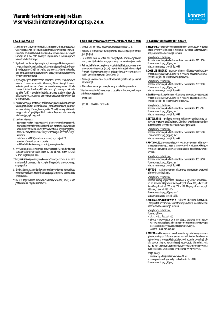 wydawnictwa Koncept powinny spełniać warunki określone w regulaminie emisji reklam publikowanych w serwisach internetowych