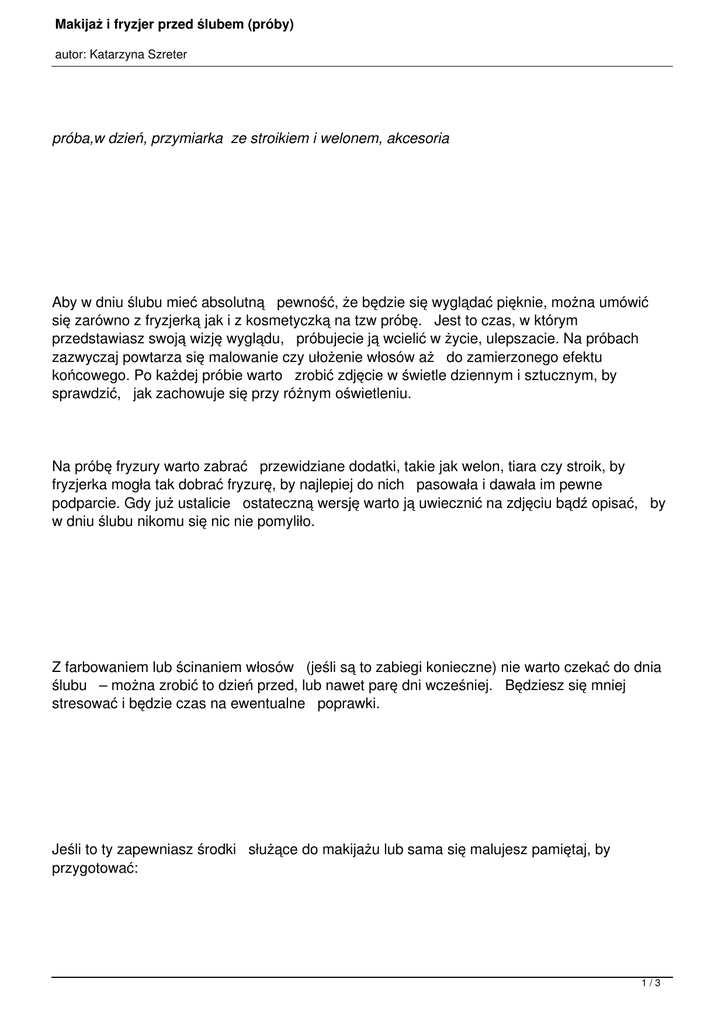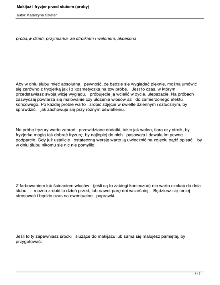 Makijaż i fryzjer przed ślubem (próby) autor: Katarzyna Szreter próba,w dzień, przymiarka ze stroikiem i welonem, akcesoria Aby w dniu ślubu mieć absolutną pewność, że będzie się wyglądać pięknie, można umówić się zarówno z fryzjerką jak i z kosmetyczką na tzw próbę. Jest to czas, w którym przedstawiasz swoją wizję wyglądu, próbujecie ją wcielić w życie, ulepszacie. Na próbach zazwyczaj powtarza się malowanie czy ułożenie włosów aż do zamierzonego efektu końcowego. Po każdej próbie warto zrobić zdjęcie w świetle dziennym i sztucznym, by sprawdzić, jak zachowuje się przy różnym oświetleniu. Na próbę fryzury warto zabrać przewidziane dodatki, takie jak welon, tiara czy stroik, by fryzjerka mogła tak dobrać fryzurę, by najlepiej do nich pasowała i dawała im pewne podparcie. Gdy już ustalicie ostateczną wersję warto ją uwiecznić na zdjęciu bądź opisać, by w dniu ślubu nikomu się nic nie pomyliło. Z farbowaniem lub ścinaniem włosów (jeśli są to zabiegi konieczne) nie warto czekać do dnia ślubu – można zrobić to dzień przed, lub nawet parę dni wcześniej. Będziesz się mniej stresować i będzie czas na ewentualne poprawki. Jeśli to ty zapewniasz środki służące do makijażu lub sama się malujesz pamiętaj, by przygotować: 1/3 Makijaż i fryzjer przed ślubem (próby) autor: Katarzyna Szreter - zestaw kolorowy (podkład, puder, róż, cienie do powiek, tusz, korektor, kredkę do oczu, szminkę, konturówkę) - zestaw do malowania (gąbeczki, pędzle, szczoteczki) - zestaw do demakijażu (mleczko, waciki, pałeczki) - lusterko i dobre oświetlenie Jeśli będziesz się sama czesać lub musisz przygotować wszystko co potrzebne, to musisz mieć pod ręką: - szczotkę i grzebień - wsuwki niewidoczne (czarne lub w kolorze włosów) w dużych ilościach (20 to minimum) - małe gumeczki - przewidziane ozdoby do włosów (ozdobne wsuwki, stroik, kwiaty, diadem, welon) - mocny spray do włosów, czasem potrzebny jest żel lub wosk 2/3 Makijaż i fryzjer przed ślubem (próby) autor: Katarzyna Szreter - jeśli musisz kręcić włosy, to wałki i suszarkę 3/3