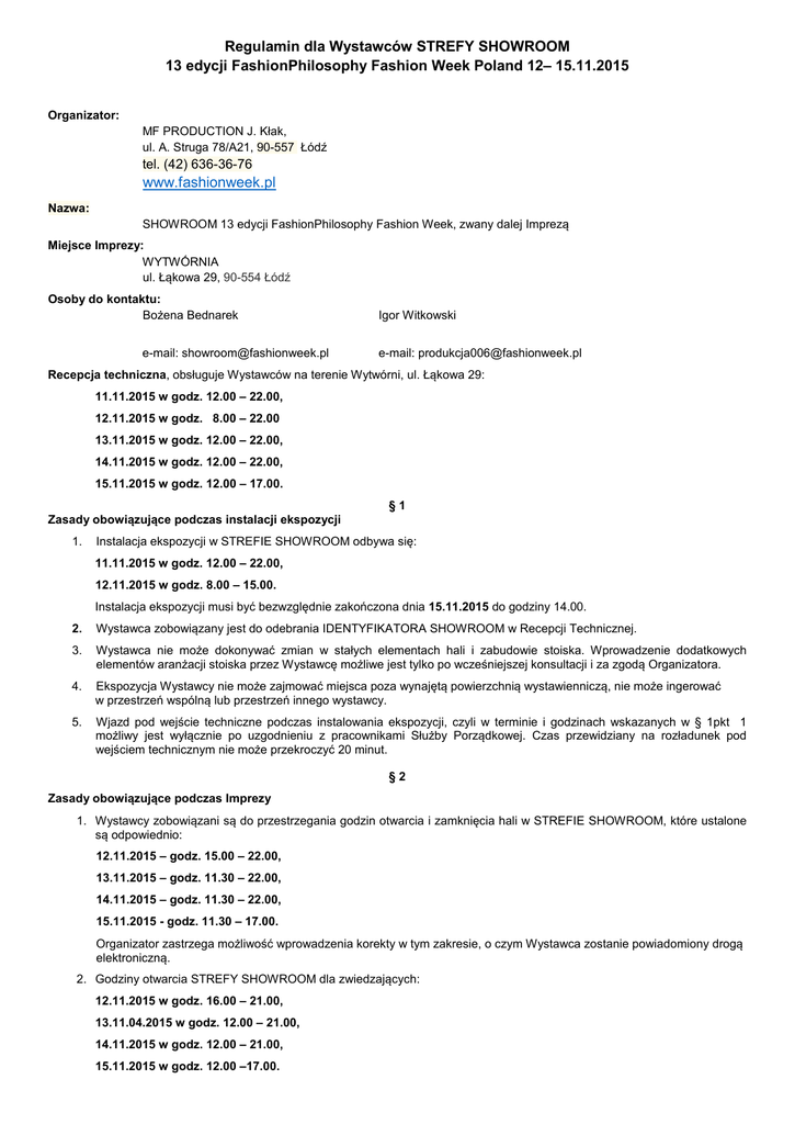 Regulamin dla Wystawców STREFY SHOWROOM 13 edycji FashionPhilosophy Fashion Week Poland 12– 15.11.2015 Organizator: MF PRODUCTION J. Kłak, ul. A. Struga 78/A21, 90-557 Łódź tel. (42) 636-36-76 www.fashionweek.pl Nazwa: SHOWROOM 13 edycji FashionPhilosophy Fashion Week, zwany dalej Imprezą Miejsce Imprezy: WYTWÓRNIA ul. Łąkowa 29, 90-554 Łódź Osoby do kontaktu: Bożena Bednarek e-mail: [email protected] Igor Witkowski e-mail: [email protected] Recepcja techniczna, obsługuje Wystawców na terenie Wytwórni, ul. Łąkowa 29: 11.11.2015 w godz. 12.00 – 22.00, 12.11.2015 w godz. 8.00 – 22.00 13.11.2015 w godz. 12.00 – 22.00, 14.11.2015 w godz. 12.00 – 22.00, 15.11.2015 w godz. 12.00 – 17.00. Zasady obowiązujące podczas instalacji ekspozycji 1. §1 Instalacja ekspozycji w STREFIE SHOWROOM odbywa się: 11.11.2015 w godz. 12.00 – 22.00, 12.11.2015 w godz. 8.00 – 15.00. Instalacja ekspozycji musi być bezwzględnie zakończona dnia 15.11.2015 do godziny 14.00. 2. Wystawca zobowiązany jest do odebrania IDENTYFIKATORA SHOWROOM w Recepcji Technicznej. 3. Wystawca nie może dokonywać zmian w stałych elementach hali i zabudowie stoiska. Wprowadzenie dodatkowych elementów aranżacji stoiska przez Wystawcę możliwe jest tylko po wcześniejszej konsultacji i za zgodą Organizatora. 4. Ekspozycja Wystawcy nie może zajmować miejsca poza wynajętą powierzchnią wystawienniczą, nie może ingerować w przestrzeń wspólną lub przestrzeń innego wystawcy. 5. Wjazd pod wejście techniczne podczas instalowania ekspozycji, czyli w terminie i godzinach wskazanych w § 1pkt 1 możliwy jest wyłącznie po uzgodnieniu z pracownikami Służby Porządkowej. Czas przewidziany na rozładunek pod wejściem technicznym nie może przekroczyć 20 minut. §2 Zasady obowiązujące podczas Imprezy 1. Wystawcy zobowiązani są do przestrzegania godzin otwarcia i zamknięcia hali w STREFIE SHOWROOM, które ustalone są odpowiednio: 12.11.2015 – godz. 15.00 – 22.00, 13.11.2015 – godz. 11.30 – 22.00, 14.11.2015 – godz. 11.30 – 22.00, 15.11.2015 - godz. 11.30 – 17.00. Organizator zastrzega możliwość wprowadzenia korekty w tym zakresie, o czym Wystawca zostanie powiadomiony drogą elektroniczną. 2. Godziny otwarcia STREFY SHOWROOM dla zwiedzających: 12.11.2015 w godz. 16.00 – 21.00, 13.11.04.2015 w godz. 12.00 – 21.00, 14.11.2015 w godz. 12.00 – 21.00, 15.11.2015 w godz. 12.00 –17.00. 3. Wystawca jest zobowiązany do samodzielnego ubezpieczenia mienia znajdującego się w STREFIE SHOWROOM we własnym zakresie od ryzyk związanych ze zniszczeniem, kradzieżą i zdarzeniami losowymi (np. pożarów) w czasie trwania Imprezy. Zabezpieczenie STREFY SHOWROOM przez Agencję polega na ustanowieniu na terenie SHOWROOM profesjonalnej ochrony obiektu i monitoringu video. Agencja ubezpiecza wydarzenie od zdarzeń losowych (OC wykonawcy) natomiast ubezpieczenie od ryzyka kradzieży odbywa się codziennie po godzinie wyznaczonej, jako końcowa dla Wystawców w danym dniu. Agencja zabezpiecza tereny targowe w godzinach zaplombowania obiektu (zgodnie z harmonogramem dla Wystawców). Nieobecność Wystawcy przy czynnościach otwarcia i zamknięcia wynajmowanej przez Wystawcę powierzchni zwalnia Agencję od odpowiedzialności za mienie. 4. Podczas Imprezy hala podlega plombowaniu i rozplombowaniu zgodnie z harmonogramem jej dostępności dla wystawców. Wystawca ma obowiązek pozostać na swoim stoisku do czasu zamknięcia (zaplombowania) hali oraz pojawić się na stoisku w momencie rozplombowywania hali. 5. Każdorazowo, przed opuszczeniem STREFY SHOWROOM, zgodnie z harmonogramem wskazanym w § 2 pkt. 1, Wystawca ma obowiązek zabezpieczyć swoją ekspozycję. 6. Wystawcy zobowiązani są do dbania o estetykę i utrzymania porządku w obrębie wynajętej przestrzeni w strefie SHOWROOM. § 3. Zasady obowiązujące podczas demontażu ekspozycji 1. Demontaż ekspozycji odbywa się 15.11.2015 - godz. 17.00 – 17.30. 2. Wystawcy zobowiązani są do zdania powierzchni wynajętej w STREFIE SHOWROOM w stanie identycznym do tego, w jakim została im ona przekazana, włączając w to usunięcie taśm, plakatów i naklejek, jak również do zwrotu elementów wypożyczonych, jak: sztender, stolik, krzesła. Zdanie powierzchni następuje na podstawie protokołu odbiorczego stoiska. 3. Opuszczenie stoiska przez wystawcę wraz z ekspozycją, możliwe jest wyłącznie na podstawie protokołu odbiorczego stoiska podpisanego przez przedstawiciela Organizatora po otrzymaniu przepustki wydanej przez przedstawiciela organizatora. Posiadanie protokołu odbiorczego stoiska przepustki jest weryfikowane przez Służbę Porządkową przy wyjściu technicznym ze STREFY SHOWROOM. 4. Wystawcy są zobowiązani do poddania się kontroli w zakresie wywożonej ekspozycji; uprawnienia do przeprowadzenia kontroli posiada Służba Porządkowa usytuowana przy wyjściu technicznym ze STREFY SHOWROOM. 5. Wcześniejszy niż określony w harmonogramie demontaż ekspozycji, możliwy jest wyłącznie w przypadkach uzgodnionych z przedstawicielem organizatora. Samowolny wcześniejszy demontaż powoduje restrykcje przewidziane umową z Organizatorem. 6. Podjazd pod wejście techniczne dla Wystawców możliwy jest wyłącznie po uzgodnieniu z pracownikami Służby Porządkowej w czasie i kolejności przez nich wskazanym. §4 Zasady bezpieczeństwa ppoż. i BHP 1. W trakcie trwania ekspozycji, wystawcy zobowiązani są do przestrzegania postanowień umowy zawartej z organizatorem, a także do przestrzegania przepisów BHP, porządkowych i bezpieczeństwa, zarówno powszechnie obowiązujących, jak i obowiązujących na terenie obiektu, w którym odbywa się Impreza i znajduje się SHOWROOM wraz z wynajętą powierzchnią. 2. Zabrania się używania i stosowania ognia otwartego. 3. Zakazuje się palenia tytoniu w całym obiekcie poza wyznaczonymi i oznakowanymi miejscami. 4. Włączanie do sieci energetycznej jakichkolwiek urz