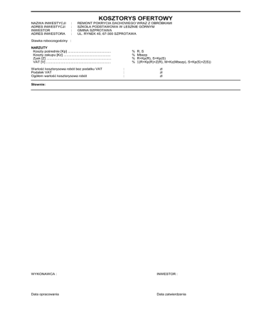 KOSZTORYS OFERTOWY NAZWA INWESTYCJI ADRES INWESTYCJI INWESTOR ADRES INWESTORA : : : : REMONT POKRYCIA DACHOWEGO WRAZ Z OBRÓBKAMI SZKOŁA PODSTAWOWA W LESZNIE GÓRNYM GMINA SZPROTAWA UL. RYNEK 45; 67-300 SZPROTAWA Stawka roboczogodziny : NARZUTY Koszty pośrednie [Kp] ............................................ Koszty zakupu [Kz] ................................................ Zysk [Z] .................................................................. VAT [V] .................................................................. Wartość kosztorysowa robót bez podatku VAT Podatek VAT Ogółem wartość kosztorysowa robót % % % % : : : R, S Mbezp R+Kp(R), S+Kp(S) Σ(R+Kp(R)+Z(R), M+Kz(Mbezp), S+Kp(S)+Z(S)) zł zł zł Słownie: WYKONAWCA : INWESTOR : Data opracowania Data zatwierdzenia Lp. 1 1 1 d.1 2 d.1 Opis 2 DACH Rozbiórka pokrycia z papy na dachach betonowych - pierwsza warstwa Rozbiórka pokrycia z papy na dachach betonowych - następna warstwa Krotność = 2 Rozebranie obróbek blacharskich murów ogniowych, okapów, kołnierzy, gzymsów itp. z blachy nie nadającej się do uŜytku Wywiezienie gruzu spryzmowanego samochodami samowyładowczymi na odległość 5 km wraz z kosztami utylizacji Pokrycie dachów papą termozgrzewalną dwuwarstwowe 3 d.1 4 d.1 5 d.1 6 Pokrycie dachów papą termozgrzewalną - obróbki z papy nad.1 wierzchniowej 7 Obróbki przy szerokości w rozwinięciu ponad 25 cm - z blachy d.1 stalowej ocynkowanej 8 Rozebranie rynien z blachy nie nadającej się do uŜytku d.1 9 Rozebranie rur spustowych z blachy nie nadającej się do uŜytku d.1 10 Rynny dachowe półokrągłe o śr. 15 cm - z blachy ocynkowanej d.1 11 Rury spustowe okrągłe o śr. 12 cm - z blachy ocynkowanej d.1 12 Rury wywiewne z PVC o połączeniu wciskowym o śr. 110 mm d.1 13 Uzupełnienie tynków zwykłych cementowo-wapiennych kat. III d.1 na kominach ponad dachem płaskim 14 Dwukrotne malowanie farbami emulsyjnymi elewacji - tynki gładd.1 kie 15 Demontaz i ponowny montaŜ instalacji odgromowej d.1 16 Wymiana włazu dachowego d.1 Wartość kosztorysowa robót bez podatku VAT Podatek VAT Ogółem wartość kosztorysowa robót Jedn. miary Ilość Cena zł 3 4 5 m2 672 m2 672 m2 85 m3 m2 682*0.015 = 10.230 672 m2 35 m2 85 m 105 m 9*6 = 54.000 m 105 m 54 szt. 12 m2 10 m2 10 kpl 1 kpl 1 Wartość zł (4 x 5) 6 Słownie: TABELA ELEMENTÓW SCALONYCH Lp. Nazwa Robocizna Materiały Sprzęt Kosztorys netto VAT Razem brutto Słownie: -2- Norma PRO Wersja 4.11 Kp Kz Z Uproszczone RAZEM