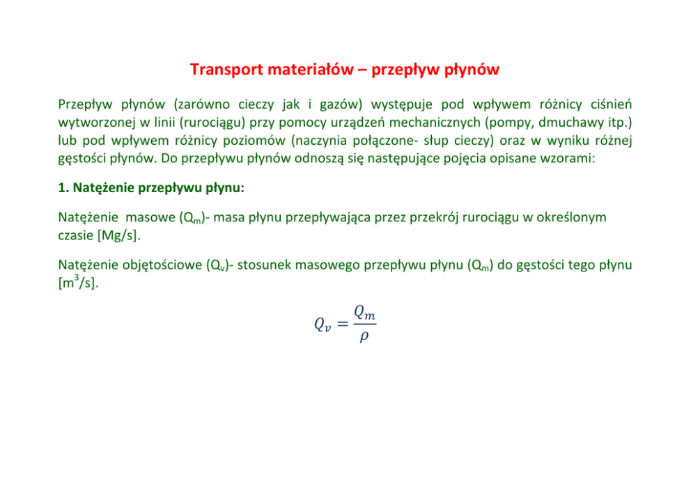 Transport materiałów – przepływ płynów Przepływ płynów (zarówno cieczy jak i gazów) występuje pod wpływem różnicy ciśnień wytworzonej w linii (rurociągu) przy pomocy urządzeń mechanicznych (pompy, dmuchawy itp.) lub pod wpływem różnicy poziomów (naczynia połączone- słup cieczy) oraz w wyniku różnej gęstości płynów. Do przepływu płynów odnoszą się następujące pojęcia opisane wzorami: 1. Natężenie przepływu płynu: Natężenie masowe (Qm)- masa płynu przepływająca przez przekrój rurociągu w określonym czasie [Mg/s]. Natężenie objętościowe (Qv)- stosunek masowego przepływu płynu (Qm) do gęstości tego płynu [m3/s]. Średnia prędkość liniowa (w) - stosunek objętościowego natężenia przepływu do pola przekroju rurociągu (S) W przemyśle stosujemy prędkość liniową cieczy rzędu 0,5 – 3 m/s, a par i gazów 10 – 25 m/s (dla pary przegrzanej 30 – 50 m/s). 2. Rodzaje przepływu płynów. Przepływ płynów można podzielić na laminarny (uwarstwiony): lub burzliwy: • ruch uwarstwiony (laminarny) – prędkość przepływu jest największa w osi rurociągu, a bliżej ścianek na skutek tarcia maleje. Rozkład prędkości w przekroju podłużnym rury ma kształt paraboli. Występuje przy małej prędkości przepływu. • ruch burzliwy – występuje przy wyższych prędkościach. Rozkład prędkości w przekroju podłużnym rury ma kształt spłaszczonej paraboli. W pobliżu ścianek występuje ruch warstwowy. Charakter przepływu opisuje bezwymiarowa liczba Reynoldsa (Re) wyrażająca zależność między prędkością przepływu płynu (w), średnicą rurociągu (D), gęstością płynu (ρ) oraz jego lepkością (η): ·· Różne podręczniki i źródła podają różne wartości liczby Reynoldsa dla charakteru przepływu jednak najczęściej przyjmuje się, że dla wartości poniżej 2100 mamy do czynienia z przepływem laminarnym, między 2100 a 3100 przejściowy i powyżej 3100 burzliwy. W praktyce przeważają przepływy burzliwe. 3. Równanie ciągłości strumienia. W przypadku przepływu płynu poruszającego się ruchem ustalonym, tzn. takim, gdzie prędkość miejscowa i ciśnienie w każdym punkcie płynu nie zmieniają się w czasie, masy płynu przepływające przez przekroje S1 i S2 są sobie równe. Q1 = Q2 stąd S1·v1·ρ1 = S2·v2·ρ2 dla płynu nieściśliwego gęstość ρ1=ρ2 i wtedy dla izotermicznego przepływu cieczy równanie przyjmie postać Z równania wynika, że średnia prędkość przepływu płynu nieściśliwego (v) przy ustalonym przepływie w różnych przekrojach jest odwrotnie proporcjonalna do pola tych przekrojów (S). 4. Równanie Bernoulliego. Dla przepływu ustalonego, nielepkiego i nieściśliwego · · · · · · 2 2 · · · 2 Równanie Bernoulliego jest podstawowym równaniem mechaniki płynów. Zastosowania: np. wyznaczenie prędkości przepływu płynu na podstawie pomiarów ciśnienia, obliczenie spadku ciśnienia na określonej wysokości itd. 5. Opory przepływu w rurociągach Zmniejszenie ciśnienia w rurociągach spowodowane jest oporami tarcia płynu podczas przepływu i oporami powstającymi przy zmianie kierunku przepływu lub kształtów geometrycznych rurociągu. Opory przepływu zależą od długości rurociągu, jego średnicy oraz prędkości przepływu i lepkości cieczy. Dla przepływu w rurociągu o przekroju kołowym opory te wynoszą: ∆ · · · 2 gdzie: λ – funkcja liczby Reynoldsa (współczynnik oporów) L – długość rurociągu d –wewnętrzna średnica rurociągu w – średnia prędkość przepływu g – przyspieszenie ziemskie p – ciśnienie ρ - gęstość