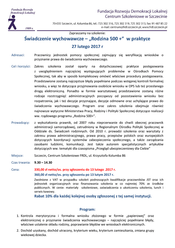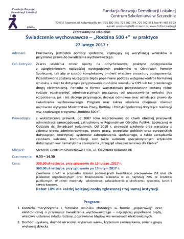 Zapraszamy na szkolenie: Świadczenie wychowawcze – „Rodzina 500 +” w praktyce 27 lutego 2017 r Adresaci: Pracownicy jednostek pomocy społecznej zajmujący się weryfikacją wniosków o przyznanie prawa do świadczenia wychowawczego. Cel i korzyści: Zakres szkolenia został oparty na dotychczasowej praktyce postępowania z uwzględnieniem najczęściej występujących problemów w Ośrodkach Pomocy Społecznej, tak aby w sposób kompleksowy omówić właściwe procedury postępowania. Przedstawione zostaną najczęstsze błędy popełniane podczas wstępnej kontroli formalnej wniosku, a więc te dotyczące przyjmowania osobiście wniosku w OPS lub też przesłanego drogą elektroniczną. Ponadto w formie warsztatowej przedstawione zostaną różne rodzaje rozstrzygnięć administracyjnych począwszy od pozostawienia wniosku bez rozpatrzenia, jak i też decyzje przyznające, decyzje odmowne oraz uchylające prawo do świadczenia wychowawczego. Program oraz zakres szkolenia obejmuje również najnowsze wytyczne Ministerstwa Pracy, Rodziny i Polityki Społecznej dotyczące realizacji ww. rządowego programu „Rodzina 500+”. Prowadzący: z wykształcenia prawnik, od 2007 roku nieprzerwanie do chwili obecnej pracownik administracji samorządowej, zatrudniony w Regionalnym Ośrodku Polityki Społecznej w Oddziale ds. Świadczeń rodzinnych. Od 2010 r. prowadzi szkolenia oraz warsztaty z zakresu prawa administracyjnego, prawa pracy, przepisów polskich oraz europejskich dotyczących koordynacji systemów zabezpieczenia społecznego, a także zarządzania zasobami ludzkimi, komunikacji. Jest także autorem specjalistycznych artykułów dotyczących ww. tematyki dla czasopisma „Przegląd ubezpieczeniowy dla Ciebie” Miejsce: Szczecin, Centrum Szkoleniowe FRDL, ul. Krzysztofa Kolumba 86 Czas trwania: 9.30 – 14.30 Cena: 330,00 zł netto/os. przy zgłoszeniu do 13 lutego .2017 r. 360,00 zł netto/os. przy zgłoszeniu po 13 lutym 2017 r. Zwolnione z VAT w przypadku szkoleń podnoszących kwalifikacje pracowników JST oraz ich jednostek organizacyjnych oraz finansowania szkolenia w co najmniej 70% ze środków publicznych. W cenie: materiały szkoleniowe, zaświadczenia o ukończeniu szkolenia, lunch i serwis kawowy. Rabat 10% dla każdej kolejnej osoby zgłoszonej z tej samej instytucji. Program: 1. Kontrola merytoryczna i formalna wniosku złożonego w formie „papierowej” oraz elektronicznej o przyznanie świadczenia wychowawczego – najczęściej popełniane błędy, właściwe ustalenie składu rodziny, poprawianie błędów we wnioskach elektronicznych. 2. Dochód uzyskany, dochód utracony, kryterium wieku, kryterium zamieszkania, zmiana grupy wiekowej dziecka. 3. Przyznanie prawa do świadczenia wychowawczego, odmowa tegoż prawa, uchylenie i zmiana decyzji, pozostawienie wniosku o ustalenie prawa do świadczenia wychowawczego bez rozpatrzenia. 4. Koordynacja systemów zabezpieczenia społecznego – pełna procedura postępowania pomiędzy Regionalnym Ośrodkiem Polityki Społecznej a Ośrodkiem Pomocy Społecznej zgodnie z wytycznymi Ministerstwa Pracy, Rodziny i Polityki Społecznej. 5. Zmiana wypłaty świadczenia wychowawczego z formy gotówkowej na rzeczową – zasady. 6. Wpływ niewykorzystanej ulgi na dzieci na prawo do świadczeń rodzinnych oraz na prawo do świadczenia wychowawczego na okres zasiłkowy 2016/2017. 7. Rachunek rodzinny – podstawa prawna, zasady zakładania, korzyści dla beneficjentów programu „Rodzinna 500+”.