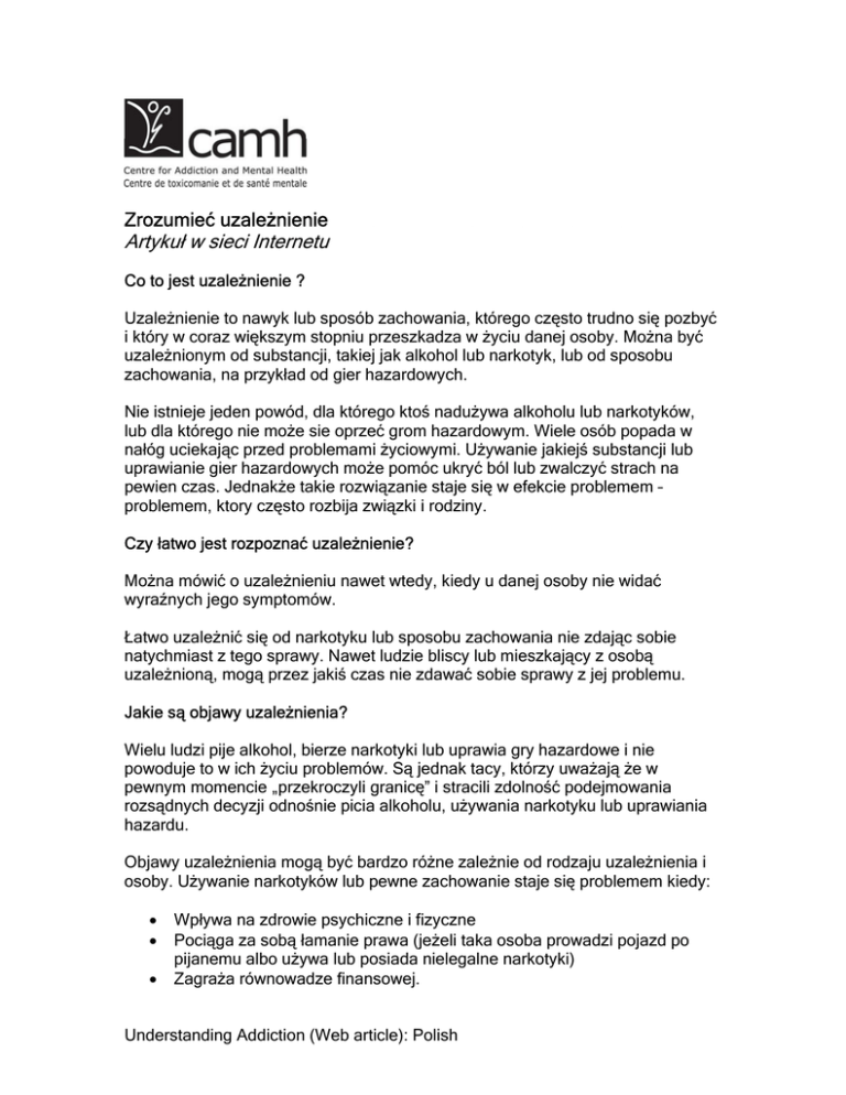 Zrozumieć uzależnienie Artykuł w sieci Internetu Co to jest uzależnienie ? Uzależnienie to nawyk lub sposób zachowania, którego często trudno się pozbyć i który w coraz większym stopniu przeszkadza w życiu danej osoby. Można być uzależnionym od substancji, takiej jak alkohol lub narkotyk, lub od sposobu zachowania, na przykład od gier hazardowych. Nie istnieje jeden powód, dla którego ktoś nadużywa alkoholu lub narkotyków, lub dla którego nie może sie oprzeć grom hazardowym. Wiele osób popada w nałóg uciekając przed problemami życiowymi. Używanie jakiejś substancji lub uprawianie gier hazardowych może pomóc ukryć ból lub zwalczyć strach na pewien czas. Jednakże takie rozwiązanie staje się w efekcie problemem – problemem, ktory często rozbija związki i rodziny. Czy łatwo jest rozpoznać uzależnienie? Można mówić o uzależnieniu nawet wtedy, kiedy u danej osoby nie widać wyraźnych jego symptomów. Łatwo uzależnić się od narkotyku lub sposobu zachowania nie zdając sobie natychmiast z tego sprawy. Nawet ludzie bliscy lub mieszkający z osobą uzależnioną, mogą przez jakiś czas nie zdawać sobie sprawy z jej problemu. Jakie są objawy uzależnienia? Wielu ludzi pije alkohol, bierze narkotyki lub uprawia gry hazardowe i nie powoduje to w ich życiu problemów. Są jednak tacy, którzy uważają że w pewnym momencie „przekroczyli granicę” i stracili zdolność podejmowania rozsądnych decyzji odnośnie picia alkoholu, używania narkotyku lub uprawiania hazardu. Objawy uzależnienia mogą być bardzo różne zależnie od rodzaju uzależnienia i osoby. Używanie narkotyków lub pewne zachowanie staje się problemem kiedy: • • • Wpływa na zdrowie psychiczne i fizyczne Pociąga za sobą łamanie prawa (jeżeli taka osoba prowadzi pojazd po pijanemu albo używa lub posiada nielegalne narkotyki) Zagraża równowadze finansowej. Understanding Addiction (Web article): Polish • • Ma negatywny wpływ na związki i przyjaźnie Przeszkadza w wykonywaniu lub utrzymaniu pracy Understanding Addiction (Web article): Polish W jaki sposób dotyka to członków rodziny? Członkowie rodziny osoby uzależnionej zazwyczaj uczą się sposobów radzenia sobie z problemami z tym zwiaząnymi. Na przykład: • • • • • Mniej komunikują się z osobą uzależnioną. Unikają rozmów na temat problemu lub nie okazją swoich uczuć. Ukrywają fakt istnienia uzależnienia przed znajomymi. Biorą na siebie odpowiedzialność za obowiązki, które zaniedbała osoba uzależniona. Czują frustrację, gniew, urazę, samotność, przerażenie lub wstyd. Czy leczenie może pomóc? Tak. Uzależnienie jest problemem zdrowotnym. Po dokonaniu właściwej diagnozy może być wyleczone. Niektórzy myślą że sami będą mogli przestać brać narkotyki lub uprawiać hazard. Chociaż istnieją tacy, którzy potrafią to zrobić, nie zawsze jest to łatwe. Programy leczenia i grupy wsparcia mogą pomóc osobie uzależnionej w zmniejszeniu lub wyeliminowaniu używania substancji lub uprawianiu hazardu. Trzeba mieć odwagę na to by zrobić pierwszy krok po pomoc, ale nie trzeba tego robić w pojedynkę. Kiedy pomoc jest konieczna? Nigdy nie jest za późno lub za wcześnie na to aby znaleźć pomoc. Być może nie jesteś pewny czy nadużywanie jakiejś substancji lub hazardu przez ciebie lub kogoś innego stwarza problemy. Albo też zdajesz sobie sprawę z tego, że istnieje problem, ale nie wiesz gdzie udać się po pomoc. Jeżeli martwisz się o inną osobę to zachęć ją aby poszukała pomocy. Jeżeli obawiasz się o siebie zacznij od rozmowy z kimś kogo szanujesz i do kogo masz zaufanie, jak na przykład: • • • • • Lekarzem lub pielęgniarką Psychologiem pracującym w Poradni dla Pracowników (Employee Assistance Program –EAP) Psychologiem lub terapeutą Pracownikiem społecznym Osobą duchowną Understanding Addiction (Web article): Polish Jak wygląda leczenie? Każde leczenie jest inne. Oto niektóre aspekty leczenia: • • • • • • • Ustalenie jaki wpływ ma uzależnienie na życie danej osoby Zaplanowanie programu leczenia i tego co będzie miało miejsce po ukończeniu leczenia Zapoznanie danej osoby z innymi dostępnymi programami i usługami społecznymi Pokazanie jakie są ryzyka związane z uzależnieniem Nauczenie podstaw zdrowego i zrównoważonego trybu życia Zapewnienie indywidualnej pomocy i ukierunkowanie jej, oraz skierowanie danej osoby do grup samopomocy lub wsparcia takich jak Alkoholicy Anonimowi (Alcoholics Anonymous – AA) Zaofiarowanie pomocy i informacji dla rodzin Nie musisz cierpieć w samotności. Pomoc jest dostępna. Gdzie można otrzymać pomoc lub więcej informacji: W Centrum Informacji d/s Uzależnień i Zdrowia Psychicznego McLaughlin (McLaughlin Addiction and Mental Health Information Centre) 1 800 463 6273, w Toronto 416 595 6111 W Ośrodku Zdrowia właściwym dla Twojego miejsca zamieszkania (Public Health Unit) – poszukaj na niebieskich stronach lokalnej książki telefonicznej lub zadzwoń pod numer 411 W Cetrum Informacji Społecznej właściwym dla Twojego miejsca zamieszkania (Community Information Centre) - poszukaj w niebieskich stronach lokalnej książki telefonicznej lub zadzwoń pod numer 411 W biurze Usług Pomocy Immigrantom właściwym dla Twojego miejsca zamieszkania (Settlement Services) www.setlement.org www.ocasi.org www.camh.net www.211Toronto.ca Zaadoptowane z: What you need to know about addiction Copyright 2002 Canada Post with the Centre for Addiction and Mental Health Understanding Addiction (Web article): Polish