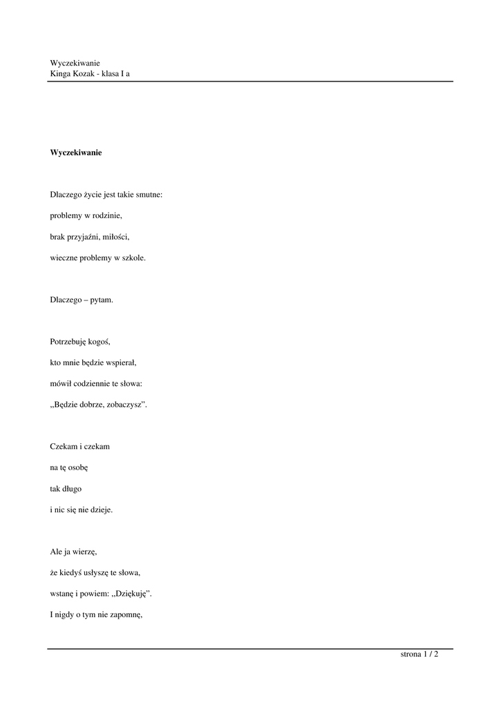 Wyczekiwanie Kinga Kozak - klasa I a Wyczekiwanie Dlaczego życie jest takie smutne: problemy w rodzinie, brak przyjaźni, miłości, wieczne problemy w szkole. Dlaczego – pytam. Potrzebuję kogoś, kto mnie będzie wspierał, mówił codziennie te słowa: ,,Będzie dobrze, zobaczysz”. Czekam i czekam na tę osobę tak długo i nic się nie dzieje. Ale ja wierzę, że kiedyś usłyszę te słowa, wstanę i powiem: ,,Dziękuję”. I nigdy o tym nie zapomnę, strona 1 / 2 Wyczekiwanie Kinga Kozak - klasa I a choćby nie wiem, co się działo. strona 2 / 2