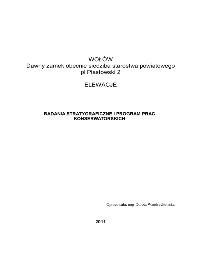 WOŁÓW Dawny zamek obecnie siedziba starostwa powiatowego pl Piastowski 2 ELEWACJE BADANIA STRATYGRAFICZNE I PROGRAM PRAC KONSERWATORSKICH Opracowała: mgr Dorota Wandrychowska 2011 1 1.KARTA TYTUŁOWA A. DANE DOTYCZĄCE OBIEKTU: Elewacje dawnego zamku książęcego, obecnie siedziby starostwa powiatowego materiał –mur ceglany, tynk wapienny pokryty farbą elewacyjną, detal architektoniczny wykonany z narzutu, kartusz z piaskowca Wołów, pl. Piastowski 2 czas powstania: połowa XIVw, XVIII odbudowa po pożarze około XIX – przebudowa na cele biurowe w latach 20 XXw, zmieniono wówczas fronton i dobudowano wieżę B. DANE DOTYCZĄCE OPRACOWANIA -Wykonawca opracowania –konserwator detalu architektonicznego – mgr Dorota Wandrychowska, Wrocław, ul. M. Konopnickiej 9d Wrocław 2011 Niniejsze opracowanie podlega ochronie praw autorskich. 2 2. WSTĘP 2.1. Przedmiot opracowania Przedmiotem niniejszego opracowania jest wystrój elewacji zespołu dawnego zamku książęcego, a następnie siedziby władz administracyjnych okręgu wołowskiego obecnie siedziby starostwa powiatowego w Wołowie, pl. Piastowski 2 2.2. Cel i zakres opracowania Celem niniejszego opracowania jest opracowanie wyników badań stratygraficznych, które pozwolą na ustalenie ewentualnej obecności pierwotnej kolorystyki i określenie stanu zachowania wystroju oraz opracowanie programu prac konserwatorskich. 2.3. Podstawa opracowania Podstawą niniejszego opracowania są badania stratygraficzne i oględziny wykonane in situ a także kwerenda ikonograficzna. 3 OPIS, HISTORIA Dawny zamek książęcy - powstał w połowie XIVw, na przestrzeni lat wskutek licznych przebudów utracił charakter obronny, a adaptacja dokonana w XIX na cele biurowe w dużym stopniu zatarła pierwotny charakter rezydencji. Obecnie jest to założenie murowane, trzyskrzydłowe, o układzie półtoratraktowym, dwupiętrowe, nakryte dachami dwuspadowymi, z czworoboczną wieżą wjazdową od północy. Plan zamku wg K. Bimlera. A najstarsza część z XIV wieku, B - cześć z XVI wieku, C - część z XVII wieku 1 Zgodnie z zamieszczonym powyżej planem skrzydło północne pochodzi z XVIw. Z okresu średniowiecza pochodzi zarys murów od strony zachodniej – ze skarpą narożną. W XVIII obiekt płonął, utracił wówczas wieżę, którą odbudowano w latach 20 XXw. Rysunek Webera przedstawia obiekt wyższy o jedno piętro, pozbawiony portyku 2 wejściowego od strony północnej 1 2 Werner F.B., Topographia oder Prodromus Delineati Silesiae Ducatus..., rękopis (1755), Biblioteka Uniwersytecka we Wrocławiu, Dział Rękopisów 4 W XVIII wieku zamek płonął, w trakcie odbudowy obniżono budynek o jedno piętro i usunięto wieżę bramną. Nad portykowym wejściem wybudowano dość dziwny w formie szczyt dekorowany potrójną arkadą, gzymsem krenelażowym oraz wysmukłym w proporcjach zwieńczeniem z wolutami po bokach, nakrytym łukowo ukształtowanym gzymsem flankowanym małymi obeliskami (archiwalne zdjęcie poniżej). Widoczne opaski okienne z parapetem podtrzymywanym przez konsolki, pierwsze piętro zaznaczone przez proste odcinkowe gzymsy nadokienne, W partii portyku pierwsze piętro zdwojonych okien zwieńczone jest wspólnym trójkątnym tympanonem. Bonie flankujące naroża skrzydeł i partii portkowej są plastyczne i wyraźnie odstają od płaskiej elewacji 3 Znaczna grubość murów uniemożliwiała swobodne zmiany umiejscowienia okien, które na przestrzeni lat posiadały jedynie różne w formie opaski. Ikonografia potwierdza, że przez setki lat budynek dekorowany był na poziomie parteru boniami tasiemkowymi. 3 http://www.wroclaw.hydral.com.pl/249096,foto.html 5 W latach 20 XXw (zdjęcie poniżej), odbudowano wieżę przejazdową, w skrzydle północnym na dachu dobudowano lukarny, zmieniono kształt szczytu na barokowy nawiązujący formą do mniejszych szczytów na bocznych skrzydłach, utrzymano wejście z portykiem zaakcentowane boniami, bonie znajdują się również na narożach skrzydeł – analogicznie jak w wieku XVIII. Kształt opasek okiennych uległ wówczas uproszczeniu, jednakże sa one wyraźnie zaznaczone na elewacji, widac również parapet podtrzymywany przez niewielkie konsolki 4 Kolejną barokizację obiektu przeprowadzono po 2 wojnie, gdy usunięto opaski okienne i wykonano pod oknami płyciny nawiązujące nieco formą do elewacji północnej z rysunku Wernera. Opaski okienne posiadają obecnie bardzo formę płaskiej listwy, bez zaznaczonych parapetów Wewnątrz dziedzińca na obiekcie wyraźnie odcisnął piętno modernizm lat 20-30 w szczególności w obrębie wejścia zaakcentowanego półkolistym balkonem, dekorowanych w typowy dla tego stylu motywami sztucznego kamienia ze szlakiem. Z dziedzińca na stronę północną przechodzi się sklepionym przejściem. Od strony południowej brama dekorowana misternie rzeźbionym kartuszem herbowym miasta wykonanym z piaskowca 4 http://www.wroclaw.hydral.com.pl/225262,foto.html 6 4. BADANIA STRATYGRAFICZNE Wykonano badania stratygraficzne na ścianie frontowej skrzydła północnego oraz wieży. Na pozostałych elewacjach nie uzyskano możliwości wykonania badań. Tab. 1 – SKRZYDŁO północne, elewacja frontowa północna - profilowanie gzymsu wieńczącego Lp . Warstwa chronol giczna Określenie warstwy 1 2 IV III 3 III brud obecnie eksponowana farba elewacyjna - biała drobnoziarnisty tynk z dodatkiem ciemnego cementu 4 5 II I 6 I brud Ugier o znacznym nasyceniu pigmentem, w ciepłym odcieniu podobny do koloru według wzornika Caparol 3D – Amber 75 Lub według Caparol Color System Sylitol Amphisilan – Terra 12 Tynk wapienny gruboziarnisty Uwagi Warstwa powodująca zatarcie rysunku i ostrości profilowań narzut profilowania, powierzchnia gładka 7 I mur ceglany Gzyms posiada profilowane strzępia, co świadczy o tym, że powstał w trakcie odbudowy budynku, w okresie tym malowany był na kolor ugrowy Tab. 2 – SKRZYDŁO północne, elewacja fron