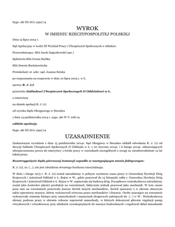 Sygn. akt III AUa 1392/14 WYROK W IMIENIU RZECZYPOSPOLITEJ POLSKIEJ Dnia 15 lipca 2015 r. Sąd Apelacyjny w Łodzi III Wydział Pracy i Ubezpieczeń Społecznych w składzie: Przewodniczący: SSA Jacek Zajączkowski (spr.) Sędziowie:SSA Iwona Szybka SSA Dorota Rzeźniowiecka Protokolant: st. sekr. sąd. Joanna Sztuka po rozpoznaniu na rozprawie w dniu 10 lipca 2015 r. w Ł. sprawy R. J. (1) przeciwko Zakładowi Ubezpieczeń Społecznych II Oddziałowi w Ł. o emeryturę na skutek apelacji R. J. (1) od wyroku Sądu Okręgowego w Sieradzu z dnia 13 października 2014 r. sygn. akt IV U 108/14 oddala apelację. Sygn. akt III AUa 1392/14 UZASADNIENIE Zaskarżonym wyrokiem z dnia 13 października 2014r. Sąd Okręgowy w Sieradzu oddalił odwołania R. J. (1) od decyzji Zakładu Ubezpieczeń Społecznych II Oddziału w Ł. z 20 stycznia 2014r. i 6 lutego 2014r. odmawiających ubezpieczonemu prawa do emerytury z tytułu pracy w warunkach szczególnych z uwagi na nieudowodnienie 15 lat takiej pracy. Rozstrzygnięcie Sądu pierwszej instancji zapadło w następującym stanie faktycznym: R. J. (2), ur. (...), nie jest członkiem otwartego funduszu emerytalnego. W dniu 1 lutego 1973 r. R. J. (2) został zatrudniony w pełnym wymiarze czasu pracy w Generalnej Dyrekcji Dróg Krajowych i Autostrad Oddział w Ł. Rejon w W., gdzie pracował do 15 listopada 1989 r. Generalna Dyrekcja Dróg Krajowych i Autostrad Oddział w Ł. Rejon w W. zajmowała się budową dróg. Początkowo wnioskodawca zatrudniony został jako kontroler jakości produkcji na warsztatach, faktycznie jednak pracował jako mechanik. W tym czasie poza nim na warsztatach pracowało jeszcze dwóch innych mechaników, dwóch spawaczy a w okresie zimowym także operatorzy maszyn, którzy wykonywali wówczas prace mechaników i ślusarzy. Osoby pracujące na warsztacie wykonywały remonty bieżące przy samochodach i maszynach drogowych należących do (...) w W.. Wnioskodawca ubrany podczas pracy w ubranie robocze naprawiał samochody, w których dokonywał głównie regulacji pomp wtryskowych i wtryskiwaczy przy silnikach wysokoprężnych do maszyn budowlanych i regulował skład mieszkanki przy gaźnikach. Silniki, przy jakich pracował wnioskodawca, były silnikami od samochodów głównie marki Ż. ale też marki S., J. czy Z. oraz od maszyn drogowych takich jak walce, równiarki, spycharki, koparki, ładowarki, pługi wirnikowe a zimą także piaskarki. Naprawy silników od sprzętu drogowego nie odbywały się w kanałach. Sprzęt drogowy stał na placu, silniki naprawiali w nim operatorzy tego sprzętu a jak czegoś nie potrafili naprawić, pomagał im głównie wnioskodawca. Zdarzało się, że silnik trzeba było z tego sprzętu wymontować. Na kanał wjeżdżały tylko samochody z silnikami Diesla a czasami także samochody te były naprawiane na placu. Wnioskodawca w czasie pracy zajmował się naprawami i remontami piaskarek, podczas których wykonywał wszelkie niezbędne prace a po godzinach jeździł na miejsca ich awarii. Wnioskodawca malował też silniki od piaskarek. Inni mechanicy zajmowali się naprawami i remontami innych maszyn drogowych. Wnioskodawca poza tym, że pracował jako mechanik, kontrolował pracę pozostałych osób pracujących w warsztacie przy tych samych pracach jakie sam wykonywał. Spośród osób pracujących w tym czasie na warsztacie jedynie spawacze mieli wypłacane dodatki za pracę w warunkach szkodliwych. W okresie od 24 października 1973 r. do 20 grudnia 1973 r. R. J. (2) odbywał zasadniczą służbę wojskową. W dniach od 20 maja 1974 r. do 24 maja 1974 r. wnioskodawca został przeszkolony na stanowisku diagnostycznym w zakresie obsługi samochodów osobowych. W dniu 1 stycznia 1975r. pracodawca powierzył mu zorganizowanie a następnie prowadzenie punktu diagnostyki samochodowej na warsztatach (...) w W.. W tym czasie zakład ten otrzymał urządzenie rolkowe do sprawdzania pracy hamulców a pozostałe urządzenia diagnostyczne miały być zebrane z całego zakładu i skupione w tym właśnie punkcie. Punkt taki powstał i od tego czasu wnioskodawca i pozostali mechanicy pracowali tylko na tym punkcie. W punkcie tym były sprawdzane tylko samochodu należące do (...) w W., głównie samochody marki Ż.. Przy tych samochodach zasadniczo wnioskodawca sprawdzał silniki, jeden mechanik sprawdzał przednie zawieszenie a drugi układ hamulcowy. Podział pracy pomiędzy mechaników wynikał z ich ustaleń. W dniach od 18 listopada 1975 r. do 29 listopada 1975 r. wnioskodawca uczęszczał na kurs II stopnia w zakresie diagnostyki samochodowej. W dniu 30 maja 1975 r. wnioskodawca wystąpił do pracodawcy o wydanie pozwolenia na prowadzenie samochodu służbowego i pozwolenia takiego pracodawca udzielił mu w tym samym dniu. Samochodem służbowym marki Ż. wnioskodawca po godzinach pracy woził do szlifowania do miejscowości D. korpusy silników oraz jeździł na miejsca awarii piaskarek. Inni mechanicy także mieli zezwolenia na użytkowanie samochodów marki Ż., którymi dojeżdżali na miejsca awarii innych maszyn drogowych. W dniu 1 czerwca 1976 r. wnioskodawca przeniesiony został na stanowisko majstra warsztatowego. Po zmianie angażu wnioskodawca pracował w tym samym miejscu, gdzie wcześniej i z tymi samymi ludźmi. Jego praca zmieniła się o tyle, że miał trochę więcej pracy papierkowej. Wnioskodawca sprawdzał listę obecności, rozdzielał prace pomiędzy pracowników warsztatu, wystawiał im zlecenia robocze, obliczał zlecenia warsztatowe na remonty przeprowadzane w warsztacie, rozliczał z pobranych materiałów, zgłaszał zapotrzebowania na piśmie na części zamienne i materiały, stwierdzał wykonywanie naprawy i obsługi środków trwałych w kartach drogowych, prowadził kartotekę wyposażenia stacji diagnostycznej, sprawował nadzór nad wykonywaniem konserwacji postojowej pojazdów mechanicznych i stwierdzał gotowość techniczną środków trwałych na kartac