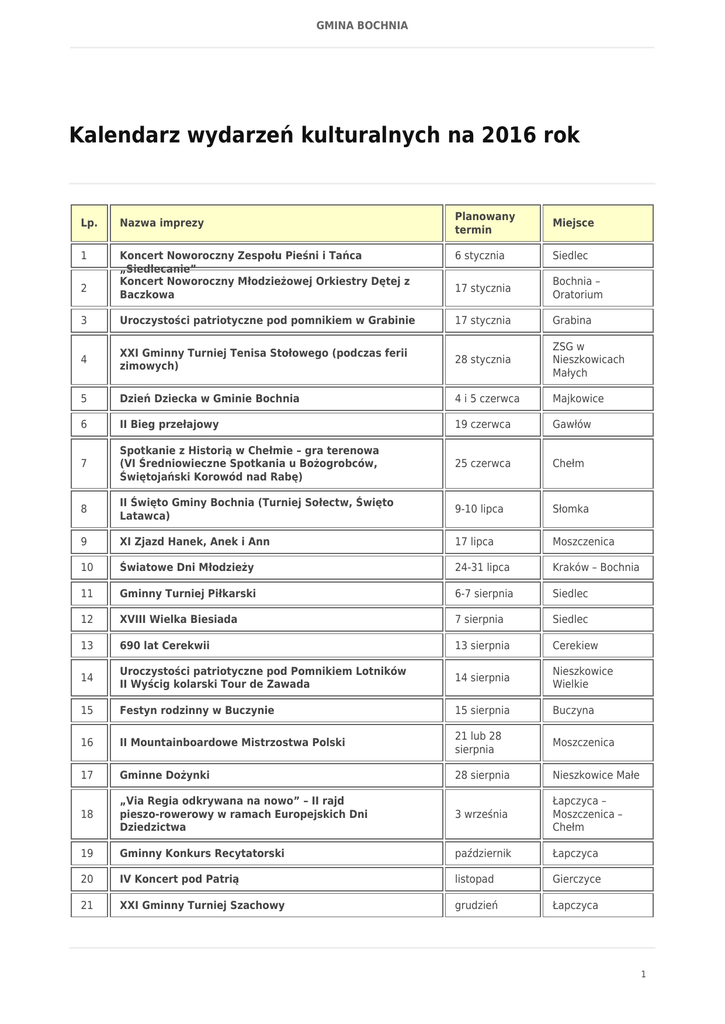 GMINA BOCHNIA Kalendarz wydarzeń kulturalnych na 2016 rok Planowany termin Miejsce Koncert Noworoczny Zespołu Pieśni i Tańca „Siedlecanie” Koncert Noworoczny Młodzieżowej Orkiestry Dętej z Baczkowa 6 stycznia Siedlec 17 stycznia Bochnia – Oratorium 3 Uroczystości patriotyczne pod pomnikiem w Grabinie 17 stycznia Grabina 4 XXI Gminny Turniej Tenisa Stołowego (podczas ferii zimowych) 28 stycznia ZSG w Nieszkowicach Małych 5 Dzień Dziecka w Gminie Bochnia 4 i 5 czerwca Majkowice 6 II Bieg przełajowy 19 czerwca Gawłów 7 Spotkanie z Historią w Chełmie – gra terenowa (VI Średniowieczne Spotkania u Bożogrobców, Świętojański Korowód nad Rabę) 25 czerwca Chełm 8 II Święto Gminy Bochnia (Turniej Sołectw, Święto Latawca) 9-10 lipca Słomka 9 XI Zjazd Hanek, Anek i Ann 17 lipca Moszczenica 10 Światowe Dni Młodzieży 24-31 lipca Kraków – Bochnia 11 Gminny Turniej Piłkarski 6-7 sierpnia Siedlec 12 XVIII Wielka Biesiada 7 sierpnia Siedlec 13 690 lat Cerekwii 13 sierpnia Cerekiew 14 Uroczystości patriotyczne pod Pomnikiem Lotników II Wyścig kolarski Tour de Zawada 14 sierpnia Nieszkowice Wielkie 15 Festyn rodzinny w Buczynie 15 sierpnia Buczyna 16 II Mountainboardowe Mistrzostwa Polski 21 lub 28 sierpnia Moszczenica 17 Gminne Dożynki 28 sierpnia Nieszkowice Małe 18 „Via Regia odkrywana na nowo” – II rajd pieszo-rowerowy w ramach Europejskich Dni Dziedzictwa 3 września Łapczyca – Moszczenica – Chełm 19 Gminny Konkurs Recytatorski październik Łapczyca 20 IV Koncert pod Patrią listopad Gierczyce 21 XXI Gminny Turniej Szachowy grudzień Łapczyca Lp. Nazwa imprezy 1 2 1 GMINA BOCHNIA 22 Wystawa szopek i ozdób choinkowych grudzień 23 Galeria Chełm (koncerty, wystawy, warsztaty, spotkania autorskie) min. raz na kwartał Siedlec 2