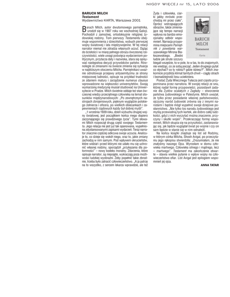 NIGDY WIĘCEJ nr 15, LATO 2006 BARUCH MILCH Testament Wydawnictwo KARTA, Warszawa 2001 aruch Milch, autor dwutomowego pamiętnika, B urodził się w 1907 roku we wschodniej Galicji. Pochodził z zamożnej, ortodoksyjnie religijnej ży- dowskiej rodziny. Tom pierwszy Testamentu obejmuje wspomnienia z dzieciństwa, wybuch pierwszej wojny światowej i lata międzywojenne. W tej relacji narrator niemal nie zdradza własnych uczuć. Dążąc do ścisłości i w miarę pełnego obrazu ówczesnej rzeczywistości, wiele uwagi poświęca wydarzeniom politycznym, przytacza daty i nazwiska, stara się opisywać następstwa decyzji przywódców państw. Równolegle ze zmianami na świecie zmienia się sytuacja w najbliższym otoczeniu Milcha. Pamiętnikarz uważnie odnotowuje przejawy antysemityzmu ze strony miejscowej ludności, opisuje na przykład trudności ze zdaniem matury i zarządzenie numerus clausus wprowadzone na większości uniwersytetów. Swoją wymarzoną medycynę musiał studiować na Uniwersytecie w Pradze. Milch świetnie oddaje też stan ówczesnej wiedzy przeciętnego człowieka na temat stosunków międzynarodowych: „Po zewnętrznych nastrojach zbrojeniowych, pięknym wyglądzie polskiego żołnierza i oficera, po wielkich obiecankach i zapewnieniach rządowych każdy był dobrej myśli”. „1 września 1939 roku, dzień wybuchu drugiej wojny światowej, jest początkiem końca mego dopiero zaczynającego się prawdziwego życia”. Tymi słowami Milch rozpoczął drugą część swojego Testamentu. Jego relacja nie jest już tak opanowana, wypełniona zdystansowanymi zapisami wydarzeń. Teraz narrator znacznie częściej odkrywa swoje uczucia. Analizuje to, co dzieje się wokół niego, oraz to, jakie zmiany zachodzą w nim samym. Pod wpływem okrucieństw, które widział i przed którymi nie udało mu się uchronić własnej rodziny, sporządził „przykazania dla potomności” – nowy kodeks moralny. Zdarzenia, które opisuje narrator, są niepojęte, wykraczają poza możliwości ludzkiej wyobraźni. Żeby popełnić takie zbrodnie, trzeba było zatracić człowieczeństwo. „A ja patrzę na to wszystko, z sercem lekarza wprawdzie, ale też Żyda i człowieka, ciarki jakby mrówki przechodzą mi przez ciało”. Oprócz wstrząsających obrazów, także zmieniające się tempo narracji wpływa na bardzo emocjonalny odbiór wspomnień. Narracja przypomina miejscami Pamiętnik z powstania warszawskiego Mirona Białoszewskiego. „Biedni ludzie jak strute szczury biegali wszędzie, to w pole, to w las, to do znajomych, nie wiedząc, co ze sobą począć. Jeden drugiego pytał: co słychać? co ty robisz? gdzie idziesz?”. Milch znakomicie przybliża klimat tamtych chwil – ciągły strach i beznadziejność losu uciekiniera. Postać Żyda Wiecznego Tułacza jest często przypominana przez narratora. W swojej relacji ze snu, której nadał formę przypowieści, pozostawił zadanie dla Żydów ocalałych z Zagłady – stworzenie państwa żydowskiego w Palestynie. Milch uważał, że tylko przez posiadanie własnej państwowości, ojczyzny naród żydowski zrówna się z innymi narodami i będzie mógł wypełnić swoje dziejowe posłannictwo. „Nie tylko los narodu żydowskiego jest myślą przewodnią tych kartek, ale dobro całej ludzkości, gdyż z nich wyczytać można znaczenie, przyczyny i skutki wojen”. Przekraczając formę wspomnień, Milch skupia się na przyszłości, zastanawiając się, jak będzie wyglądał świat po wojnie i czy on sam będzie w stanie się w nim odnaleźć. Na końcu książki znajduje się list od Rodziny, w którym córka Milcha, Shosh Avigal, po przeczytaniu jego rękopisu stwierdziła: „Zrozumiałam, że nie znałyśmy naszego Ojca. Wyrosłam w domu człowieka martwego. Człowieka silnego i mądrego, lecz – martwego”. Testament ma zakończenie otwarte – stawia wielkie pytanie o wpływ wojny na człowieczeństwo ofiar. List Avigal jest epilogiem wspomnień jej ojca. ANNA TATAR