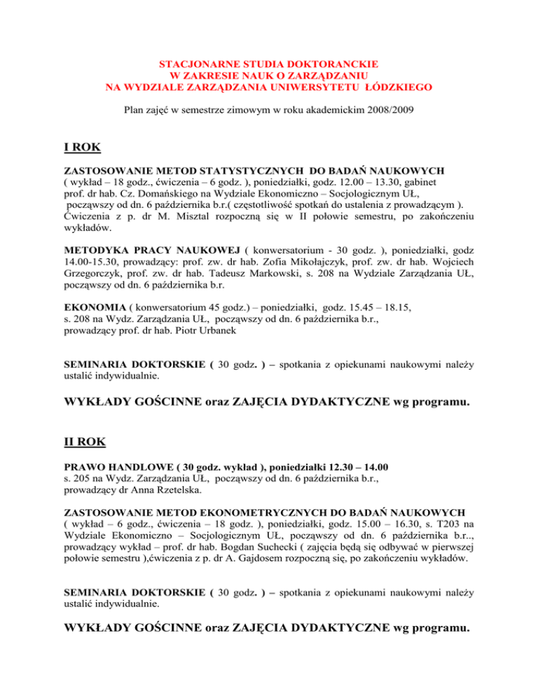 STACJONARNE STUDIA DOKTORANCKIE W ZAKRESIE NAUK O ZARZĄDZANIU NA WYDZIALE ZARZĄDZANIA UNIWERSYTETU ŁÓDZKIEGO Plan zajęć w semestrze zimowym w roku akademickim 2008/2009 I ROK ZASTOSOWANIE METOD STATYSTYCZNYCH DO BADAŃ NAUKOWYCH ( wykład – 18 godz., ćwiczenia – 6 godz. ), poniedziałki, godz. 12.00 – 13.30, gabinet prof. dr hab. Cz. Domańskiego na Wydziale Ekonomiczno – Socjologicznym UŁ, począwszy od dn. 6 października b.r.( częstotliwość spotkań do ustalenia z prowadzącym ). Ćwiczenia z p. dr M. Misztal rozpoczną się w II połowie semestru, po zakończeniu wykładów. METODYKA PRACY NAUKOWEJ ( konwersatorium - 30 godz. ), poniedziałki, godz 14.00-15.30, prowadzący: prof. zw. dr hab. Zofia Mikołajczyk, prof. zw. dr hab. Wojciech Grzegorczyk, prof. zw. dr hab. Tadeusz Markowski, s. 208 na Wydziale Zarządzania UŁ, począwszy od dn. 6 października b.r. EKONOMIA ( konwersatorium 45 godz.) – poniedziałki, godz. 15.45 – 18.15, s. 208 na Wydz. Zarządzania UŁ, począwszy od dn. 6 października b.r., prowadzący prof. dr hab. Piotr Urbanek SEMINARIA DOKTORSKIE ( 30 godz. ) – spotkania z opiekunami naukowymi naleŜy ustalić indywidualnie. WYKŁADY GOŚCINNE oraz ZAJĘCIA DYDAKTYCZNE wg programu. II ROK PRAWO HANDLOWE ( 30 godz. wykład ), poniedziałki 12.30 – 14.00 s. 205 na Wydz. Zarządzania UŁ, począwszy od dn. 6 października b.r., prowadzący dr Anna Rzetelska. ZASTOSOWANIE METOD EKONOMETRYCZNYCH DO BADAŃ NAUKOWYCH ( wykład – 6 godz., ćwiczenia – 18 godz. ), poniedziałki, godz. 15.00 – 16.30, s. T203 na Wydziale Ekonomiczno – Socjologicznym UŁ, począwszy od dn. 6 października b.r.., prowadzący wykład – prof. dr hab. Bogdan Suchecki ( zajęcia będą się odbywać w pierwszej połowie semestru ),ćwiczenia z p. dr A. Gajdosem rozpoczną się, po zakończeniu wykładów. SEMINARIA DOKTORSKIE ( 30 godz. ) – spotkania z opiekunami naukowymi naleŜy ustalić indywidualnie. WYKŁADY GOŚCINNE oraz ZAJĘCIA DYDAKTYCZNE wg programu. III ROK KOMERCJALIZACJA TECHNOLOGII ( ćwiczenia – 30 godz. ) poniedziałki, godz. 14.15 – 15.45, s. 205, Wydział Zarządzania UŁ, począwszy od dn. 6 października b.r., prowadzący – dr D. Trzmielak. WYKŁADY SPECJALIZACYJNE ( 30 godz. ) I SEMINARIA DOKTORSKIE ( 30 godz. ) – tematykę i termin wykładów oraz termin spotkań z opiekunami naukowymi naleŜy ustalić indywidualnie. WYKŁADY GOŚCINNE oraz ZAJĘCIA DYDAKTYCZNE do zrealizowania w wymiarze podanym w programie studiów. IV ROK WYKŁADY SPECJALIZACYJNE ( 15 godz. ) , SEMINARIA DOKTORSKIE ( 30 godz. ) – tematykę i termin wykładów oraz termin spotkań z opiekunami naukowymi naleŜy ustalić indywidualnie. WYKŁADY GOŚCINNE oraz ZAJĘCIA DYDAKTYCZNE do zrealizowania w wymiarze podanym w programie studiów.