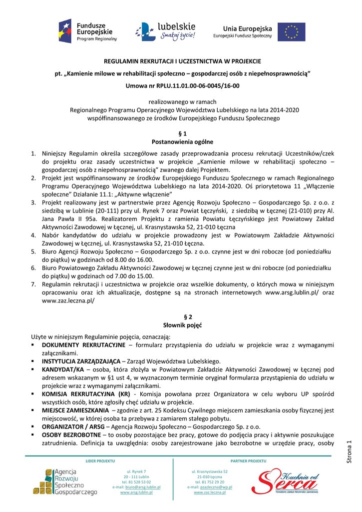 REGULAMIN REKRUTACJI I UCZESTNICTWA W PROJEKCIE pt. „Kamienie milowe w rehabilitacji społeczno – gospodarczej osób z niepełnosprawnością” Umowa nr RPLU.11.01.00-06-0045/16-00 realizowanego w ramach Regionalnego Programu Operacyjnego Województwa Lubelskiego na lata 2014-2020 współfinansowanego ze środków Europejskiego Funduszu Społecznego §1 Postanowienia ogólne 1. Niniejszy Regulamin określa szczegółowe zasady przeprowadzania procesu rekrutacji Uczestników/czek do projektu oraz zasady uczestnictwa w projekcie „Kamienie milowe w rehabilitacji społeczno – gospodarczej osób z niepełnosprawnością” zwanego dalej Projektem. 2. Projekt jest współfinansowany ze środków Europejskiego Funduszu Społecznego w ramach Regionalnego Programu Operacyjnego Województwa Lubelskiego na lata 2014-2020. Oś priorytetowa 11 „Włączenie społeczne” Działanie 11.1: „Aktywne włączenie” 3. Projekt realizowany jest w partnerstwie przez Agencję Rozwoju Społeczno – Gospodarczego Sp. z o.o. z siedzibą w Lublinie (20-111) przy ul. Rynek 7 oraz Powiat Łęczyński, z siedzibą w Łęcznej (21-010) przy Al. Jana Pawła II 95a. Realizatorem Projektu z ramienia Powiatu Łęczyńskiego jest Powiatowy Zakład Aktywności Zawodowej w Łęcznej, ul. Krasnystawska 52, 21-010 Łęczna 4. Nabór kandydatów do udziału w projekcie prowadzony jest w Powiatowym Zakładzie Aktywności Zawodowej w Łęcznej, ul. Krasnystawska 52, 21-010 Łęczna. 5. Biuro Agencji Rozwoju Społeczno – Gospodarczego Sp. z o.o. czynne jest w dni robocze (od poniedziałku do piątku) w godzinach od 8.00 do 16.00. 6. Biuro Powiatowego Zakładu Aktywności Zawodowej w Łęcznej czynne jest w dni robocze (od poniedziałku do piątku) w godzinach od 7.00 do 15.00. 7. Regulamin rekrutacji i uczestnictwa w projekcie oraz wszelkie dokumenty, o których mowa w niniejszym opracowaniu oraz ich aktualizacje, dostępne są na stronach internetowych www.arsg.lublin.pl/ oraz www.zaz.leczna.pl/ Użyte w niniejszym Regulaminie pojęcia, oznaczają: DOKUMENTY REKRUTACYJNE – formularz przystąpienia do udziału w projekcie wraz z wymaganymi załącznikami. INSTYTUCJA ZARZĄDZAJĄCA – Zarząd Województwa Lubelskiego. KANDYDAT/KA – osoba, która złożyła w Powiatowym Zakładzie Aktywności Zawodowej w Łęcznej pod adresem wskazanym w §1 ust 4, w wyznaczonym terminie oryginał formularza przystąpienia do udziału w projekcie wraz z wymaganymi załącznikami. KOMISJA REKRUTACYJNA (KR) - Komisja powołana przez Organizatora w celu wyboru UP spośród wszystkich osób, które zgłosiły chęć udziału w projekcie. MIEJSCE ZAMIESZKANIA – zgodnie z art. 25 Kodeksu Cywilnego miejscem zamieszkania osoby fizycznej jest miejscowość, w której osoba ta przebywa z zamiarem stałego pobytu. ORGANIZATOR / ARSG – Agencja Rozwoju Społeczno – Gospodarczego Sp. z o.o. OSOBY BEZROBOTNE – to osoby pozostające bez pracy, gotowe do podjęcia pracy i aktywnie poszukujące zatrudnienia. Definicja ta uwzględnia: osoby zarejestrowane jako bezrobotne w urzędzie pracy, osoby LIDER PROJEKTU ul. Rynek 7 20 - 111 Lublin tel. 81 528 53 02 e-mail: [email protected] www.arsg.lublin.pl PARTNER PROJEKTU ul. Krasnystawska 52 21-010 Łęczna tel. 81 752 29 20 e-mail: [email protected] www.zaz.leczna.pl Strona 1 §2 Słownik pojęć bezrobotne niepozostające w rejestrach urzędów pracy, osoby kwalifikujące się do urlopu macierzyńskiego lub rodzicielskiego, które są bezrobotne w rozumieniu niniejszej definicji (nie pobierają świadczeń z tytułu urlopu). Status na rynku pracy jest określany w dniu rozpoczęcia uczestnictwa w projekcie. OSOBY Z NIEPEŁNOSPRAWNOŚCIĄ – za osoby z niepełnosprawnością uznaje się osoby z niepełnosprawnością w świetle przepisów ustawy z dnia 27 sierpnia 1997r. o rehabilitacji zawodowej i społecznej oraz zatrudnieniu osób niepełnosprawnych (Dz. U. z 2011r., Nr 127 poz.721, z późn. zm.), a także osoby z zaburzeniami psychicznymi, o których mowa w ustawie z dnia 19 sierpnia 1994r. o ochronie zdrowia psychicznego (Dz.U. z 2011r. Nr 231 poz. 1375), tj. osoby z odpowiednim orzeczeniem lub innym dokumentem poświadczającym stan zdrowia PARTNER – Powiat Łęczyński, z siedzibą w Łęcznej (21-010) przy Al. Jana Pawła II 95a PZAZ – realizator projektu w imieniu Partnera, tj. Powiatowy Zakład Aktywności Zawodowej w Łęcznej z siedzibą w Łęcznej (21-010) przy ul. Krasnystawskiej 52 PROJEKT – projekt „Kamienie milowe w rehabilitacji społeczno – gospodarczej osób z niepełnosprawnością” REGULAMIN – niniejszy Regulamin rekrutacji i uczestnictwa w projekcie „Kamienie milowe w rehabilitacji społeczno – gospodarczej osób z niepełnosprawnością” UCZESTNIK/CZKA PROJEKTU (UP) – osoba zakwalifikowana do udziału w projekcie, zgodnie z zasadami określonymi w niniejszym regulaminie. §3 Informacje o Projekcie 1. Celem głównym projektu jest reintegracja społeczna i zawodowa 50 osób niepełnosprawnych (30 kobiet) z terenu powiatu łęczyńskiego (w tym miasta Łęczna) i zwiększenie ich udziału w życiu społecznym i zawodowym poprzez uczestnictwo w kompleksowym programie reintegracji i rehabilitacji społeczno zawodowej realizowanej przez Agencję Rozwoju Społeczno – Gospodarczego Sp. z o.o. we współpracy z Powiatowym Zakładem Aktywności Zawodowej w Łęcznej i uzyskanie zatrudnienia na poziomie 25% przez UP po opuszczeniu programu. 2. Projekt realizowany jest w terminie od 01.01.2017 r. do 31.12.2018 r. 3. Formy wsparcia: stworzenie indywidualnej ścieżki reintegracji/ IPD (obligatoryjne dla wszystkich Uczestników/czek Projektu) warsztaty motywacyjne (dla wszystkich Uczestników/czek Projektu wsparcie psychologiczne (dla tych Uczestników/czek Projektu, którzy odczuwają potrzebę wsparcia psychologicznego) wsparcie trenerek pracy (dla wszystkich Uczestników/czek Projektu szkolenia gastronomiczne lub związane z obsługą pralni chemicznej