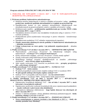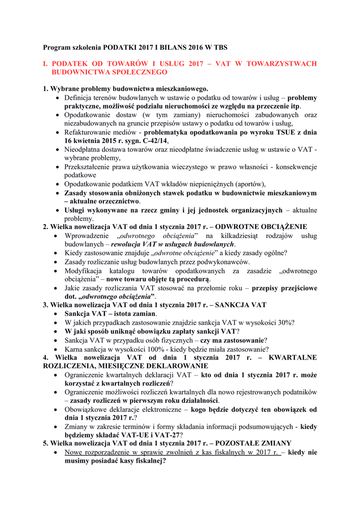 Program szkolenia PODATKI 2017 I BILANS 2016 W TBS I. PODATEK OD TOWARÓW I USŁUG 2017 – VAT W TOWARZYSTWACH BUDOWNICTWA SPOŁECZNEGO 1. Wybrane problemy budownictwa mieszkaniowego. Definicja terenów budowlanych w ustawie o podatku od towarów i usług – problemy praktyczne, możliwość podziału nieruchomości ze względu na przeczenie itp. Opodatkowanie dostaw (w tym zamiany) nieruchomości zabudowanych oraz niezabudowanych na gruncie przepisów ustawy o podatku od towarów i usług, Refakturowanie mediów - problematyka opodatkowania po wyroku TSUE z dnia 16 kwietnia 2015 r. sygn. C-42/14, Nieodpłatna dostawa towarów oraz nieodpłatne świadczenie usług w ustawie o VAT wybrane problemy, Przekształcenie prawa użytkowania wieczystego w prawo własności - konsekwencje podatkowe Opodatkowanie podatkiem VAT wkładów niepieniężnych (aportów), Zasady stosowania obniżonych stawek podatku w budownictwie mieszkaniowym – aktualne orzecznictwo. Usługi wykonywane na rzecz gminy i jej jednostek organizacyjnych – aktualne problemy. 2. Wielka nowelizacja VAT od dnia 1 stycznia 2017 r. – ODWROTNE OBCIĄŻENIE Wprowadzenie „odwrotnego obciążenia” na kilkadziesiąt rodzajów usług budowlanych – rewolucja VAT w usługach budowlanych. Kiedy zastosowanie znajduje „odwrotne obciążenie” a kiedy zasady ogólne? Zasady rozliczanie usług budowlanych przez podwykonawców. Modyfikacja katalogu towarów opodatkowanych za zasadzie „odwrotnego obciążenia” – nowe towaru objęte tą procedurą. Jakie zasady rozliczania VAT stosować na przełomie roku – przepisy przejściowe dot. „odwrotnego obciążenia”. 3. Wielka nowelizacja VAT od dnia 1 stycznia 2017 r. – SANKCJA VAT Sankcja VAT – istota zamian. W jakich przypadkach zastosowanie znajdzie sankcja VAT w wysokości 30%? W jaki sposób uniknąć obowiązku zapłaty sankcji VAT? Sankcja VAT w przypadku osób fizycznych – czy ma zastosowanie? Karna sankcja w wysokości 100% - kiedy będzie miała zastosowanie? 4. Wielka nowelizacja VAT od dnia 1 stycznia 2017 r. – KWARTALNE ROZLICZENIA, MIESIĘCZNE DEKLAROWANIE Ograniczenie kwartalnych deklaracji VAT – kto od dnia 1 stycznia 2017 r. może korzystać z kwartalnych rozliczeń? Ograniczenie możliwości rozliczeń kwartalnych dla nowo rejestrowanych podatników – zasady rozliczeń w pierwszym roku działalności. Obowiązkowe deklaracje elektroniczne – kogo będzie dotyczyć ten obowiązek od dnia 1 stycznia 2017 r.? Zmiany w zakresie terminów i formy składania informacji podsumowujących - kiedy będziemy składać VAT-UE i VAT-27? 5. Wielka nowelizacja VAT od dnia 1 stycznia 2017 r. – POZOSTAŁE ZMIANY Nowe rozporządzenie w sprawie zwolnień z kas fiskalnych w 2017 r. – kiedy nie musimy posiadać kasy fiskalnej? Podniesienie limitu zwolnienia z opodatkowana ze względu na obrót – zasady przyujściowe, Zmiany w zakresie zasad i terminów zwrotu podatku – kiedy będzie przysługiwał zwrot w terminie 25 dnia a kiedy 60 dni? Zmiany w zakresie terminów odliczania VAT – czy możliwe jest odliczenie VAT w odwrotnym obciążeniu w dwóch kolejnych okresach rozliczeniowych? Kiedy organ podatkowy będzie uprawniony do wykreślenia podatnika z rejestru VAT? 6. Jednolity plik kontrolny – istota zmian. Zakres stosowania jednolitego pliku kontrolnego w 2016 r. i w latach kolejnych. Kto jest obowiązany do wdrożenia JPK od dnia 1 lipca 2016 r.? Jaką strukturę posiada JPK; jakie dane należy umieszczać w module faktury i rejestry VAT; czy zakres danych JPK pokrywa się z zakresem dotychczasowej ewidencji księgowej? Kto będzie obowiązany od dnia 1 stycznia 2017 r. do przesyłania organom podatkowym elektronicznych rejestrów VAT? Jakie dane powinny zawierać elektroniczne rejestry VAT? Czy format JPK obejmuje faktury zakupowe? Skutki wprowadzenia JPK i obowiązku przekazywania rejestrów VAT na sposób prowadzenia kontroli. II. TOWARZYSTWO BUDOWNICTWA MIESZKALNEGO (TBS) JAKO PŁATNIK PODATKU DOCHODOWEGO OD OSÓB FIZYCZNYCH. Obowiązki TBS jako płatnika podatku dochodowego od osób fizycznych. 1. Rozliczenie pracowników zatrudnionych na podstawie umowy o pracę. 1). Przychód ze stosunku pracy. - Definicja przychodu ze stosunku pracy. - Rodzaje świadczeń uznawanych za przychód ze stosunku pracy. - Zasady rozliczania przychodu ze stosunku pracy. 2). Nieodpłatne świadczenia ponoszone przez TBS rzecz pracowników. - Znaczenie wyroku Trybunału Konstytucyjnego z dnia 8 lipca 2014 roku (K 7/13). - Umorzenie pożyczki. - Rozliczenie prywatnych rozmów telefonicznych. - Podatkowe rozliczenie kosztu zakwaterowanie pracownika. - Dodatkowe ubezpieczenie pracowników. - Skutki podatkowe udostępnienia pracownikowi samochodu służbowego. - Pozostałe przypadki. 3). Moment ustalenia przychodu, zwolnienia oraz szczególne zasady rozliczeń podatkowych pracowników. - Skutki podatkowe oraz zasady rozliczeń imprez integracyjnych oraz konferencji. - Rozliczanie wycieczek. - Zapomogi. - Zwrot kosztów wykorzystania samochodu prywatnego. - Bony towarowe. - Zasady rozliczania wyjazdów służbowych. - Zakwaterowanie pracowników poza miejscem zamieszkania. - Opodatkowanie nagród oraz wygranych w konkursach organizowanych przez TBS. - Zasady rozliczania szkoleń oraz innych form dokształcania i doskonalenia zawodowego. - Świadczenia przewidziane przepisami BHP – podatkowe ujęcie kosztów odzieży roboczej, okularów, posiłków regeneracyjnych, badań lekarskich itp. - Świadczenia na rzecz pracowników finansowane z ZFŚS - Zasady rozliczanie tzw. ulgi prorodzinnej. - Rozliczenia pracowników z tytułu praw autorskich. 4). Zwolnienia podatkowe wpływające na rozliczenia przychodu ze stosunku pracy. 5). Obowiązki TBS w zakresie pobierania oraz rozliczania składek na ubezpieczenie społeczne oraz zdrowotne. 2. Rozliczanie przez TBS najemców oraz właścicieli mieszkań. 1). Nieodpłatne świadczenia ponoszone przez TBS na rzecz najemców oraz wła