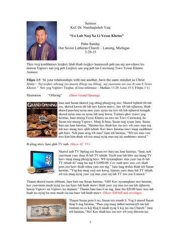 Sermon Kxf. Dr. Numlaajtsheb Yaaj “Ua Lub Neej Xa Li Yexus Khetos” Palm Sunday Our Savior Lutheran Church – Lansing, Michigan 3-29-15 Thov txoj koobhmoov toxjkev hlub thiab txojkev haumxeeb pub rau nej sawvdaws los ntawm Vajtswv uas yog peb Leejtxiv uas yog peb tus Cawmseej Tswv Yexus Khetos. Asmees. Filipis 2:5 “In your relationships with one another, have the same mindset as Christ Jesus:– Nej txojkev sibraug zoo ntawm ibleeg rau ibleeg, nej yuavtsum xav zoo ib yam li Yexus Khetos.” Nov yog Vajtswv Txojlus. (Cross reference – Mathais 11:29, Loos 15:3, Filipis 1:1) Illustration “Offering” (Show Grand Opening) Jane and Susan nkawd yog obtug phoojywg zoo. Nkawd lojhlob tib lub zos, nkawd kawm tib lub tsev kawm ntawv, tiav tib lub sijhawm, thiab nkawd puavleej nyias mus yuav nyias tus txiv tib lub sijhawm tomqab nkawd nyias mus ua nyias lub neej lawm. Tiamsis qhov txawv yog haistias, Jane ntseeg Yexus Khetos ua nws tus Tswv Cawmseej, ho Susan tsis ntseeg Vajtswv. Muaj ib hmo, Susan tuaj xyuas Jane. Susan hais rau Jane haistias, “Hmono kuv thiab kuv tus txiv wb yuav mus noj lub tsev muag mov qhib tshiab. Kuv hnov haistias lawv muaj zaubhmov qab heev. Neb puas nrog wb mus? Jane teb haistias, “Wb tsis mus vim nws kim kim thiab wb tsis muaj nyiaj mus noj tej zaubhmov ntawd.” Ib pliag ntxiv Jane qhib TV saib. (Show 42’ TV) Nkawd saib TV ibpliag ces Susan rov hais rau Jane haistias, “Jane, neb yuavtsum yuav duas ib lub TV tshiab. Nyob tom lub khw uas muag TV lawv muaj muag pheejyig heev. Wb nyuamqhuav mus yuav tau ib lub TV tshiab 42’ raug tus nqi li $1000.00. Cov suab nrov zoo, cov duab pom zoo heev thiab txhua yam zoo tag.” Jane luag ntxhis thiab teb Susan haistias, “Yog koj muaj yeej zoo kawg, tiamsis yuav duas lub TV tshiab, wb tsis muaj nyiaj yuav coj mus yuav tej lub TV zoo zoo li ntawd.” Thaum nkawd tseem sibtham, Jane hais rau Susan haistias, “OH! Kuv nyuamqhuav nco haistias, kuv yuavtsum muab nyiaj tso rau hauv lub hnab ntawv thiab yuav coj mus tso rau lub sijhawm hawm Vajtswv ua Vajtswv tes dejnum.” Thaum Jane hais li no tag, Jane rho $20.00 hauv nws lub hnab tso nyiaj los mus muab cia rau hauv lub hnab ntawv. (Show $20 bill and envelope) Thaum Susan pom li no, Susan tsis totaub li. Yog li ntawd Susan thiaj li nug haistias, “Puas yog muaj dabtsi tseemceeb rau lub limtiam no es koj thiaj li muab nyiaj li koj tso rau Church.” Jane teb haistias, “No! Kuv thiab kuv tus txiv wb yeej ibtxwm tso 1 $20.00 tuaj txhua lub limtiam Susan haistias, “Puas yog neb vwm lawm. Koj nyuamqhuav hais rau kuv haistias, neb tsis muaj nyiaj nrog wb mus noj hmov tom lub khw muag mov qhib tshiab thiab neb tsis muaj nyiaj yuav duas lub TV tshiab, tiamsis neb ho muaj nyiaj tso rau pawgntseeg li $1200.00 tuaj ib xyoo. Ntseg neb vwm lawm lauj!” Susan haistias, Jane vwm lawm, yog li ntawd Jane puas vwm? Qhov tseeb tiag, Jane tsis yog vwm rau txojkev ua lub neej rau ntiajteb tiamsis Jane ua lub neej rau Vajtswv. Jane tso nyiaj yog tso mus ua Vajtswv tes dejnum. I. Cov kwvtij hlub thiab movtshua, nyob rau lub ntiajteb no, peb pom coob leej ntau tus tseem ua lub neej qub rau ntiajteb heevduas li ua rau Vajtswv. (Show parking lot) Peb pom tibneeg txeeb txoj line thaum lawv los them nyiaj ntawm cash register. Peb pom tibneeg tsav lawv lub tsheb txeeb ntej ua rau peb thiab lwm lub tsheb ceeb tag lem nres tom ntug kev cia lawv mus vim lawv maj heev. Peb pom tom tej khw uas tibneeg tsav tsheb ceev ceev los txeeb nres kiag qhovchaw nres tsheb txawm peb twb tos kom lawv tawm tso yus yuav mus nres. Peb rov pom peb tus kheej uas peb xav txog peb tus kheej heevduas li lwmtus. (Show all about me) Vim ntau zaug peb tsuas xav haistias, yog yam dabtsi thiaj li zoo rau kuv. Feem ntau peb xav haistias, “Cia lwm tus ua, cia lwmtus mam li tso nyiaj, cia lwmtus mam li pab, cia lwmtus txhawj peb thiaj li tsis txhawj.” Peb saib peb tus kheej heevduas uantej lwmtus. Yog koj xav li no, koj tseem coj thiab tseem xav ua lub neej qub rau lub ntiajteb rau ntawm sab nqaijtawv. Peb xav kom tibneeg saib peb rau nqis, qhuas peb tiamsis thaum peb yuav rov ua pab lwmtus peb tsis xav ua li. Peb pom Yexus cov thwjtim los ua li no thiab. Lub limtiam tag los no, peb nyeem Txojmoozoo ntawm Malakaus qhia txog Yauhas thiabYakaunpaus nrog nkawd niam mus thov Yexus kom nkawd ib leeg tau nyob ib sab ntawd Yexus. (Show Mark 10:43-45) Nkawd xav haistias yog nkawd tau nyob ntawm Vajtswv ib sab yuav yog lub chaw siab thiab muaj nqis heev. Nkawd xav ua tus zoo tshaj lwmtus vim nkawd tau lub chaw ua tibneeg ntshaw. Tiamsis tsis pub nkawd tau lub chaw ntawd. Yexus thiaj li hais rau nkawd haistias, “…But whoever would be great among you must be your servan – nej cov yog leejtwg xav ua tus hlob, tus ntawd yuavtsum ua sawvdaws tus tubtxib,” (Malakaus 10:43) Qhovtseeb tiag, nkawd tseem xav li lub neej ntiajteb xav rau ntawm sab nqajtawv. Nkawd yuavtsum tsimnyog muaj lub siab li Yexus uas yog los ua tus tubtxib rau txhuatus. Yexus thiaj li haistias, “ For even the Son of Man came not to be served but to serve, and to give his life as a ransom for many – Txawm yog Tibneeg Leejtub los, nws tsis tau kom leejtwg tu nws, tiamsis nws los tu sawvdaws thiab muab nws txojsia los txhiv ntau leej.” (Malakaus 10:45) 2 II. Yog peb yuav ua lub neej xav li Yexus Khetos uas yog los ua tus tubtxib, peb yuav ua li cas? Tus Thwjtim Paulus sau haistias, “And being found in human form, he humbled himself by becoming obedient to the point of death, even death on a cross – Nws ua nws lub neej zoo li ib tug tubqhe, thiab nws txo hwjchim. Nws txo hwjchim thiab niajhnub ua raws li Vajtswv lub siab nyiam, txawm yog tibneeg muab nws ntsia rau saum ntoo khaublig” (Filipis 2:8) (Show Jesus riding on a donkey – Palm Sunday) Hnubno yog “Palm Sunday – Hnubso Nplooj Toovlaj”. Yexus tsis yog yuav caij tej tus nees zoo zoo nkauj li cov tubrog caij losyog caij tej lub tshebnees zoo zoo nkauj li cov nomtswv caij, tiamsis Yexus cai