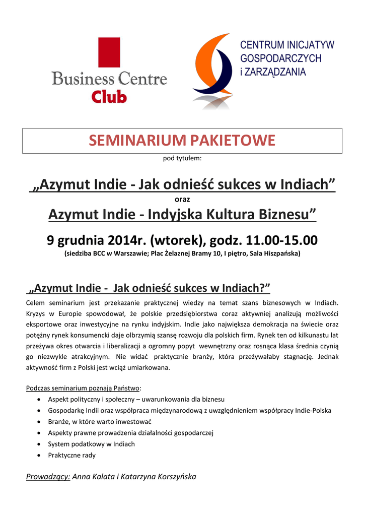 SEMINARIUM PAKIETOWE pod tytułem: „Azymut Indie - Jak odnieść sukces w Indiach” oraz Azymut Indie - Indyjska Kultura Biznesu” 9 grudnia 2014r. (wtorek), godz. 11.00-15.00 (siedziba BCC w Warszawie; Plac Żelaznej Bramy 10, I piętro, Sala Hiszpańska) „Azymut Indie - Jak odnieść sukces w Indiach?” Celem seminarium jest przekazanie praktycznej wiedzy na temat szans biznesowych w Indiach. Kryzys w Europie spowodował, że polskie przedsiębiorstwa coraz aktywniej analizują możliwości eksportowe oraz inwestycyjne na rynku indyjskim. Indie jako największa demokracja na świecie oraz potężny rynek konsumencki daje olbrzymią szansę rozwoju dla polskich firm. Rynek ten od kilkunastu lat przeżywa okres otwarcia i liberalizacji a ogromny popyt wewnętrzny oraz rosnąca klasa średnia czynią go niezwykle atrakcyjnym. Nie widać praktycznie branży, która przeżywałaby stagnację. Jednak aktywność firm z Polski jest wciąż umiarkowana. Podczas seminarium poznają Państwo: Aspekt polityczny i społeczny – uwarunkowania dla biznesu Gospodarkę Indii oraz współpraca międzynarodową z uwzględnieniem współpracy Indie-Polska Branże, w które warto inwestować Aspekty prawne prowadzenia działalności gospodarczej System podatkowy w Indiach Praktyczne rady Prowadzący: Anna Kalata i Katarzyna Korszyńska Azymut Indie - Indyjska Kultura Biznesu” Indie to kraj wielokulturowy i wielonarodowy. Często firmy budują plany biznesowej aktywności pomijając ten niesłychanie ważny aspekt. Skutkiem tego bywa brak efektywności w działaniu i w końcu rozczarowanie tak odległym, ale jakże atrakcyjnym biznesowo rynkiem. Zatem dobrze jest zapoznać się z podstawowymi zasadami, które niewątpliwie ułatwią pierwszy kontakt z Indiami. Poznacie Państwo jakie ABC spotkań biznesowych wziąć sobie do serca aby te spotkania przyniosły zamierzony efekt. Następnie otrzymacie Państwo wiedzę, jak ubrać się na biznesowe spotkanie, czy i jak przygotować wizytówki oraz kiedy je wręczyć. Rady dotyczące sposobu powitania, negocjacji i zwracania uwagi na dodatkowe elementy spotkań na pewno będą również przydatne w prowadzeniu biznesu. Z czym w Indiach kojarzy się „memento” i jak odnosić się na spotkaniach do nieoficjalnych rozmów oraz kiedy można przejść do negocjacji. Podczas seminarium poznają Państwo: Różnice międzykulturowe Etykietę w indyjskim biznesie Dowiędzą się Państwo również: Co oznacza w kontaktach biznesowych słowo „nie“ i „tak“? W jaki sposób prowadzić rozmowy biznesowe? Jak się ubierać na spotkania w Indiach? Jakich spraw nie poruszać w rozmowach? Prowadzący: Joanna Mazurkiewicz i Sławomir Pawlak Prowadzący: Anna Kalata Ekonomista, polityk, przedsiębiorca, doradca gospodarczy. Absolwentka Wydziału Nauk Ekonomicznych Uniwersytetu Warszawskiego oraz studiów doktoranckich w Szkole Głównej Handlowej. W 2002 roku została dyrektorem ds. rozwoju w Pocztowym Funduszu Leasingowym, następnie wiceprezesem Mazowieckiego Funduszu Poręczeń Kredytowych. Od 2004 roku pełniła funkcję Prezesa Zarządu Mazowieckiego Regionalnego Funduszu Pożyczkowego. Była doradcą Wicemarszałka Sejmu RP. Pełniła funkcję Ministra Pracy i Polityki Społecznej (lata 2006-2007). Była także przewodniczącą Komisji Trójstronnej ds. Społeczno-Gospodarczych oraz członkiem Komisji Nadzoru Finansowego. W 2007 roku została dyrektorem w Centrum Inicjatyw Gospodarczych i Zarządzania a następnie prezesem zarządu. Od 2008 roku jest wiceprezesem Indyjsko-Polskiej Izby Przemysłowo-Handlowej z siedzibą w Warszawie oraz honorowym prezesem Transazjatyckiej Izby Gospodarczej z siedzibą w Mumbai. Katarzyna Korszyńska Radca prawny, absolwentka Wydziału Prawa i Administracji na Uniwersytecie Jagiellońskim, z ponad 17-letnim doświadczeniem w zarządzaniu zarówno Działami Prawnymi jako In-house, jak i w międzynarodowych kancelariach ze znajomością branży retail, FMCG, poruszająca się płynnie w prawie spółek, pracy, gospodarczym, konsumenckim, autorskim (w tym znaki towarowe) oraz kontraktowym. Posiada bogate doświadczenie zawodowe, jakie zdobyła współpracując z takimi podmiotami jak m.in. Roedl & Partner, Empik Sp. z o.o., Grupa Kapitałowa NFI EMF S.A. oraz Kancelariami Prawnymi, m.in.: Noerr, RSM Hemmelrath (teraz Mazars), jak również Bank Śląski S.A. (ING Bank Śląski S.A.) - Centrala – Departament Zagraniczny (1991 -1993), Raiffeisen Centrobank S.A., Przedstawicielstwo w Katowicach (1993 – 1996), W swoim dorobku ma również prowadzenie negocjacji (m.in. warunków najmu komercyjnego jak i umów agencyjnych) i mediacji gospodarczych, oraz sprawowanie funkcji likwidatora w spółkach z branży retail. Ponadto: Sędzia Arbiter Sądu Arbitrażowego przy Krajowej Izbie Gospodarczej, Członek Konwentu BCC, niezależny ekspert prawny Indyjsko-Polskiej Izby Przemysłowo Handlowej (IPCCI) w Warszawie, Of-Counsel w Kancelarii Prawnej „Świeca i Wspólnicy” Sp. k. Sławomir Pawlak Z wykształcenia politolog. Specjalista ds. promocji w mediach oraz marketingu politycznego. Public relations zajmuje się od 1996 roku. Wcześniej pracował w dziennikach, miesięcznikach i agencji reklamowej. Współpracuje z Centrum inicjatyw Gospodarczych i Zarządzania jako wykładowca w zakresie etykiety biznesowej w kontaktach międzynarodowych. Obecnie Dyrektor ds. Rozwoju w Kalata Media. Koordynator biura prasowego Państwowej Komisji Wyborczej podczas wyborów do PE. Pełnił funkcję doradcy ds. informacji i p.o. rzecznika prasowego w Ministerstwie Pracy i Polityki Społecznej oraz zastępcy dyrektora Centrum Partnerstwa Społecznego DIALOG. Pomysłodawca i współtwórca portalu www.geopolityka.org. Komentator aktualnych wydarzeń międzynarodowych w mediach. Udział w misjach obserwacyjnych podczas wyborów w krajach Europy Wschodniej. Od 1997 roku członek Polskiego Stowarzyszenia Public Relations, w latach 2003-2006 jego wice