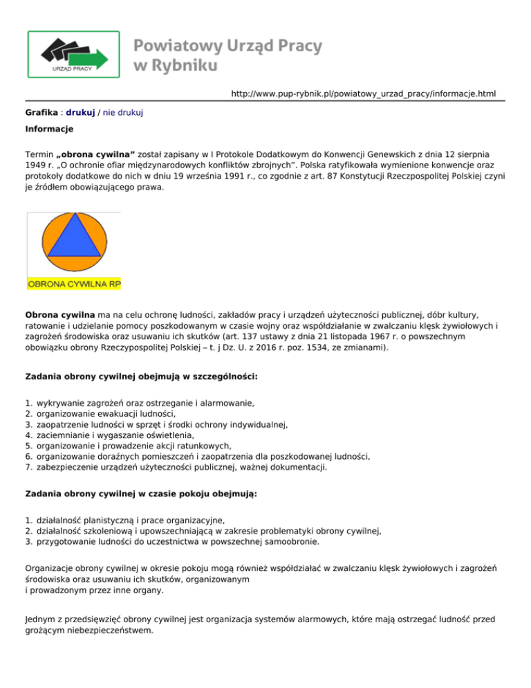 http://www.pup-rybnik.pl/powiatowy_urzad_pracy/informacje.html Grafika : drukuj / nie drukuj Informacje Termin „obrona cywilna” został zapisany w I Protokole Dodatkowym do Konwencji Genewskich z dnia 12 sierpnia 1949 r. „O ochronie ofiar międzynarodowych konfliktów zbrojnych”. Polska ratyfikowała wymienione konwencje oraz protokoły dodatkowe do nich w dniu 19 września 1991 r., co zgodnie z art. 87 Konstytucji Rzeczpospolitej Polskiej czyni je źródłem obowiązującego prawa. Obrona cywilna ma na celu ochronę ludności, zakładów pracy i urządzeń użyteczności publicznej, dóbr kultury, ratowanie i udzielanie pomocy poszkodowanym w czasie wojny oraz współdziałanie w zwalczaniu klęsk żywiołowych i zagrożeń środowiska oraz usuwaniu ich skutków (art. 137 ustawy z dnia 21 listopada 1967 r. o powszechnym obowiązku obrony Rzeczypospolitej Polskiej – t. j Dz. U. z 2016 r. poz. 1534, ze zmianami). Zadania obrony cywilnej obejmują w szczególności: 1. 2. 3. 4. 5. 6. 7. wykrywanie zagrożeń oraz ostrzeganie i alarmowanie, organizowanie ewakuacji ludności, zaopatrzenie ludności w sprzęt i środki ochrony indywidualnej, zaciemnianie i wygaszanie oświetlenia, organizowanie i prowadzenie akcji ratunkowych, organizowanie doraźnych pomieszczeń i zaopatrzenia dla poszkodowanej ludności, zabezpieczenie urządzeń użyteczności publicznej, ważnej dokumentacji. Zadania obrony cywilnej w czasie pokoju obejmują: 1. działalność planistyczną i prace organizacyjne, 2. działalność szkoleniową i upowszechniającą w zakresie problematyki obrony cywilnej, 3. przygotowanie ludności do uczestnictwa w powszechnej samoobronie. Organizacje obrony cywilnej w okresie pokoju mogą również współdziałać w zwalczaniu klęsk żywiołowych i zagrożeń środowiska oraz usuwaniu ich skutków, organizowanym i prowadzonym przez inne organy. Jednym z przedsięwzięć obrony cywilnej jest organizacja systemów alarmowych, które mają ostrzegać ludność przed grożącym niebezpieczeństwem. Do ogłaszania i odwoływania alarmów wykorzystuje się: syreny alarmowe, radiowęzły radiofonii przewodowej oraz zastępcze środki alarmowe (syreny ręczne, gongi, itp.) O ZAGROŻENIACH W INTERNECIE: 1. 2. 3. 4. 5. 6. www.rybnik.pl - Portal Miasta Rybnika www.imgw.pl - Prognoza Pogody www.czk.pl - Portal poświęcony Obronie Cywilnej www.ock.gov.pl - Serwis informacyjny - Obrona Cywilna Kraju http://www.katowice.uw.gov.pl/wdzbizk/raporty.html - Ostrzeżenia i raporty http://powietrze.katowice.wios.gov.pl/ - Mapa monitoringu jakości powietrza SYGNAŁY ALARMOWE: KOMUNIKATY OSTRZEGAWCZE W przypadku alarmu proszę ukryć się w najbliższym schronie. W razie jego braku, w takim miejscu, które może nas zabezpieczyć przed skutkami uderzeń. Uwaga!!! Sygnały alarmowe ogłasza się w celu powszechnego uprzedzenia o grożącym bezpośrednio niebezpieczeństwie. ZACHOWANIE SIĘ LUDNOŚCI PODCZAS KATASTROFY Jeśli usłyszysz alarm, w sytuacji zagrożenia służby na pewno będą próbować Ci pomóc. Jednak Ty sam też musisz być przygotowany. Nie zawsze służby ratownicze będą w stanie dotrzeć do Ciebie natychmiast po katastrofie. Dlatego należy wiedzieć, co robić w przypadku wystąpienia zagrożenia, jak przygotować się do ewakuacji, gdzie szukać schronienia. W jaki sposób możesz ograniczyć skutki katastrofy, jak zabezpieczyć swoje dobra materialne, zwierzęta. CO NALEŻY ZROBIĆ ? Na początku należy ustalić, co Tobie i Twojej rodzinie zagraża. W tym celu: 1. Sprawdź, czy miejsce, w którym zamieszkujesz narażony jest na jakiekolwiek zagrożenia. Wiadomości na ten temat szukaj we właściwym terytorialnie urzędzie gminy lub miasta. 2. Dowiedz się w "komórce organizacyjnej urzędu zajmującej się sprawami obrony ludności", w jakiej strefie zagrożenia znajduje się twój dom i jakiego rodzaju są to zagrożenia. 3. Poznaj rodzaje alarmów, sygnałów alarmowych, sposoby ich ogłaszania i odwoływania oraz naucz się zasad zachowania się w przypadku ich ogłaszania. 4. Zaopatrz się w instrukcje, poradniki i stosuj się do zaleceń w nich zawartych. Będzie to podstawą do przygotowania się i sprawdzenia własnych możliwości do przetrwania w okresie pierwszych dni kataklizmu.