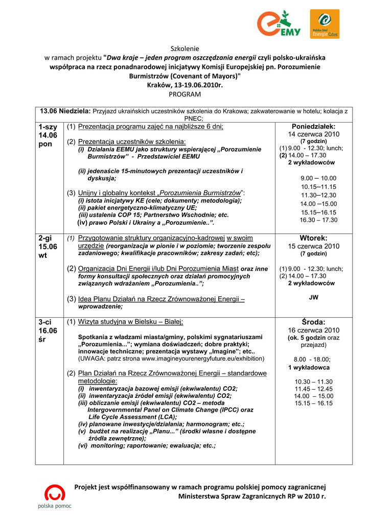 Szkolenie w ramach projektu "Dwa kraje – jeden program oszczędzania energii czyli polsko-ukraińska współpraca na rzecz ponadnarodowej inicjatywy Komisji Europejskiej pn. Porozumienie Burmistrzów (Covenant of Mayors)" Kraków, 13-19.06.2010r. PROGRAM 13.06 Niedziela: Przyjazd ukraińskich uczestników szkolenia do Krakowa; zakwaterowanie w hotelu; kolacja z PNEC; 1-szy 14.06 pon (1) Prezentacja programu zajęć na najbliŜsze 6 dni; (2) Prezentacja uczestników szkolenia: (i) Działania EEMU jako struktury wspierającej „Porozumienie Burmistrzów” - Przedstawiciel EEMU (ii) jedenaście 15-minutowych prezentacji uczestników i dyskusja; (3) Unijny i globalny kontekst „Porozumienia Burmistrzów”: (i) istota inicjatywy KE (cele; dokumenty; metodologia); (ii) pakiet energetyczno-klimatyczny UE; (iii) ustalenia COP 15; Partnerstwo Wschodnie; etc. (iv) prawo Polski i Ukrainy a „Porozumienie..”. 2-gi 15.06 wt (1) Przygotowanie struktury organizacyjno-kadrowej w swoim urzędzie (reorganizacja w pionie i w poziomie; tworzenie zespołu zadaniowego; kwalifikacje pracowników; zakresy zadań; etc); (2) Organizacja Dni Energii i/lub Dni Porozumienia Miast oraz inne formy konsultacji społecznych oraz działań promocyjnych związanych wdraŜaniem „Porozumienia..”; (3) Idea Planu Działań na Rzecz ZrównowaŜonej Energii – Poniedziałek: 14 czerwca 2010 (7 godzin) (1) 9.00 - 12.30; lunch; (2) 14.00 – 17.30 2 wykładowców 9.00 – 10.00 10.15–11.15 11.30–12.30 14.00 –15.00 15.15–16.15 16.30 – 17.30 Wtorek: 15 czerwca 2010 (7 godzin) (1) 9.00 - 12.30; lunch; (2) 14.00 – 17.30 2 wykładowców JW wprowadzenie; 3-ci 16.06 śr (1) Wizyta studyjna w Bielsku – Białej; Środa: 16 czerwca 2010 Spotkania z władzami miasta/gminy, polskimi sygnatariuszami „Porozumienia...”; wymiana doświadczeń; dobre praktyki; innowacje techniczne; prezentacja wystawy „Imagine”; etc.. (UWAGA: patrz strona www.imagineyourenergyfuture.eu/exhibition) (2) Plan Działań na Rzecz ZrównowaŜonej Energii – standardowe metodologie: (i) inwentaryzacja bazowej emisji (ekwiwalentu) CO2; (ii) inwentaryzacja źródeł emisji (ekwiwalentu) CO2; (iii) obliczanie emisji (ekwiwalentu) CO2 – metoda Intergovernmental Panel on Climate Change (IPCC) oraz Life Cycle Assessment (LCA); (iv) planowane inwestycje/działania; harmonogram; etc.; (v) budŜet na realizację „Planu...” (środki własne i dostępne źródła zewnętrzne); (vi) monitoring; raportowanie; ewaluacja; etc.; (ok. 5 godzin oraz przejazd) 8.00 - 18.00; 1 wykładowca 10.30 – 11.30 11.45 – 12.45 14.00 – 15.00 15.15 – 16.15 Projekt jest współfinansowany w ramach programu polskiej pomocy zagranicznej Ministerstwa Spraw Zagranicznych RP w 2010 r. 4-ty 17.06 czw (1) Udział w konferencji: POLSKIE MIASTA I GMINY DLA KLIMATU – LIGA MISTRZÓW ENERGII ODNAWIALNEJ I „POROZUMIENIE BURMISTRZÓW” (UWAGA-wstępna wersja programu konferencji w załączeniu) (2) Wizyta studyjna w Niepołomicach; Spotkania z władzami miasta/gminy, polskimi sygnatariuszami „Porozumienia...”; wymiana doświadczeń; dobre praktyki; prezentacja innowacji technicznych, etc. 5-ty 18.06 pt (1) Udział w konferencji 10.00 - 18.00; 1 wykładowca 10.00 – 11.30 12.00 – 13.30 14.30 – 15.30 15.45 – 16.45 17.00 – 18.00 Piątek: 18 czerwca 2010 POLSKIE MIASTA I GMINY DLA KLIMATU – LIGA MISTRZÓW ENERGII ODNAWIALNEJ I „POROZUMIENIE BURMISTRZÓW” (2) Omówienie polskich i europejskich przykładów „Planów Działań....” – dobre praktyki; 6-ty 19.06 sob Czwartek: 17 czerwca 2010 (1) Podsumowanie szkolenia: (i) dyskusja; ankiety ewaluacyjne; etc. (2) Omówienie kolejnych etapów projektu, a w szczególności: (i) „zadanie domowe” przedstawicieli miast: rozpoczęcie wdraŜania „Porozumienia...” w swoich urzędach oraz promocja „Porozumienia...” wśród interesariuszy; (ii) „zadanie domowe” EEMU: elektroniczna kampania informacyjna; (iii) seminaria we Lwowie i Khersonie: jak zaprezentować rezultaty „zadania domowego”; (iv) Dni Energii we Lwowie: uszczegółowienie scenariusza i zadań przydzielonych współorganizatorom, tj. PNEC, EEMU, władze miasta - gospodarza; organizacje pozarządowe; szkoły, organizacje kultury, etc. (v) omówienie załoŜeń realizacji „obwoźnej wystawy”, promującej polskich i ukraińskich sygnatariuszy „Porozumienia...” oraz sposobu jej upowszechniania przez uczestników szkolenia; (vi) rozdanie certyfikatów i pamiątkowych koszulek. 8.00 - 18.00; 4 wykładowców 9.30 – 11.15 11.45 – 13.00 14.00 – 17.00 (wizyta w obiektach) Sobota: 19 czerwca 2010 (ok. 5 godzin) 9.00 – 14.00; lunch 2 przedstawiciele PNEC 9.00 – 10.00 10.15 – 11.15 11.30 – 12.30 12.45 – 13.45 19.06 Sobota (ok. 15.00): Wyjazd ukraińskich uczestników szkolenia do Lwowa. Projekt jest współfinansowany w ramach programu polskiej pomocy zagranicznej Ministerstwa Spraw Zagranicznych RP w 2010 r.