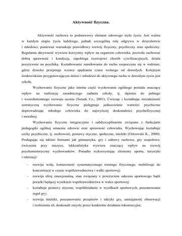 Aktywność fizyczna. Aktywność ruchowa to podstawowy element zdrowego stylu życia. Jest ważna w każdym etapie życia ludzkiego, jednak szczególną rolę odgrywa w dzieciństwie i młodości, ponieważ warunkuje prawidłowy rozwój fizyczny, psychiczny oraz społeczny. Regularna aktywność wywiera korzystny wpływ na organizm człowieka, pozwala zachować dobrą sprawność i kondycję, zapobiega rozwojowi chorób cywilizacyjnych, działa pozytywnie na psychikę. Kształtowanie zamiłowania do ruchu rozpoczyna się w rodzinie, gdzie dziecko przejmuje wzorce spędzania czasu wolnego od dorosłych. Kolejnym środowiskiem przygotowującym dzieci i młodzież do aktywnego ruchu w dorosłym życiu jest szkoła. Wychowanie fizyczne jako istotna część wychowania ogólnego posiada znaczący wpływ na realizację zasadniczego zadania szkoły, tj. dążenia do pełnego i wszechstronnego rozwoju ucznia (Sienek Cz., 2001). Ćwicząc i kształtując niezależność somatyczną wychowanie doprowadzając młodego fizyczne człowieka pielęgnuje do jednocześnie najwyższej wartości doskonałości psychiczne psychofizycznej i moralnej. Wychowanie fizyczne integracyjnie i subdyscyplinarnie związane z funkcjami pedagogiki ogólnej umacnia zdrowie oraz sprawność człowieka. Wychowując kształtuje cechy psychiczne, tj. osobowość, postawy etyczne, społeczne, intelekt (Ostrowski K., 2000). Posługując się takimi formami jak gimnastyka, gry i zabawy ruchowe, gry zespołowe, ćwiczenia przy muzyce, lekkoatletyka wywiera znaczący wpływ na rozwój psychomotoryczny wychowanków. Ponadto wykorzystując elementy sportu, turystyki i rekreacji: - rozwija wolę, konieczność systematycznego treningu fizycznego, mobilizuje do koncentracji w czasie współzawodnictwa i walki sportowej; - rozwija sferę emocjonalną, stan związany z przeżyciem sukcesu sportowego bądź porażki będącej wynikiem współzawodnictwa w walce sportowej: - kształtuje postawy etyczne, współdziałanie w wysiłkach sportowych, poszanowanie reguł gry; - rozwija intelekt, poszanowanie przepisów i taktyki gry, umiejętność obserwacji i rozłożenia sił, doskonali zmysły przez konkretne działania lokomocyjne; - współdziała z wychowaniem estetycznym, kształtuje piękno ciała ludzkiego i kompozycje ruchów w różnych dyscyplinach sportu (Ostrowski K., 2000). W świadomości społecznej wychowanie fizyczne spełnia rolę dualistyczną. Z jednej strony stanowi istotny składnik procesu ogólnego wychowania, którego celem jest wszechstronnie rozwinięty człowiek. Z drugiej strony jest elementem działania, czynnikiem kształtującym. Stanowi ono fundament pożądanej i prawidłowej funkcji fizjologicznej organizmu, adaptuje do wysiłków i warunków środowiskowych budując podstawy form aktywności fizycznej człowieka. Wychowanie fizyczne jako element działania dąży do możliwie pełnego wykorzystania czynników i środków pozostających do dyspozycji wychowawcy oraz podopiecznych. Spełniając rolę adaptacyjną, stymulacyjną i korekcyjnodoprowadza kompensacyjną do pełnej realizacji celów w stosunku do każdej jednostki (Ostrowski K., 2000). Intelektualizacja w wychowaniu fizycznym wiąże się z pojęciem nowoczesności w szkolnym wychowaniu fizycznym. Według Henryka Grabowskiego tylko postęp, rozumiany jako dostosowanie działań bieżących do wymagań przeszłości, z równoczesnym wykorzystaniem doświadczeń wyniesionych z przeszłości, można uznać za system nowoczesności (Grabowski H., 1999). Według Grabowskiego kryterium efektywności procesu dydaktyczno – wychowawczego nie jest to, co uczeń robi w szkole, lecz jak żyje po jej ukończeniu. „W przypadku edukacji fizycznej oznacza to priorytet dla kształtowania systemu wartości, nawyków, zamiłowań, przyzwyczajeń i umiejętności służących do odnawiania, podtrzymywania i pomnażania zdrowia, sprawności fizycznej i urody ciała w toku realizacji zadań związanych z zaspokajaniem doraźnych potrzeb dzieci i młodzieży” (Grabowski H., 1999, s. 133). Zdaniem Macieja Demela nowoczesność w szkolnym wychowaniu fizycznym powinna być zgodna z trendami rozwojowymi systemu oświaty, kryjącymi się pod hasłami: - edukacja permanentna, - prospekcja, - autoedukacja, - intelektualizacja, - humanizacja, - indywidualizacja (Demel M., 1973). Uwzględniając zasady edukacji permanentnej, zwanej też ustawiczną, kształcenie to ciągłe podnoszenie kwalifikacji, modernizacja posiadanej wiedzy i umiejętności, odświeżanie, nadążanie za postępem. Tym samym okres przebywania w szkole (podstawowej, gimnazjalnej, ponadgimnazjalnej czy wyższej) nie stanowi zamkniętej, odizolowanej całości. Jest to okres, który powinien zostać wykorzystany na wyposażenie młodego człowieka w dyspozycje decydujące o gotowości i zdolności do dalszego kształcenia się. Edukacja szkolna ma więc wyposażyć ucznia w środki, które pozwolą mu radzić sobie ze stawianymi mu przez życie wymaganiami. Szczególną rolę w tym procesie odgrywa edukacja fizyczna, zwłaszcza w zakresie realizacji celów zdrowotnych oraz w przygotowaniu uczniów do podnoszenia jakości życia aż do późnej starości. Jej zadaniem jest również intelektualne, sprawnościowe i emocjonalne przygotowanie młodzieży do uczestnictwa w rekreacji fizycznej. Bibliografia: 1. Sieniek Cz.: 2001. Planowanie pracy nauczyciela wychowania fizycznego w klasach I – III gimnazjum. Pracownia Wydawnicza „HELVETICA”, Starachowice. 2. Ostrowski K., 2000.: Program Nauczania Wychowania Fizycznego dla klas I – III gimnazjum. Wyd. eMPi2, Poznań 2000. 3. Bielski J., 1996.: Życie jest ruchem, Agencja Promo-Lider, Warszawa. 4. Nowosielski – Sas K., 2003.: Wychowanie do aktywności fizycznej, AWF w Katowicach. 5. Demel M., 1973r, Szkice krytyczne o kulturze fizycznej. Warszawa. Wydawnictwo naukowe PWN. Opracowała: Justyna Wróblewska