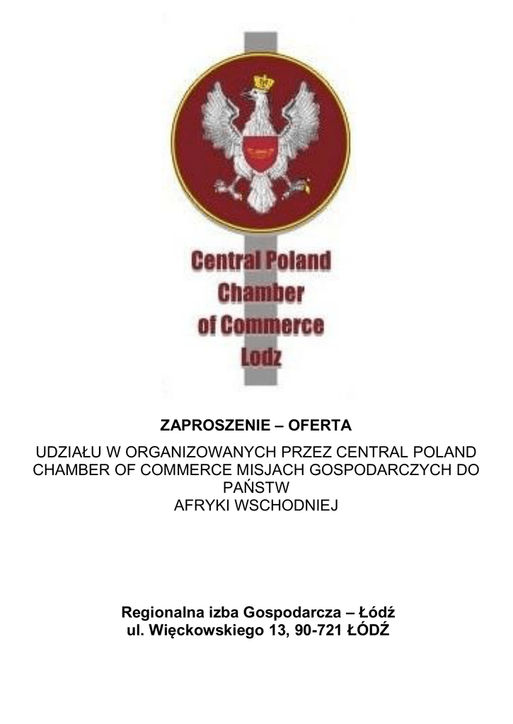 ZAPROSZENIE – OFERTA UDZIAŁU W ORGANIZOWANYCH PRZEZ CENTRAL POLAND CHAMBER OF COMMERCE MISJACH GOSPODARCZYCH DO PAŃSTW AFRYKI WSCHODNIEJ Regionalna izba Gospodarcza – Łódź ul. Więckowskiego 13, 90-721 ŁÓDŹ ZAPROSZENIE – OFERTA UDZIAŁU W ORGANIZOWANYCH PRZEZ CENTRAL POLAND CHAMBER OF COMMERCE MISJACH GOSPODARCZYCH DO PAŃSTW AFRYKI WSCHODNIEJ Central Poland Chamber of Commerce zaprasza do udziału w misjach gospodarczych do państw Afryki Wschodniej - Kenii, Ugandy i Rwandy. TERMINY MISJI Misje odbędą się w następujących terminach:  KENIA 16 - 17 czerwca 2014 roku.  UGANDA 18 czerwca 2014 roku  RWANDA 19 - 20 czerwca 2014 roku  CEL MISJI I ICH ADRESACI Celem misji jest nawiązanie lub poszerzenie kontaktów gospodarczych przedsiębiorstw polskich oraz innych z terenu UE z rynkami Afryki Wschodniej. Oferta skierowana jest do wszystkich zainteresowanych współpracą z Afryką firm - w tym w szczególności reprezentujących następujące branże:  Górnictwo, Geologia i Przemysł Maszyn Górniczych  Rolnictwo i Przemysł Maszyn Rolniczych  Ochrona Środowiska  Nauka i Dydaktyka  Informatyka  Usługi Finansowe i Banki Wymienione wyżej branże zostały przez wyselekcjonowane poprzez nasze badania rynku. Niemniej, w przypadku deklaracji uczestnictwa przedsiębiorstw z innych branż, jesteśmy gotowi zapewnić także atrakcyjne spotkania handlowe i właściwych partnerów do rozmów. USŁUGI DOSTARCZANE W RAMACH OFERTY PRZEZ ORGANIZATORA W ramach niniejszej oferty zapewniamy:  Spotkania z kontrahentami zainteresowanymi współpracą z Polską w ramach organizowanych spotkań B2B  Spotkania z lokalnymi władzami odwiedzanych państw i ich administracją centralną i samorządową w ramach organizowanych spotkań B2G  Spotkanie z Ambasadorem RP odpowiedzialnym za polskie kontakty z odwiedzanymi państwami.  Własną stronę w wydawanym na potrzeby misji w języku angielskim folderze, prezentującym jej uczestników  Zorganizowaną logistykę pobytu  Doradztwo i specjalistyczną pomoc tłumaczeniową w rozmowach biznesowych  Wszelką inną, indywidualnie wycenianą i płatną, dodatkową pomoc w kontaktach biznesowych w odwiedzanych państwach.  Pomoc w uzyskaniu wiz wjazdowych do odwiedzanych państw.  Transfery z i na lotniska ( dotyczy uczestników którzy wykupią bilety lotnicze zgodnie z przesłanymi przez organizatora planami lotów)  Podstawowe ubezpieczenie w czasie pobytu na misji Uczestnicy mogą uczestniczyć w jednej misji lub w następujących po sobie 2 lub 3 misjach – uzyskując w tym przypadku, atrakcyjne upusty cenowe. Koszty biletów lotniczych i hoteli, uczestnicy pokrywają we własnym zakresie. Zgłoszenia uczestnictwa w poszczególnych misjach, przyjmowane są poprzez stronę www.polandafrica.pl gdzie w zakładce ZGŁOSZENIE NA INNE WYDARZENIA dostępnej po zarejestrowaniu się prosimy wybrać właściwe misje, wypełnić zgłoszenie i wysłać. W wyniku wysłania zgłoszenia uczestnictwa, otrzymają Państwo fakturę PRO-FORMA, którą prosimy opłacić w terminie 3 dni licząc od dnia otrzymania pocztą e-mail wspomnianej wyżej faktury PRO - FORMA. Właściwa faktura VAT, zostanie Państwu wystawiona i przesłana pocztą w terminie 7 dni, licząc od dnia wpływu całkowitej zapłaty na nasze konto. Wpisy na listę uczestników dokonywane są przez nas w kolejności zgodnej z datami wpływu zapłaty na nasze konto. Ilość miejsc jest ograniczona. Osoby zainteresowane zapraszamy dodatkowo do udziału w dniach 21 i 22 czerwca w programie kulturowo - poznawczym i turystycznym w Rwandzie:  Zwiedzanie „VULCANOES PARK” - 21 czerwca 2014 - „International Gorilla naming Day”  Zwiedzanie „NYUNGWE NATIONAL PARK” lub „PARK AKAGERA” – 22 czerwca 2014 r. Koszt całkowity programu dodatkowego, prześlemy osobom zainteresowanym do końca maja 2014 r. a zapłata z tytułu w nim uczestnictwa będzie płatna w Euro na miejscu - u afrykańskiego operatora. Wszelkich wyjaśnień i dodatkowych informacji udziela: Pani Francina Umutesi - International Executive Tel: +48 600 98 2979; email: [email protected] Poniżej znajdą Państwo linki o gospodarkach państw objętych misjami. http://nairobi.msz.gov.pl/pl/wspolpraca_obustronna/wspolpraca_gospodarcza/ http://www.kenyachamber.co.ke/ http://www.eastafricanchamber.org/ http://www.chamberuganda.com/ http://www.rdb.rw/ http://www.rwandatourism.com/